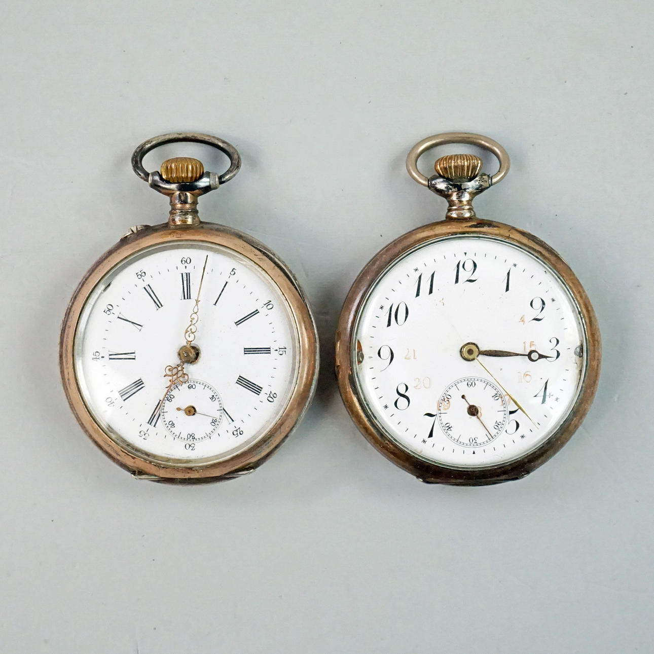 1 pocket watch, case and inner cover in silver 800, dial with Roman numerals, inner cover marked Ancre Ligne Droite, 15 rubies, Sprial Breguet Diameter approx. 5 cm. 1 pocket watch, dial with Arabic numerals, case in silver 800, inner cover in metal. Case no 728082, serial no 710138. Diameter approx. 5 cm Both pocket watches with outer shell in white metal. Condition Normal wear and tear, the pocket watch with Arabic numerals works in tests, has damage and retouches on the dial Pocket watch with roman numerals does not work Functional warranty cannot be provided, not fully reviewed. 13372