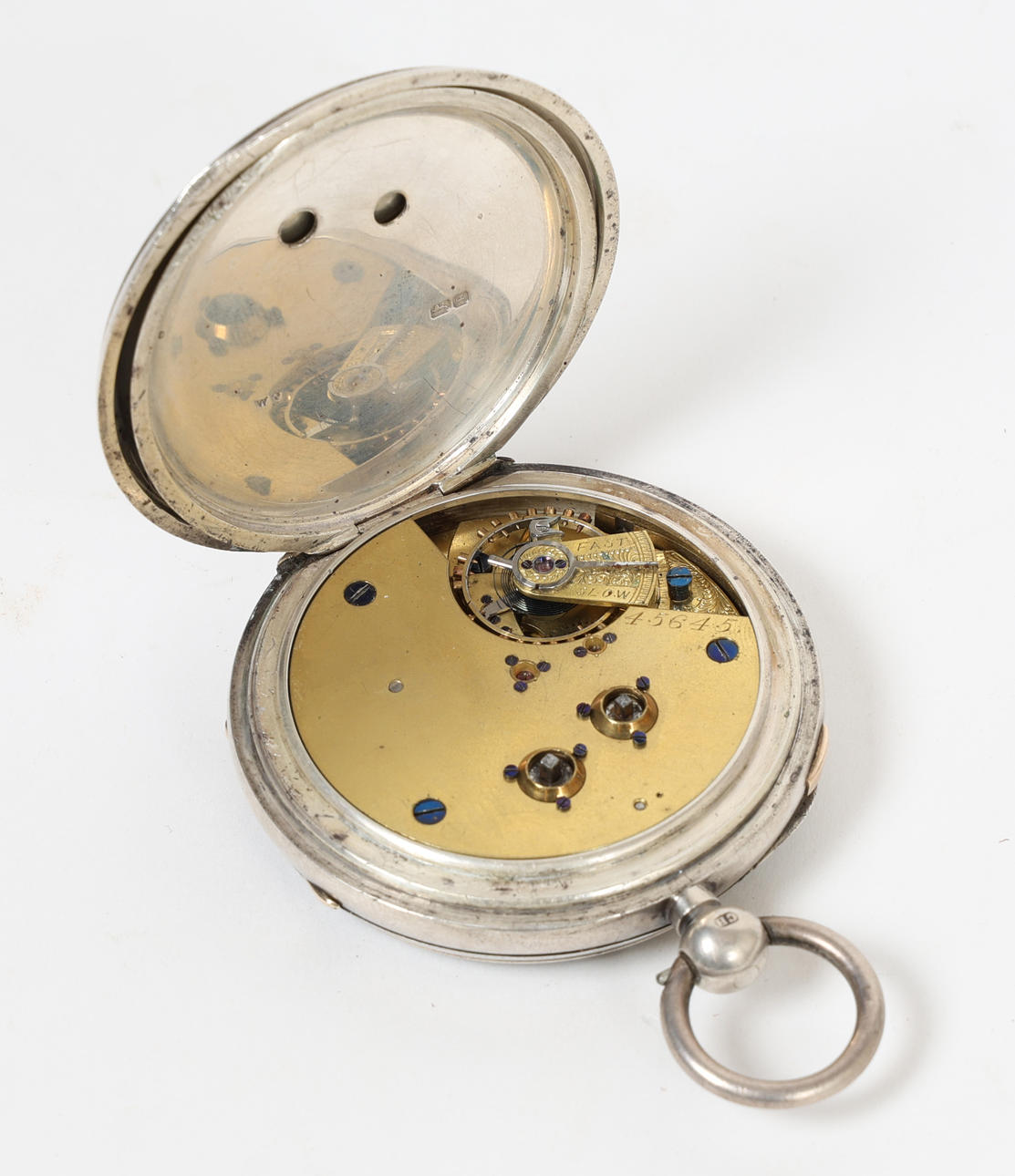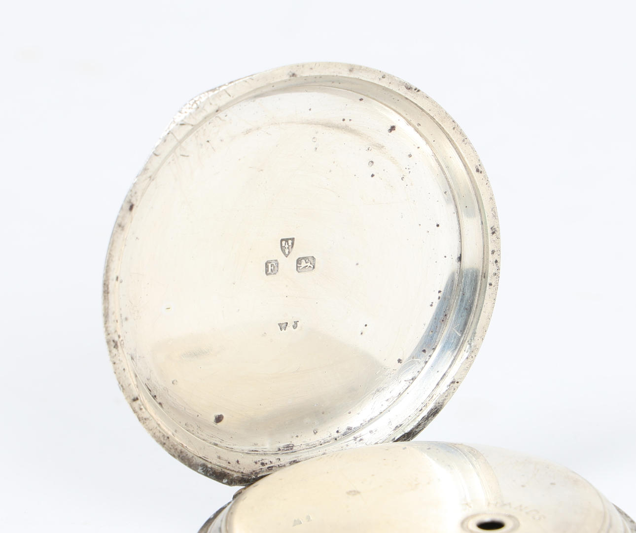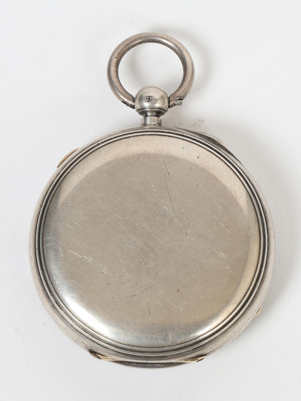 1.A VICTORIAN SILVER CASED CENTRE SECONDS CHRONOGRAPH POCKET WATCH. The case Chester 1889, maker the white dial inscribed "CENTRE SECONDS CHRONOGRAPH", with Roman numerals and outer scale from 25-300, key wound, the case 57mm diameter. Condition Watch has no key present and has not been tested, Case with surface scratches and marks.31727 2.A silver spider cage pocket watch marked Burman, London, circa 1800. 51 mm. Case and outer case in silver with London stamps. Condition Badges, damage wear, seconds indicator and towing wrench are missing.213618