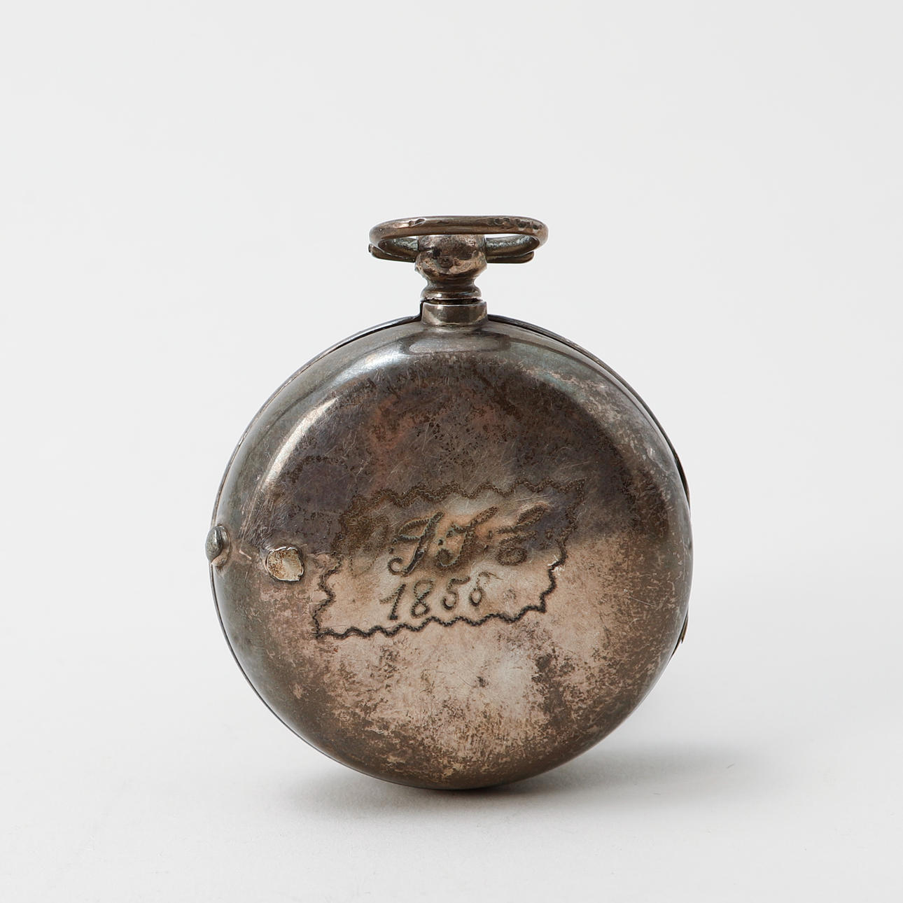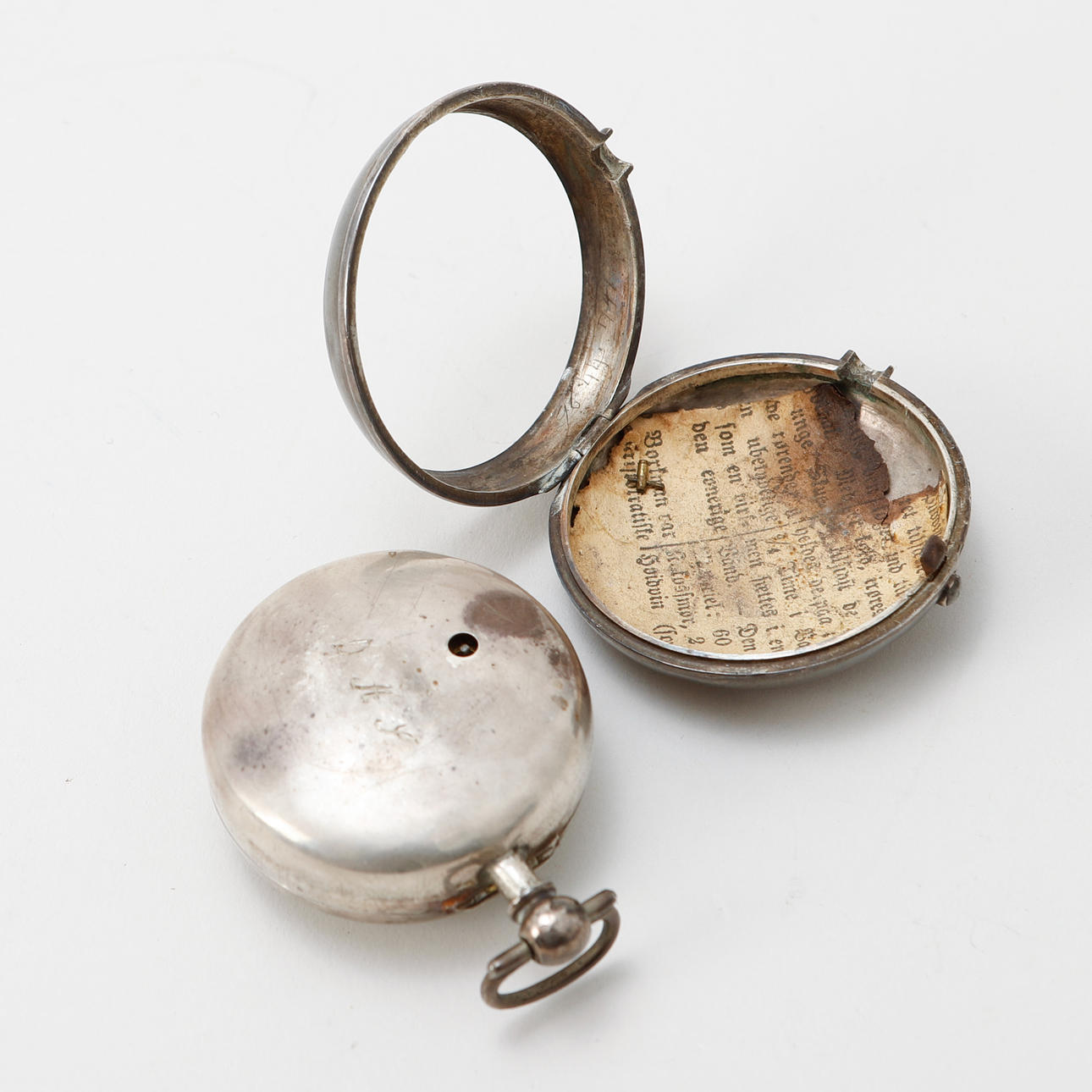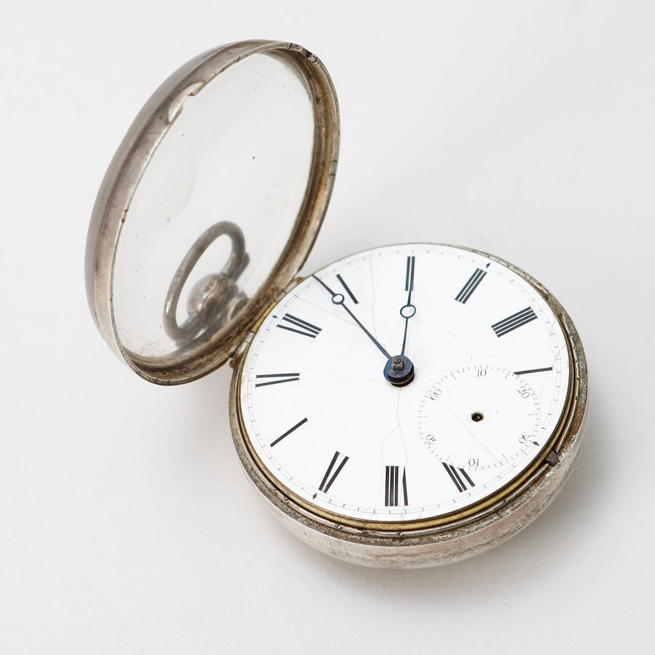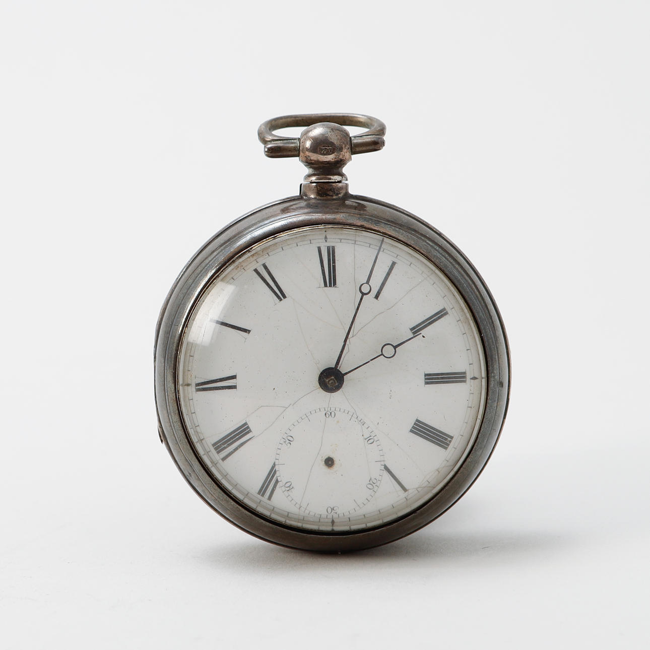 1.A VICTORIAN SILVER CASED CENTRE SECONDS CHRONOGRAPH POCKET WATCH. The case Chester 1889, maker the white dial inscribed "CENTRE SECONDS CHRONOGRAPH", with Roman numerals and outer scale from 25-300, key wound, the case 57mm diameter. Condition Watch has no key present and has not been tested, Case with surface scratches and marks.31727 2.A silver spider cage pocket watch marked Burman, London, circa 1800. 51 mm. Case and outer case in silver with London stamps. Condition Badges, damage wear, seconds indicator and towing wrench are missing.213618