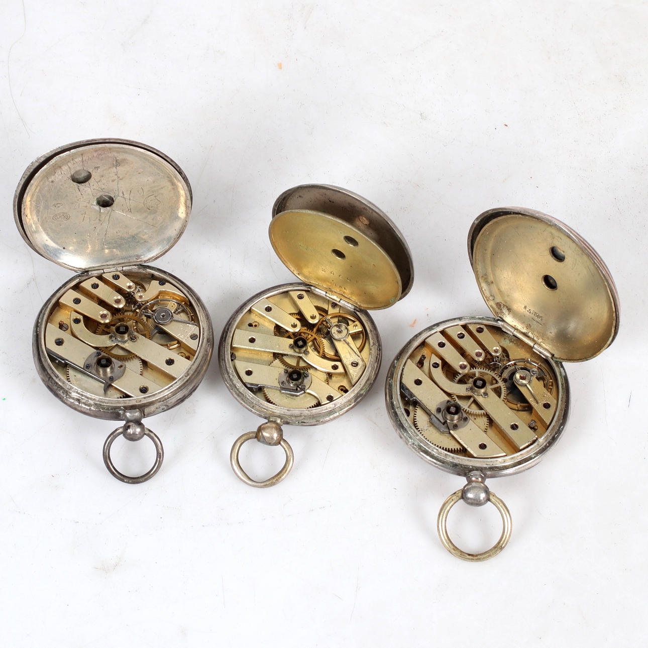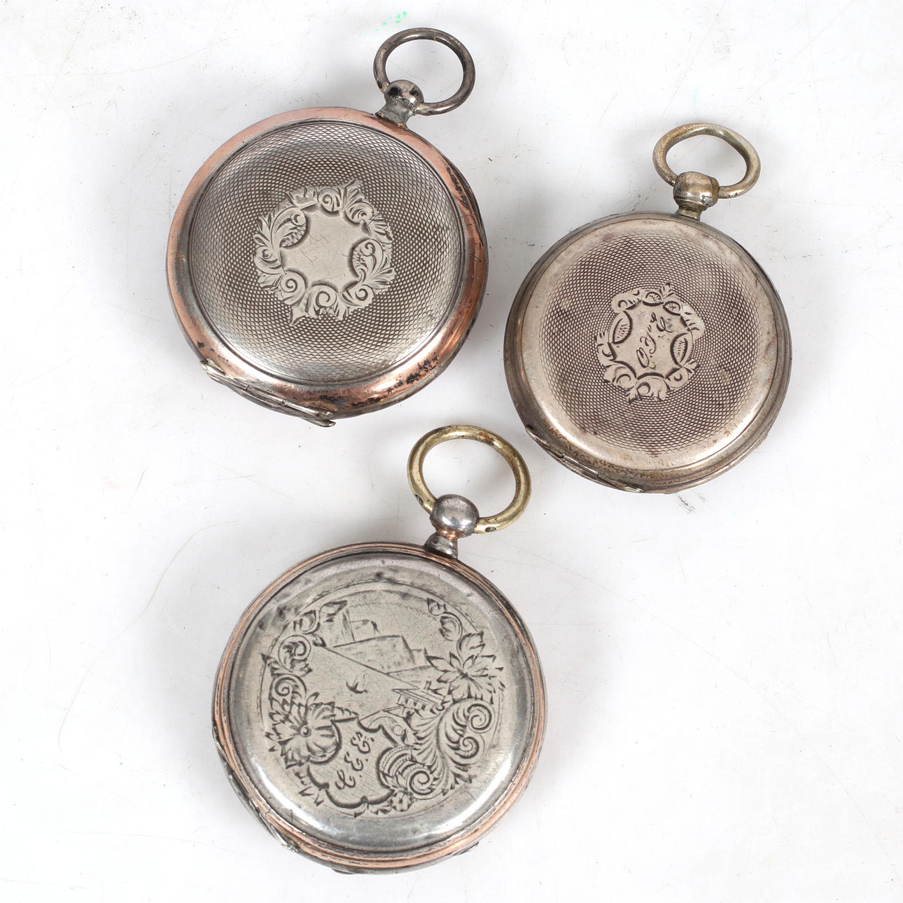 Pocket watch, case marked “Cylinder”, diameter 45 mm, weight 62 grams. Pocket watch, case marked “Chometere - Contere Pirot, Ancre Ligne Droite Spiral Breguet 23 rubis “, diameter 50 mm, weight 76 grams. Pocket watch, white metal, “Cylindre Ancre Rubis”, diameter 47 mm. Condition Wear and tear. Chips on watch faces and missing pointer. 202503