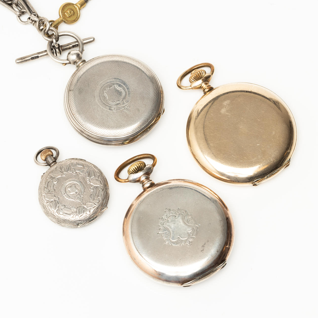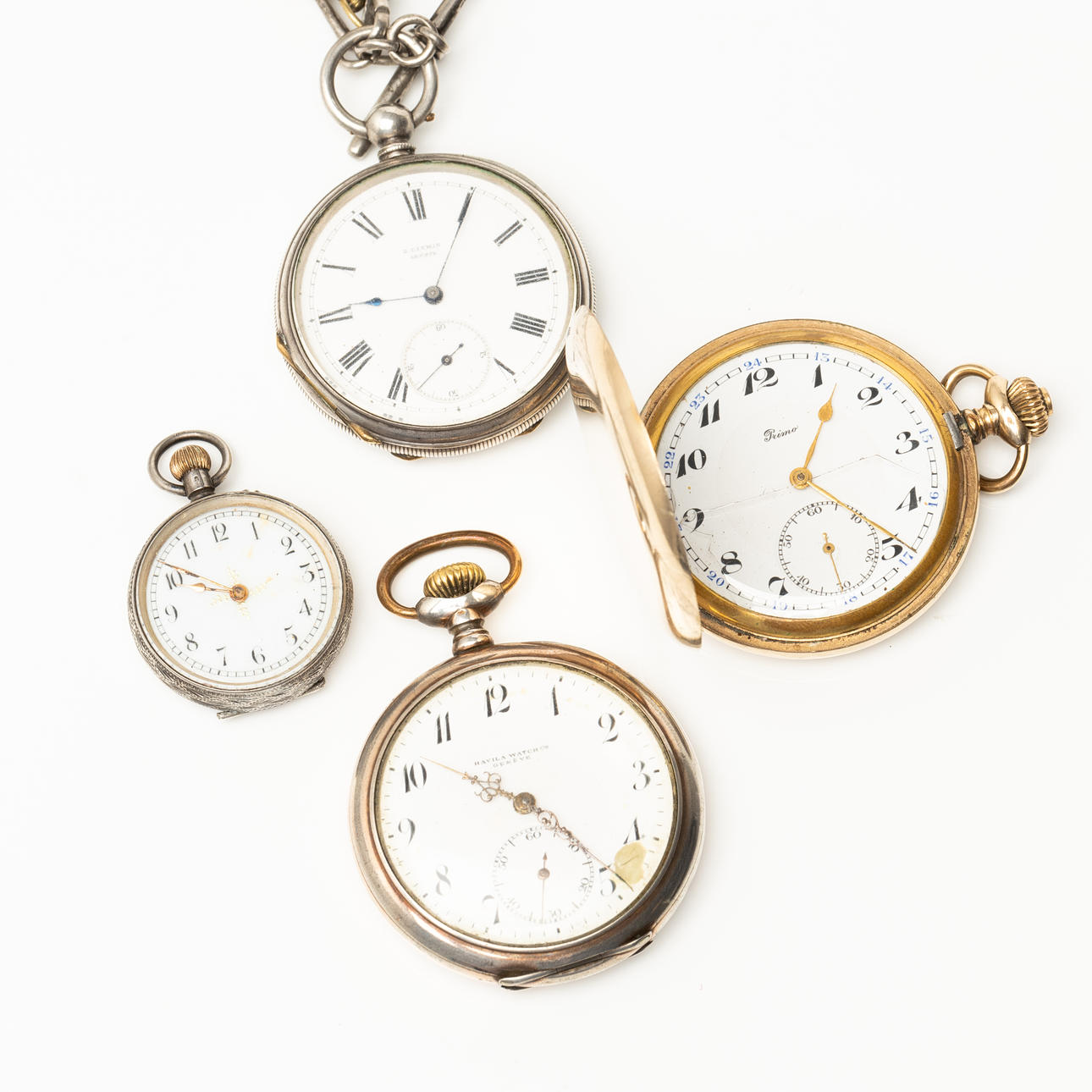 Pocket watch, Switzerland, sterling silver case, Bienne, diameter excl. crown approx. 32 mm. Pocket watch, Primo, gilded case, diameter excl. crown approx. 52 mm. Pocket watch, Havila Watch Company, case in silver, Ancre de Haute Précision, Germany, diameter excl. crown approx. 51 mm. Pocket watch L Liomin with key and chain and pendant, case, chain and pendant in silver, diameter excl. crown approx. 47 mm. Chain weight approx. 39.9 g. Condition report Wear and tear, marks, scratches,Primon with damaged glass, The Liomin clock was working at the time of cataloguing. No functional warranty is provided. 306271