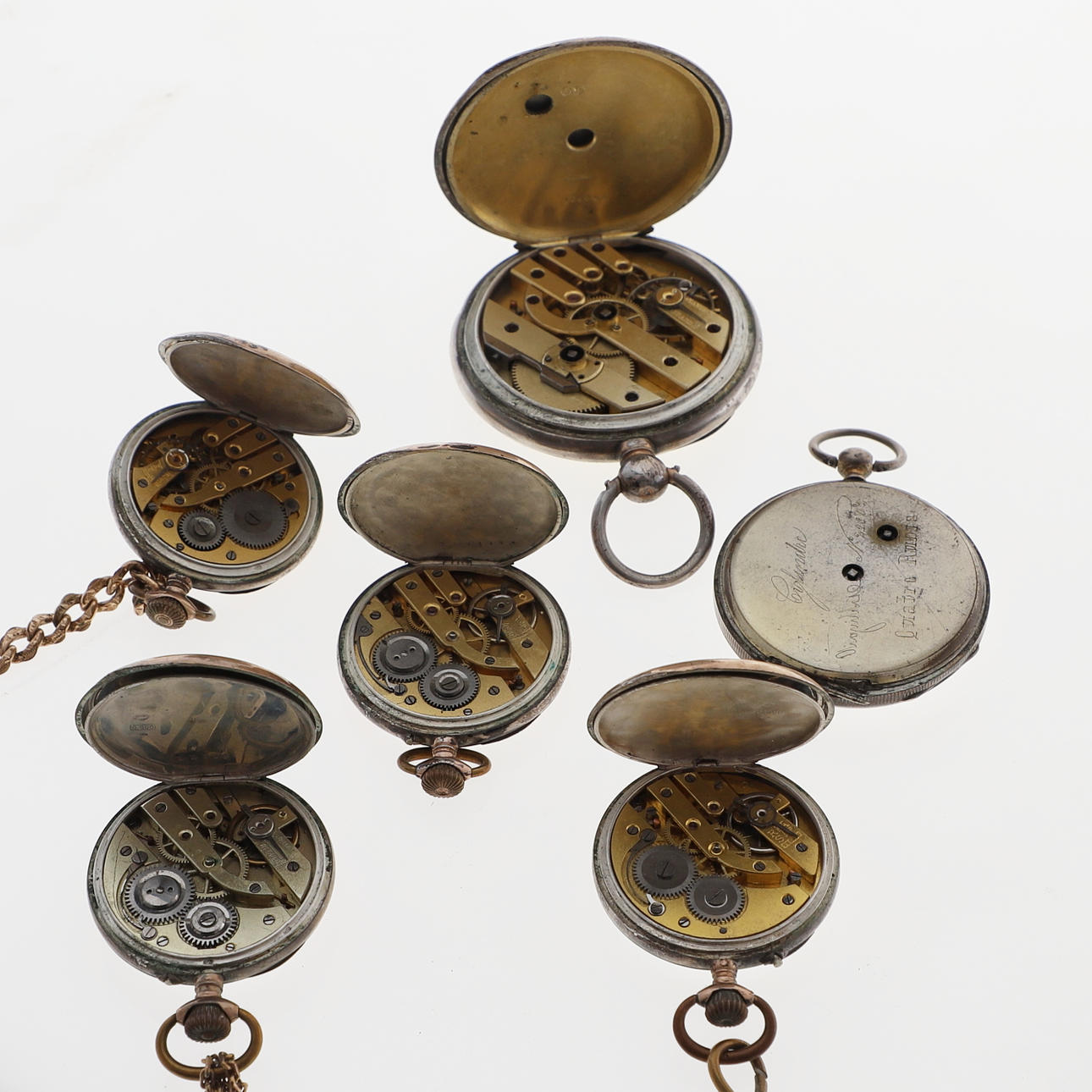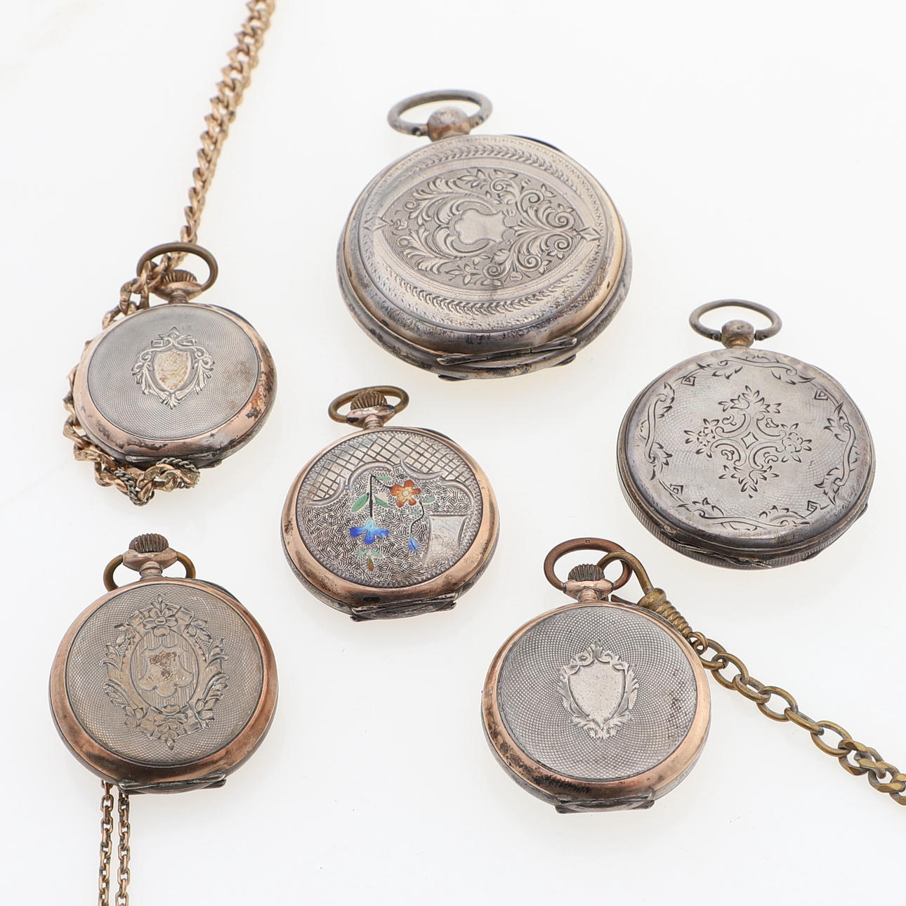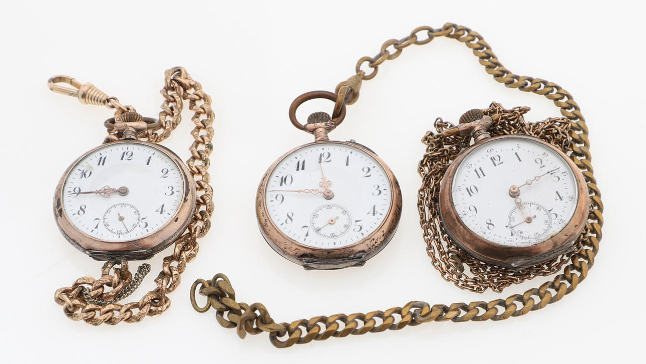 4 pcs granny watches, with inner & outer case in silver. 2 key pullers, with outer case in silver. Width about 35-51 mm. Chains in base metal. Total weight incl. chains about 305 grams. Condition All with defective clockwork. Damage, wear, missing parts. Keys missing. 125803
