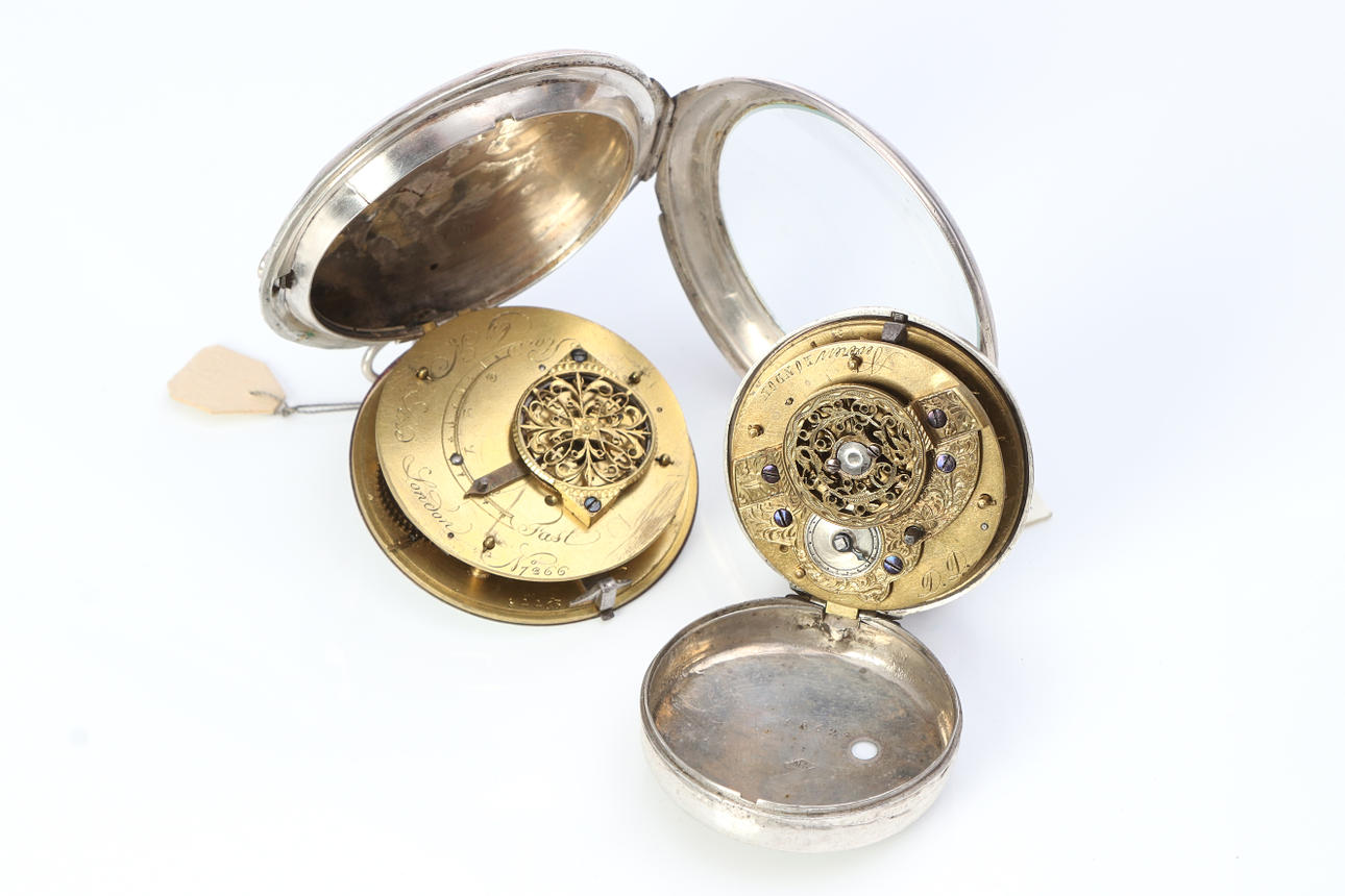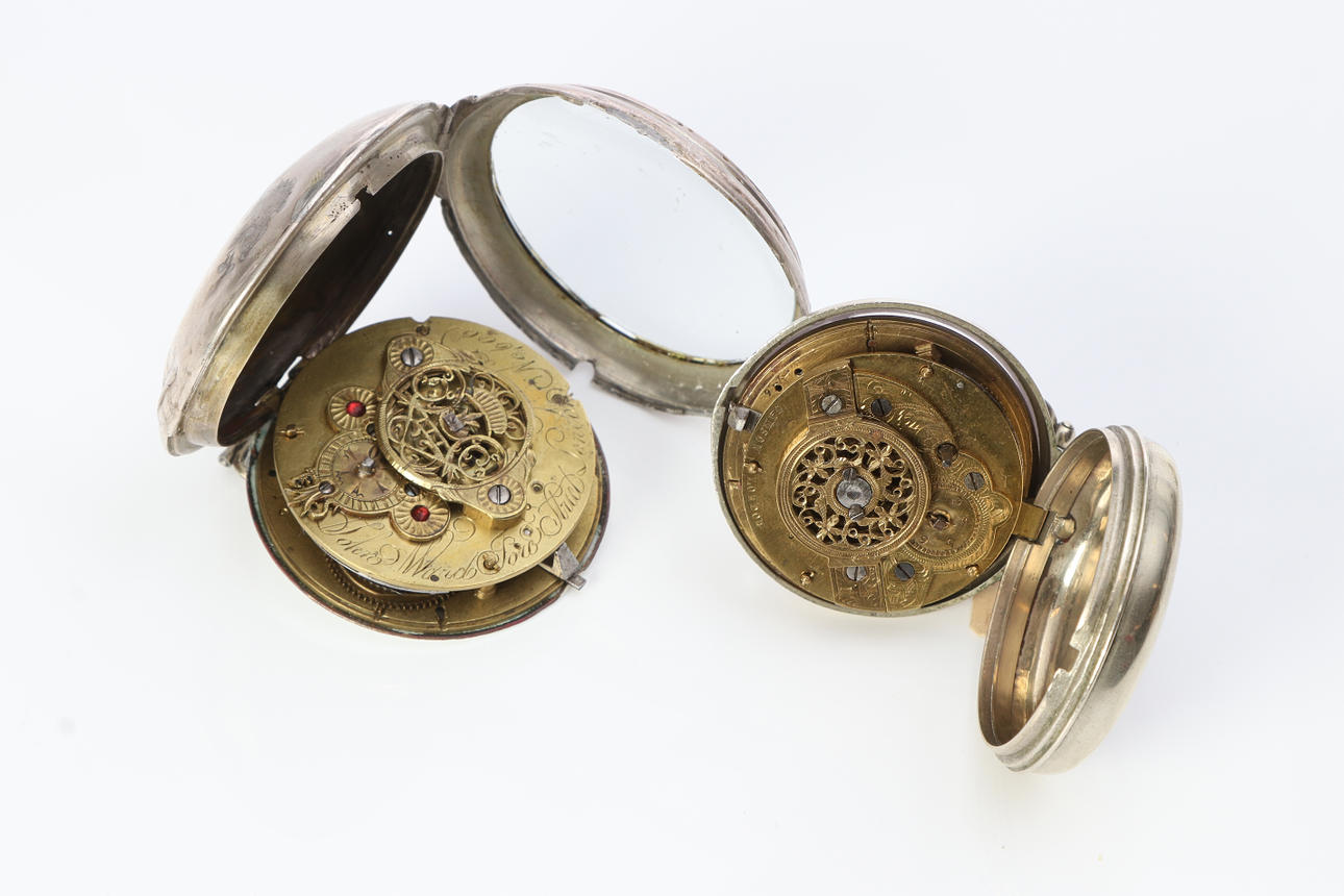 One out of John Ward, Soil Street London. One from John Lind, London. One out of Samson, London. One out of D.D. Neveren, London. One from Wilter, London, with a bell key. Diameter, excl. outer case, approx. 46-67 mm. Condition Enamel damage, wear and tear. The John Ward clock runs off, but stops after a while. The other clocks were working at the time of cataloguing. No functional warranty is provided. 22825