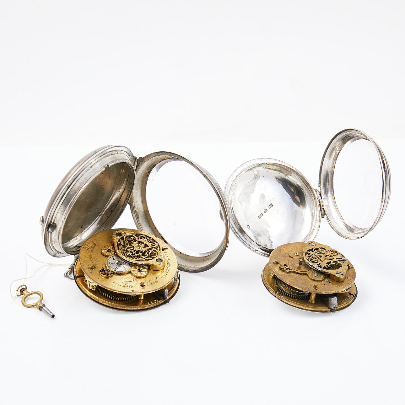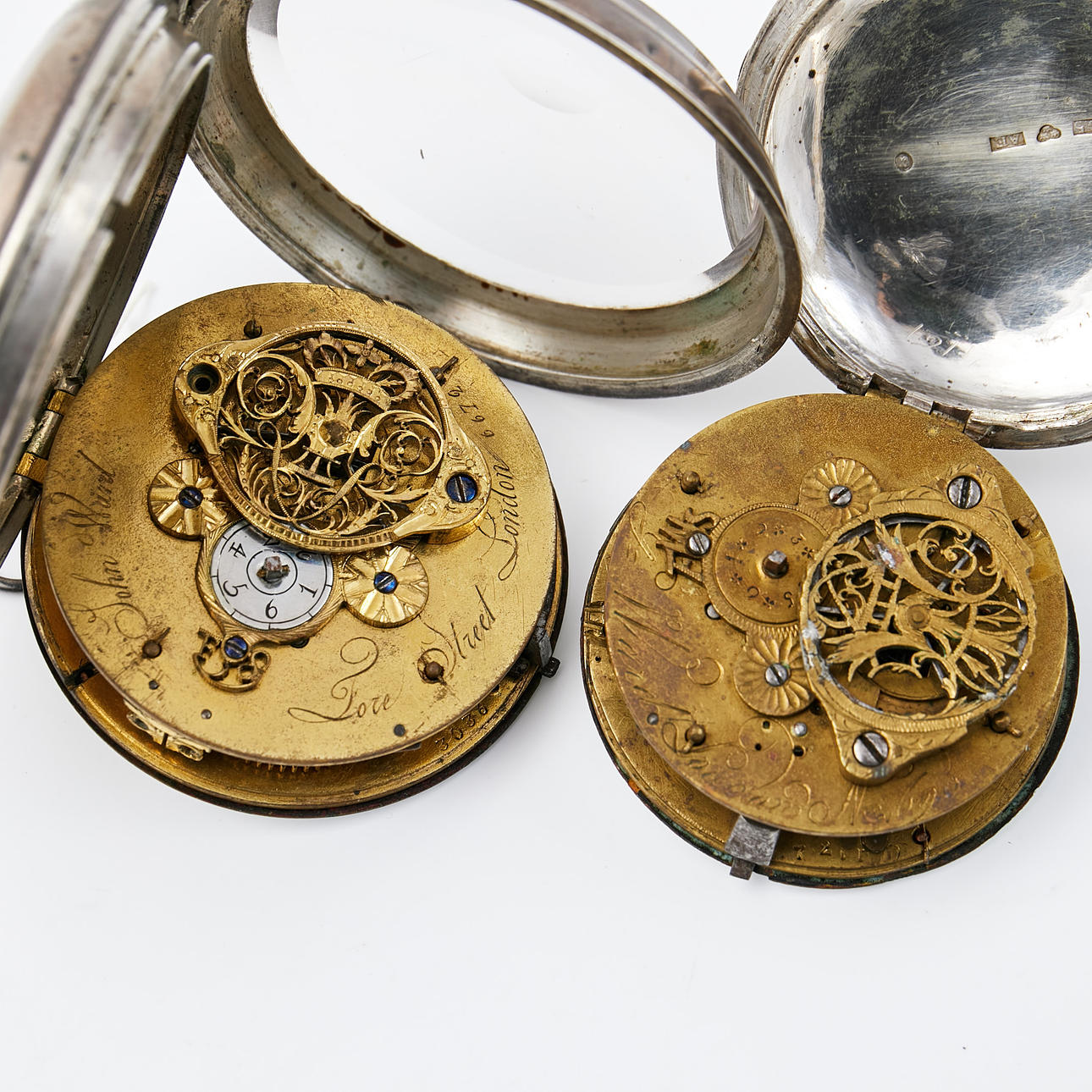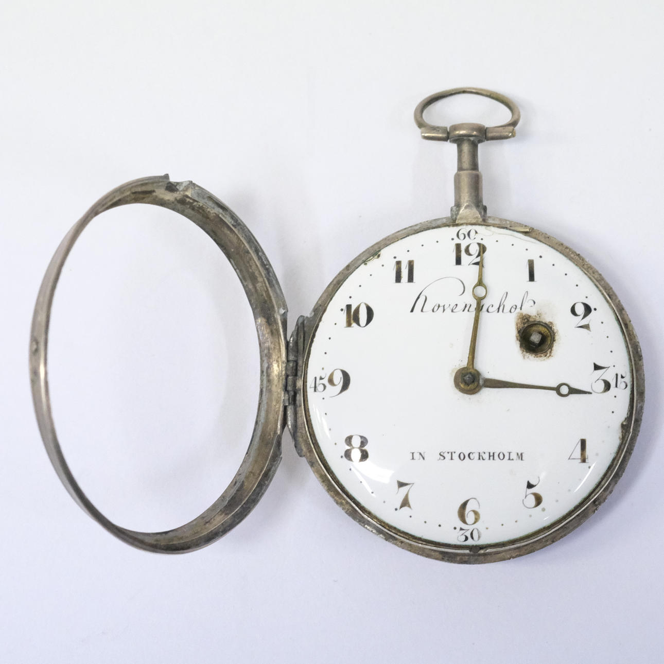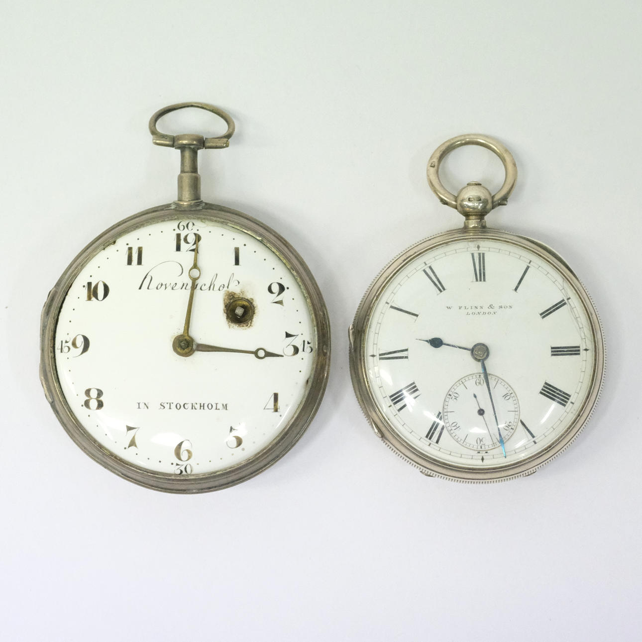 1.A 2-piece pocket watch, 19th century, enamelled unmarked dial, John Ward Fore Street London/ J Ward London. Case diameter approx. 56 and 66 mm. Condition Not tested or fully reviewed, no functional warranty is given, watch faces with damage, wear and tear, marks.141725 2.POCKET WATCH SO CALLED SPIDER WATCH. 17TH/19TH CENTURY. TWO PARTS. White dial with Roman numerals. Operating number: 8553, marked: W.Flinn & Son, LONDON, ERHLSDON &. Case No: 8553, partly decorated silver case made in 1885 by Robert John Pike in London. Diamètre: 53 mm. White dial with seconds display. Works tagged: Hofvenschiöld in Stockholm. Silver case of which the back case is monogrammed: “COS”. Diamètre: 60 mm. Condition Keys are missing. Not functional tested. No functional warranty is provided. Flinn & Son: utility wear, dial with defects. Hovenschöld: wear and tear, dial with defects, front glass missing, back case with monogram engraving.38231