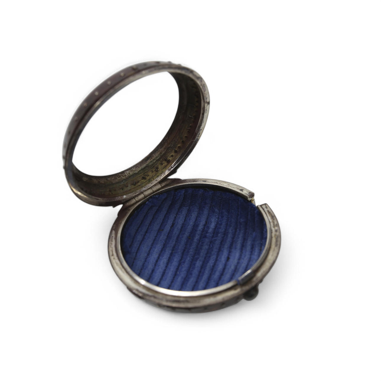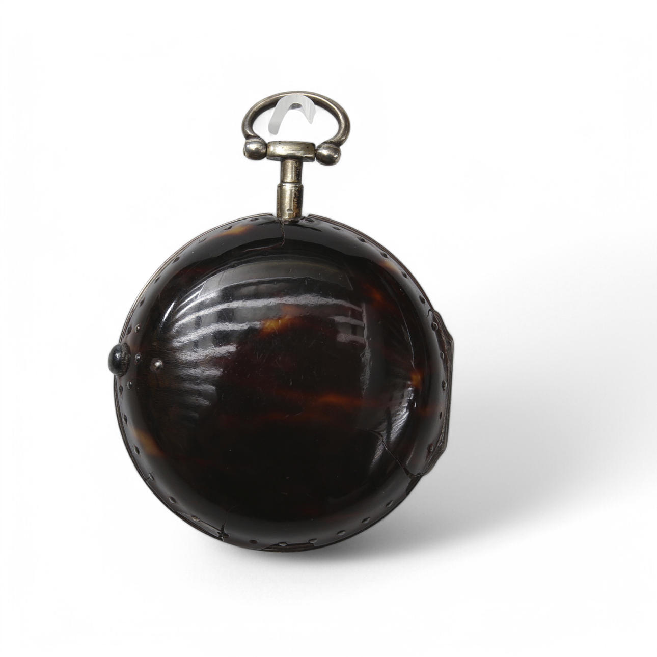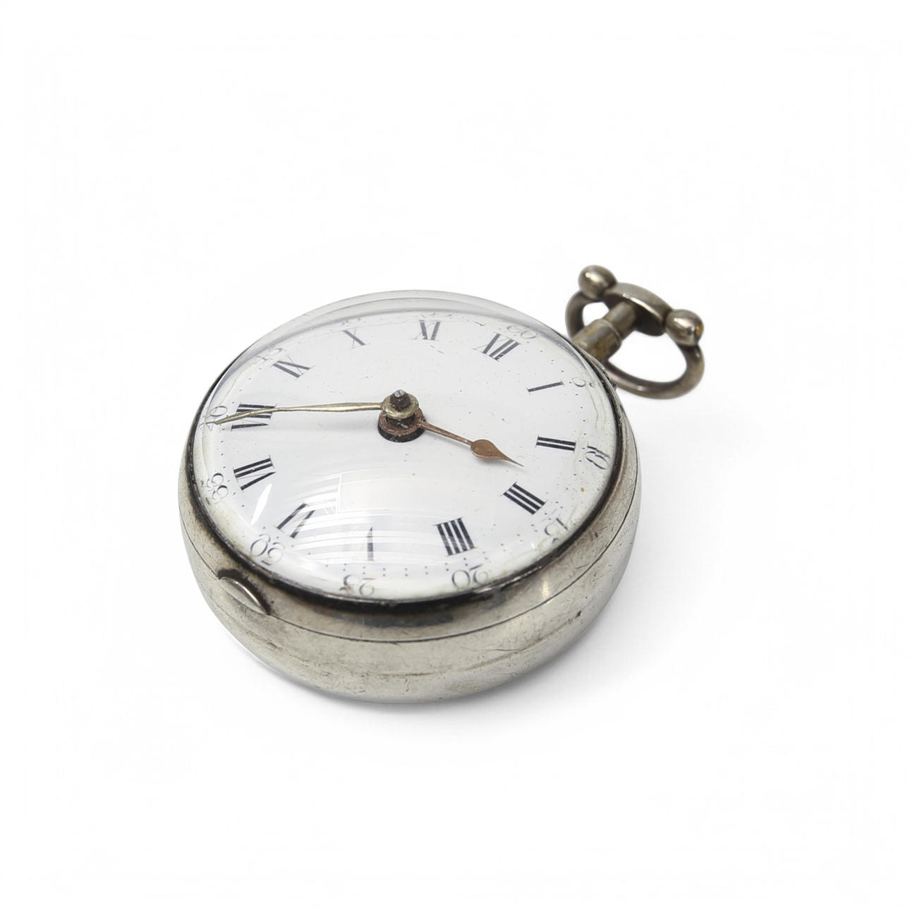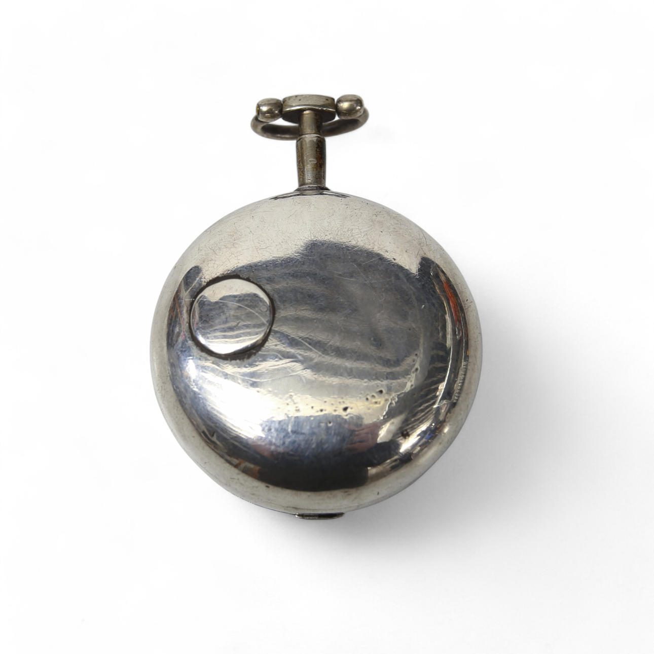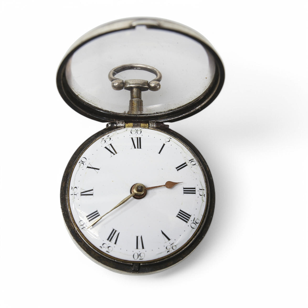 Signed in clockwork by J. Gill, 1421 London. Around the year 1770. Silver stamp for London, 925/1000, annual stamp, small d. Difficult to read master stamp. The clockwork, resting on profiled gilded pillars, the openwork oroclave with rococo shape. Outer case with decorative spikes in silver. Diameter including outer case 51,5 mm. Weight 106.7 grams. Condition Usage and age-related wear, the dial with cracks near the edge. The outer case with cracks and some minor loss, some silver nail missing. 27361