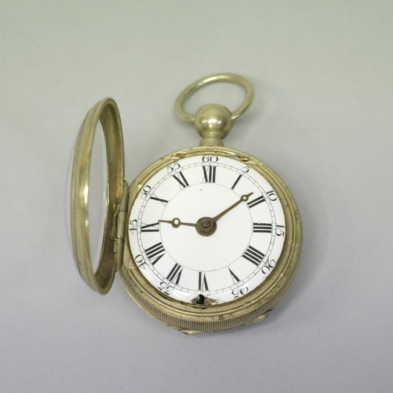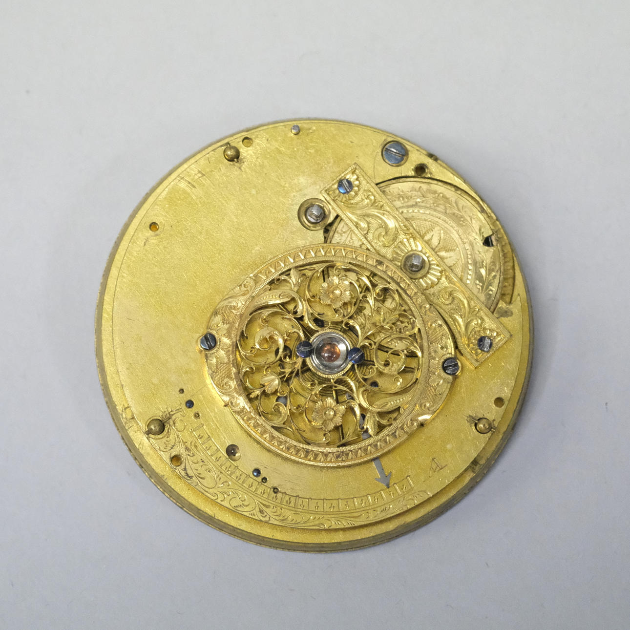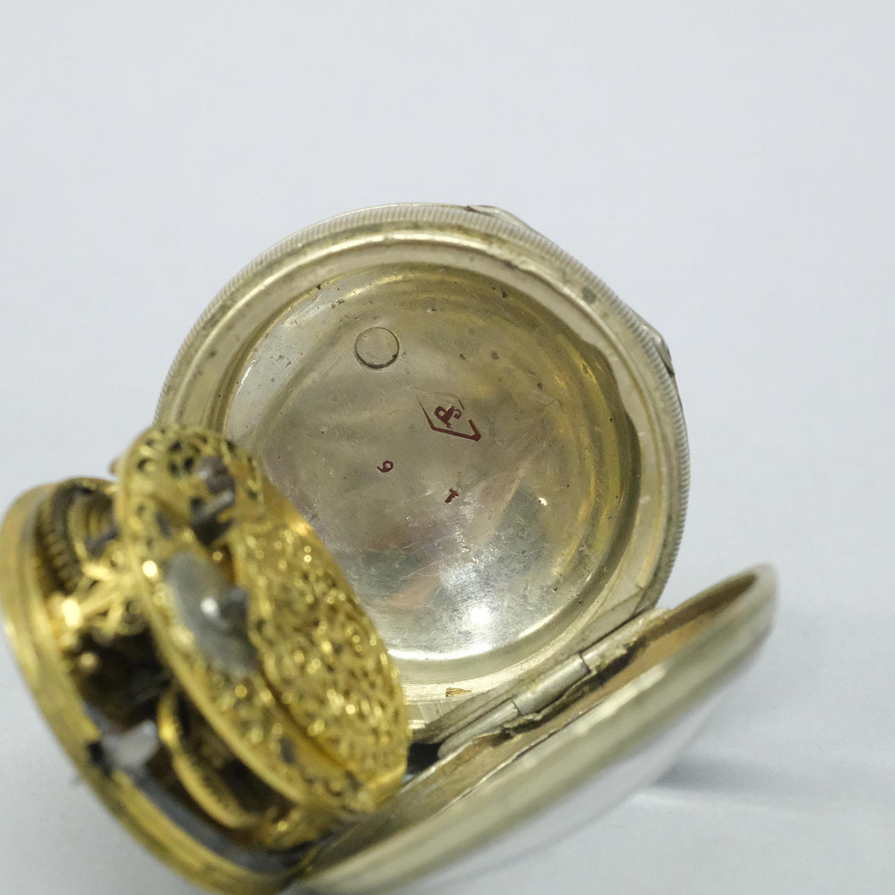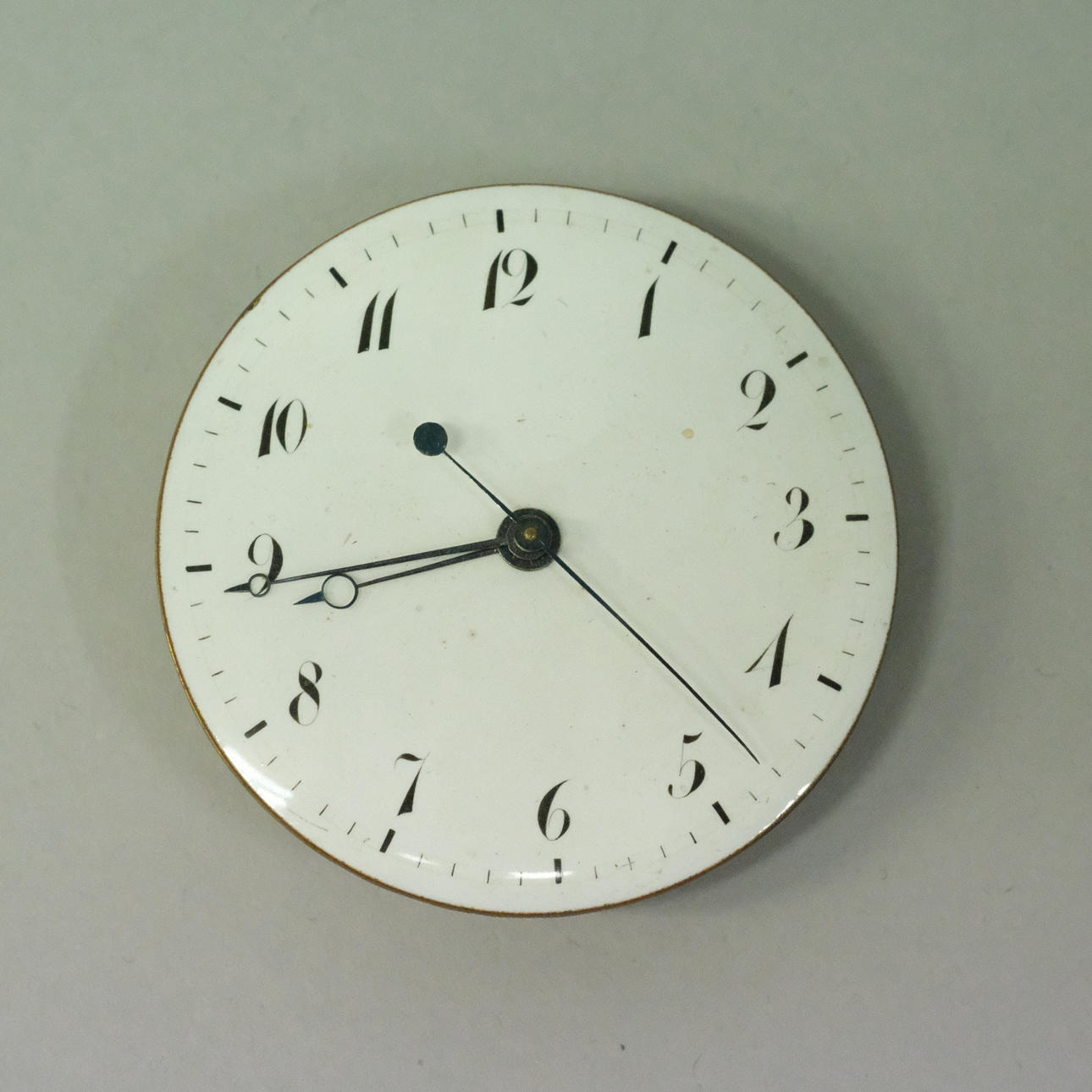 19TH CENTURY. AS WELL AS LOOSE SPINDLE CLOCKWORK WITH DIAL. White dial with 60-minute display. Case marked: JP. Diamètre: 43 mm. Loose movement with white dial. Diamètre: 52 mm. Condition Abrasions. Small dents. A dial bottom edge with enamel damage. Not functional tested. No functional warranty is provided. 41435