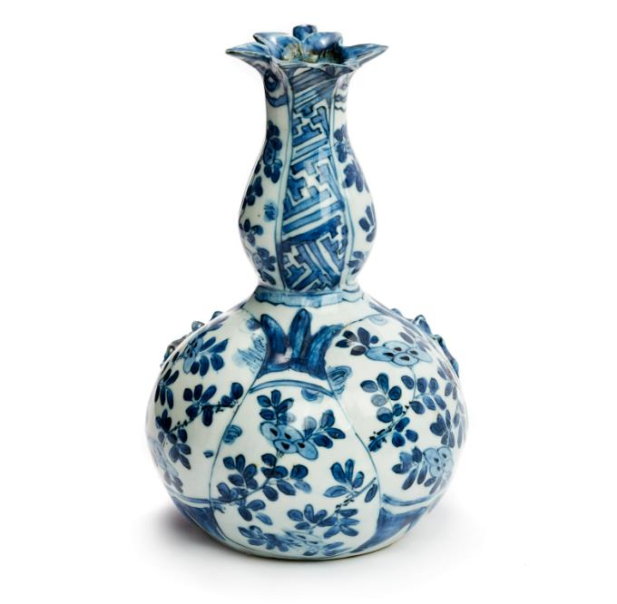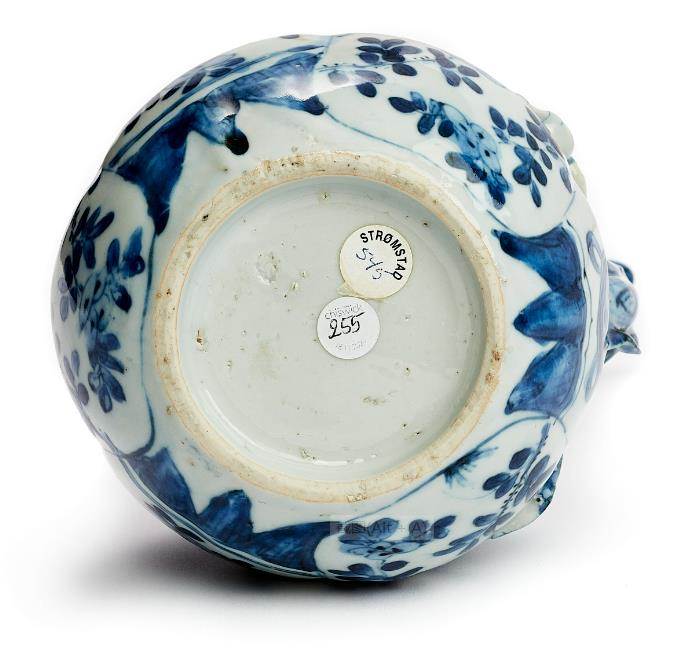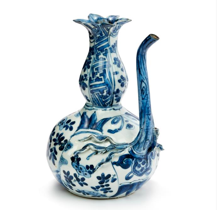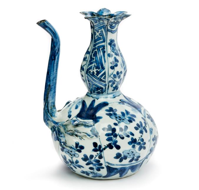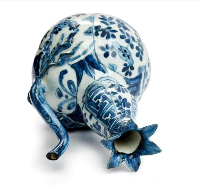 China. Wanli (1573-1619). Height 18 cm So-called "pomegranate jug" with a star-shaped mouth and a long, narrow spout shaped like a branch with appliquéd foliage. Hand-painted Kraak décor in cobalt blue underglaze in panels with floral motifs and geometric and stylised plant patterns. The shape of this jug, and especially the star-shaped mouth, is reminiscent of pomegranates, which have given rise to the common nickname.