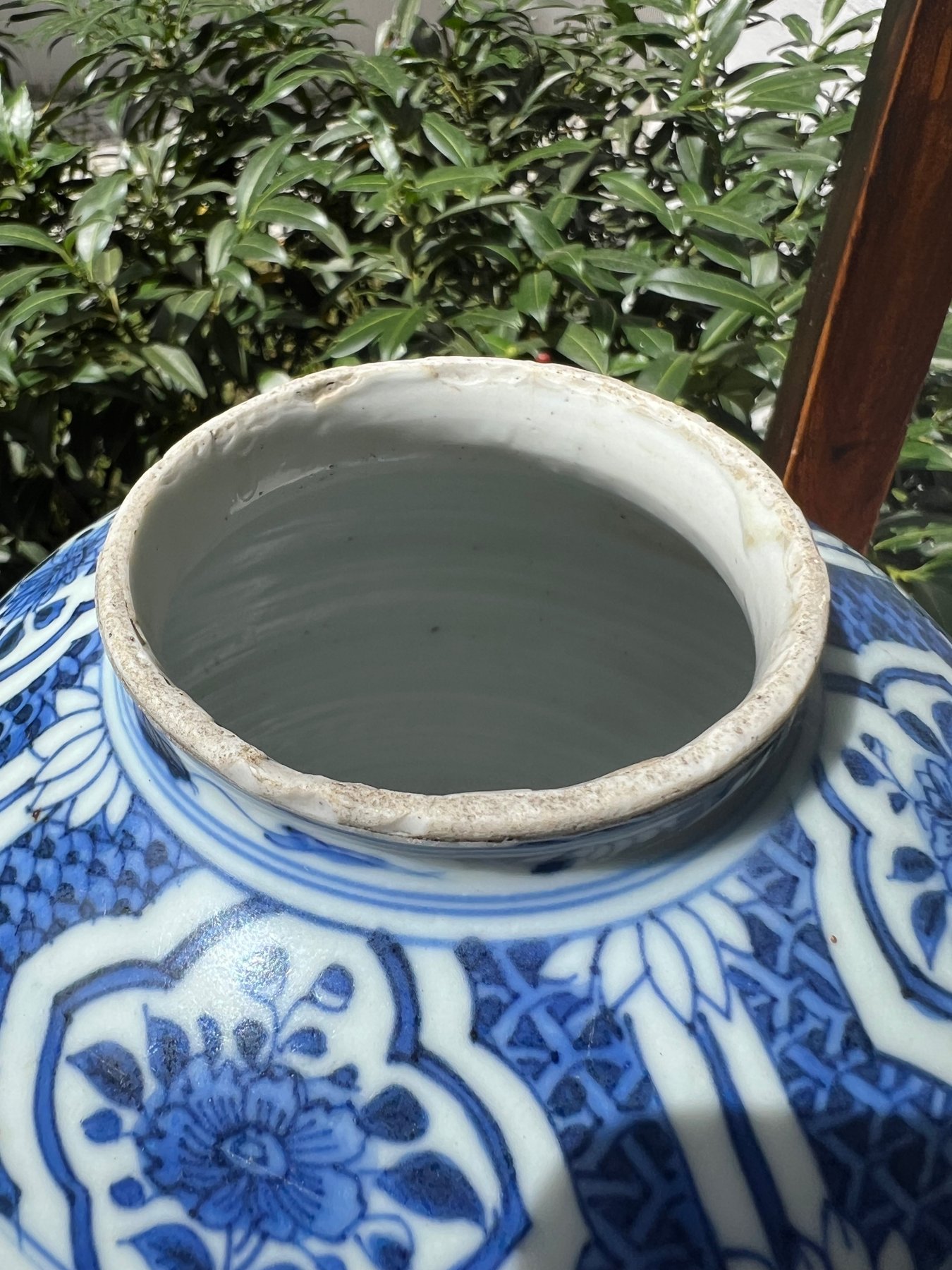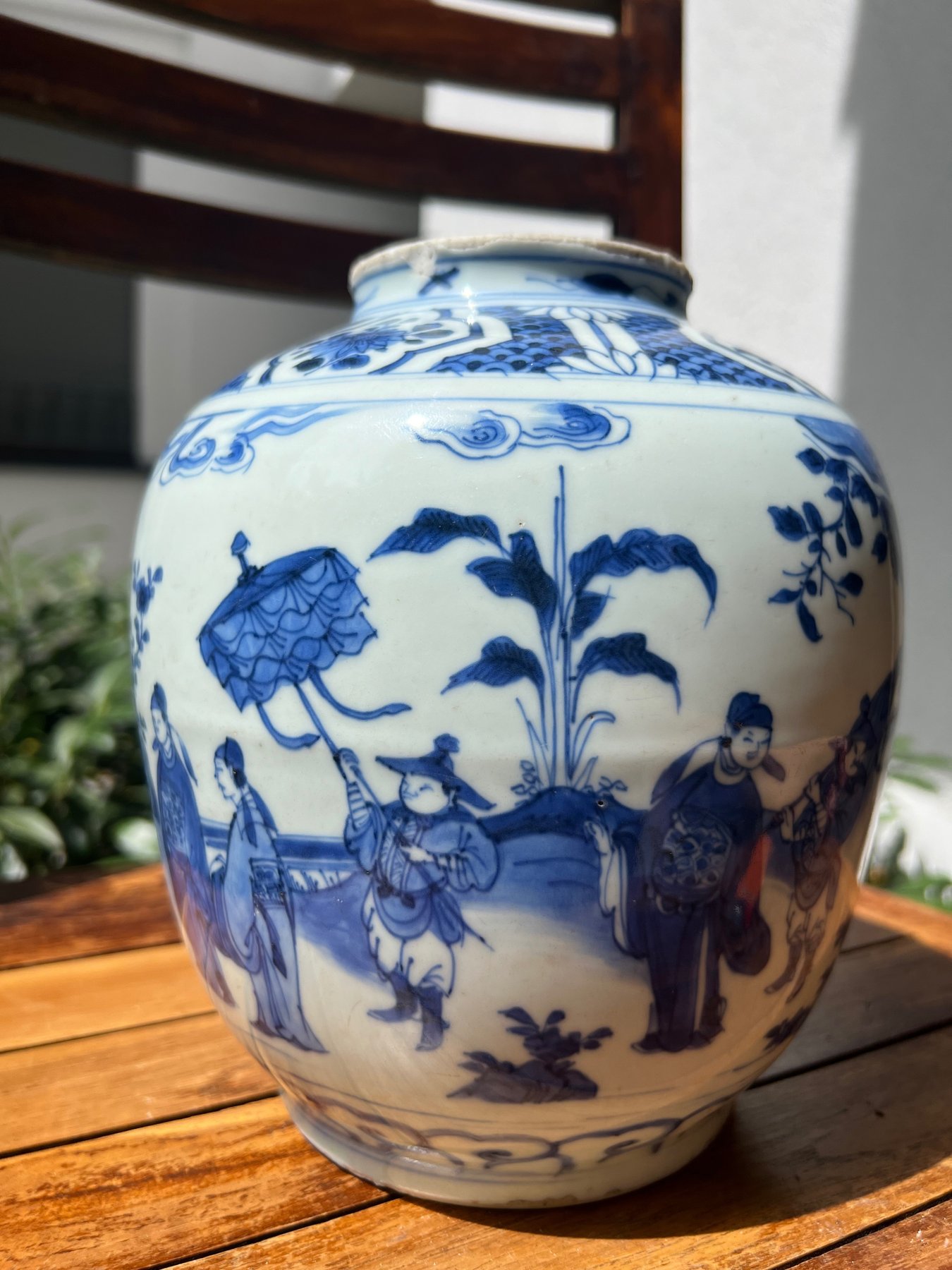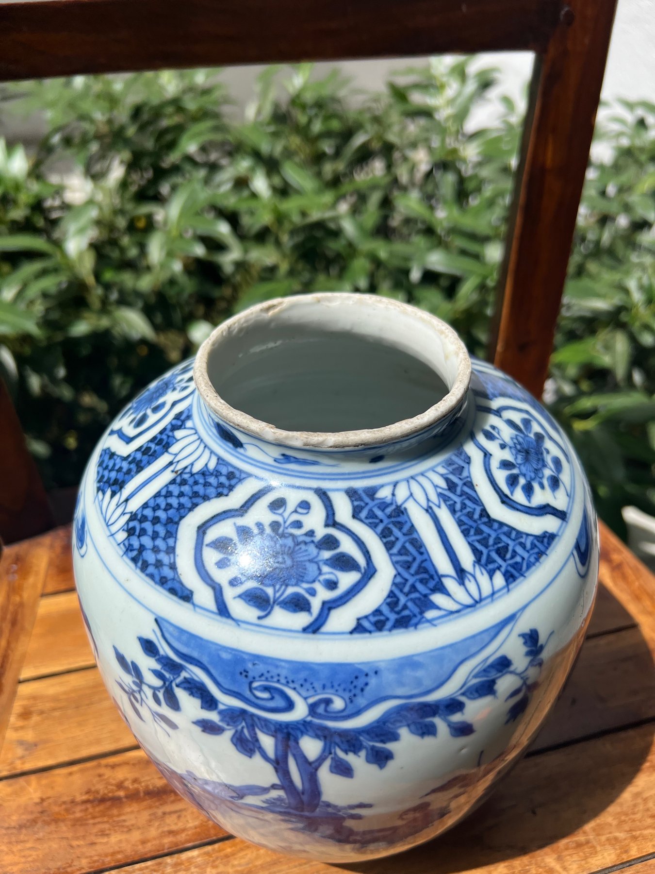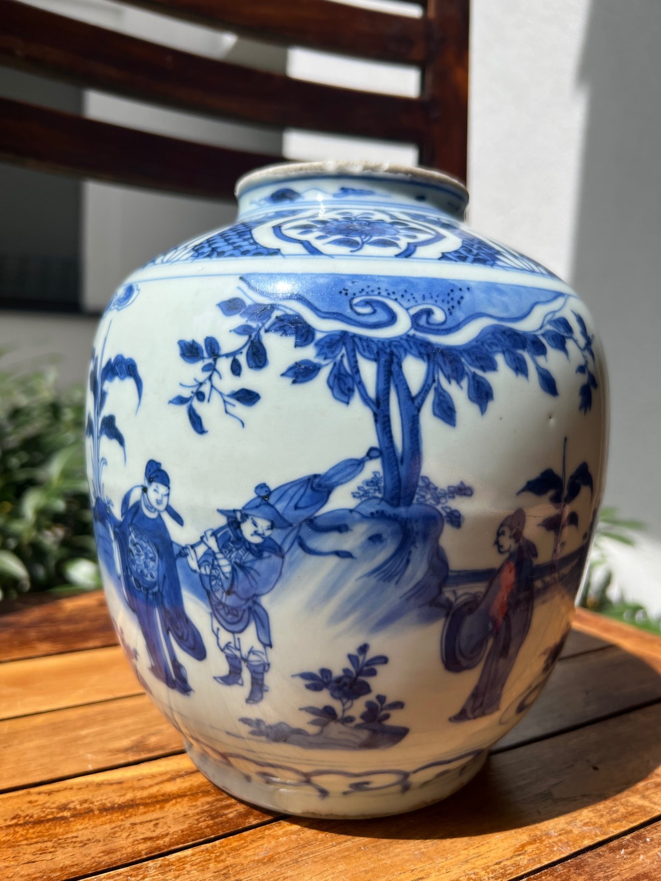 Late Ming Dynasty, bulbous vase decorated with courtly figures and a pagoda in a landscape setting, within leaf panels and blue lines, hare mark to the base, 21 cm high. Frits and various chips to the top and sides of the rim, minor glaze defects and cracks to the glaze, other wear consistent with age and use. Bottom, the side of the base where the glaze is slightly flaking. Purchased a few years ago from an English auction house.