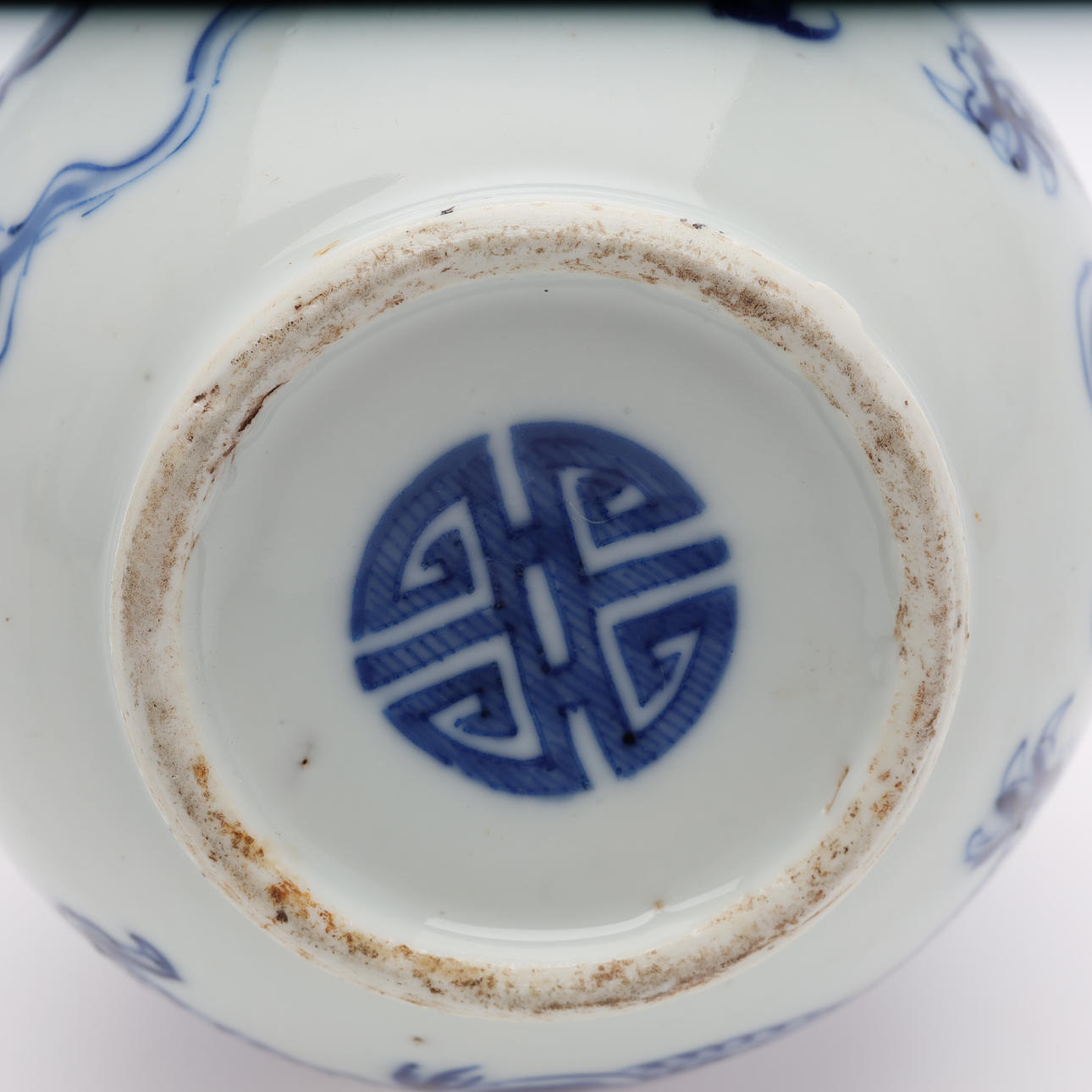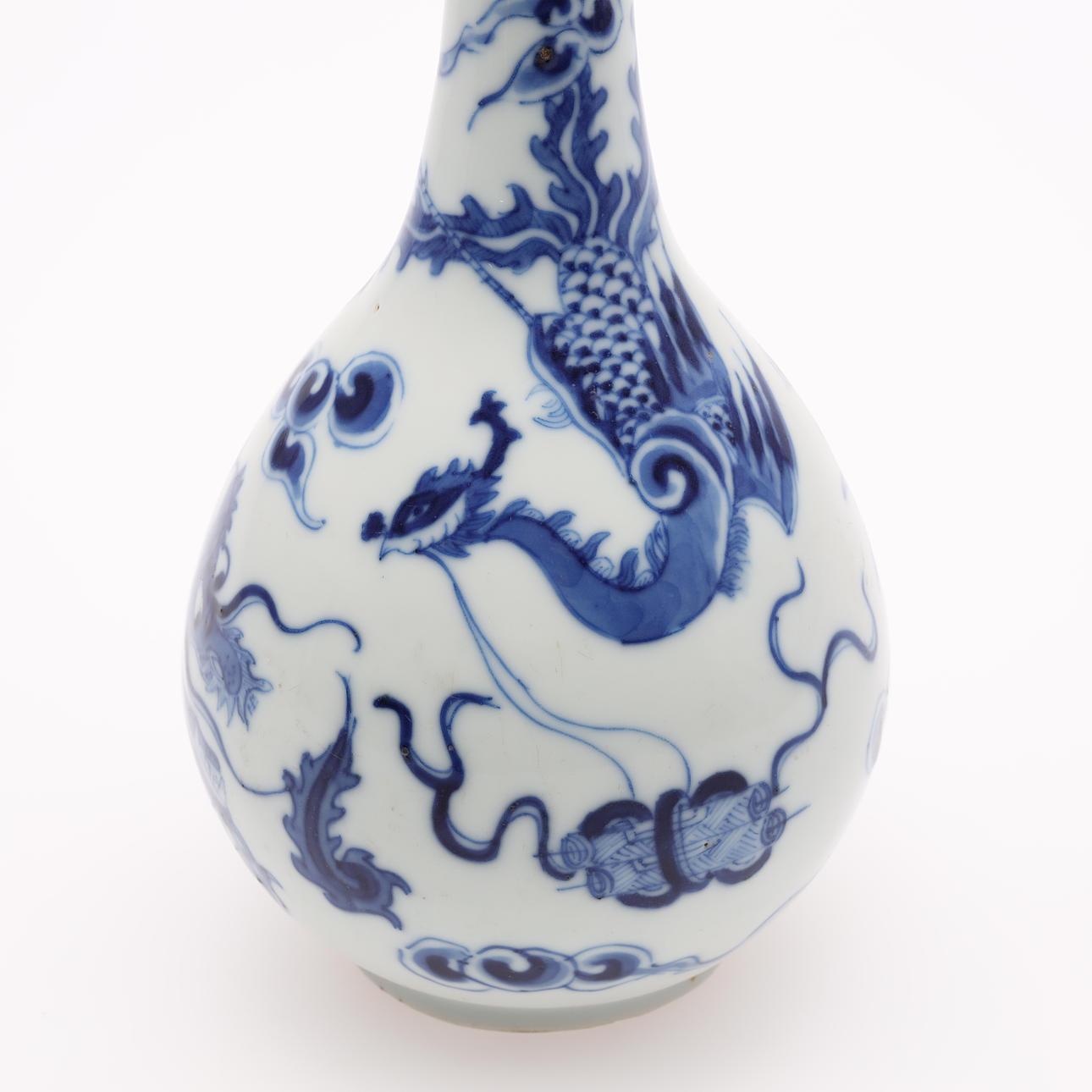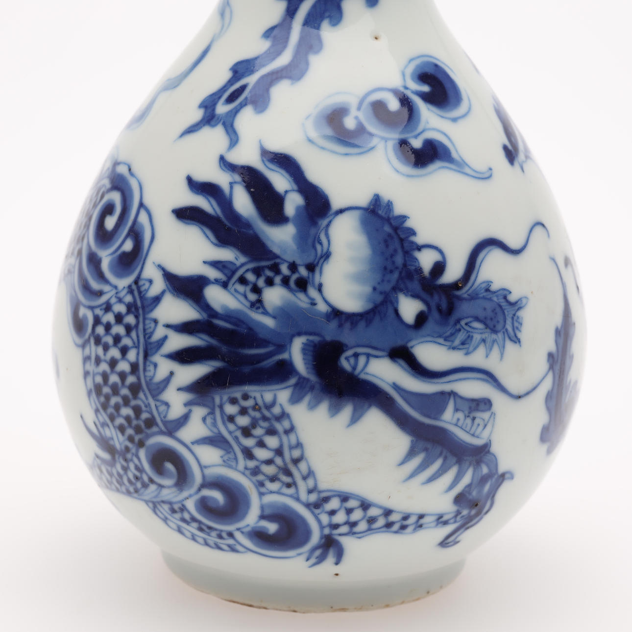 Underglaze blue décor of dragons, metal shod muzzle Height 23 cm. Condition report good condition. 41449