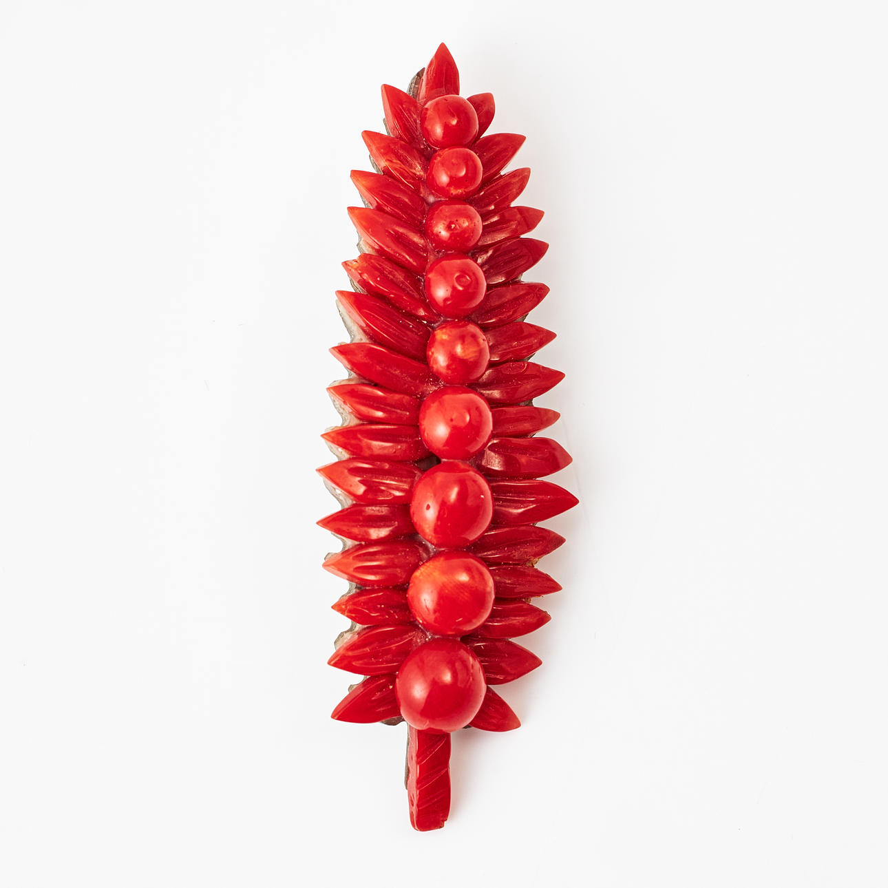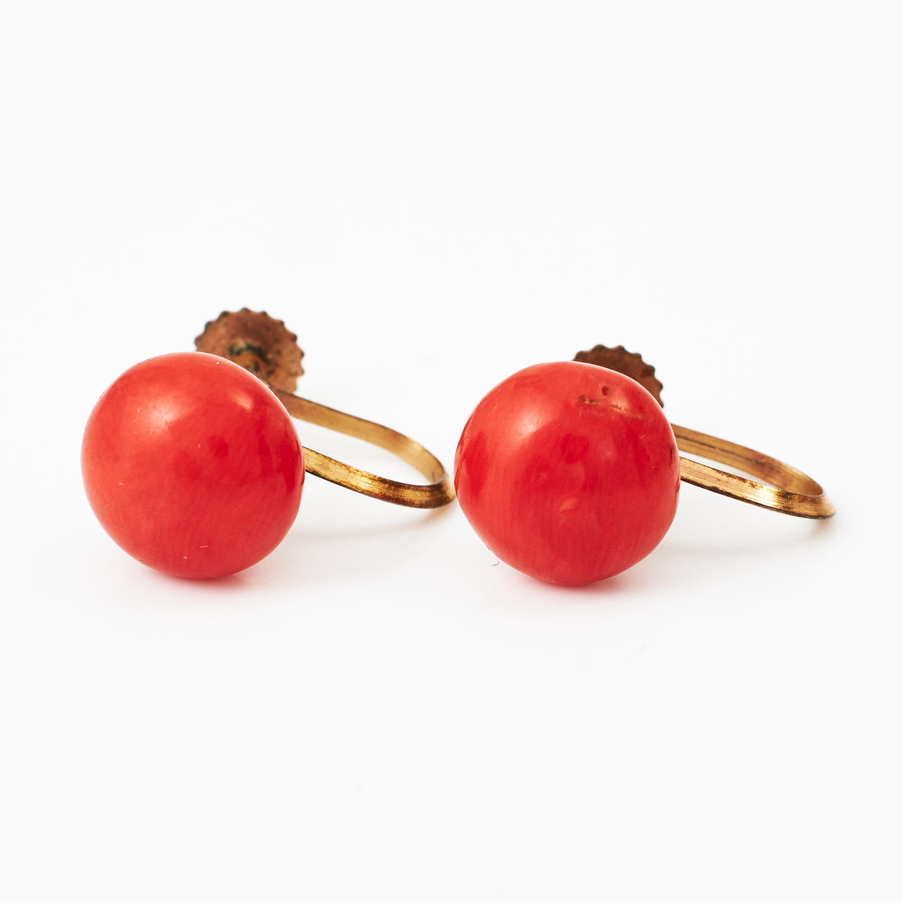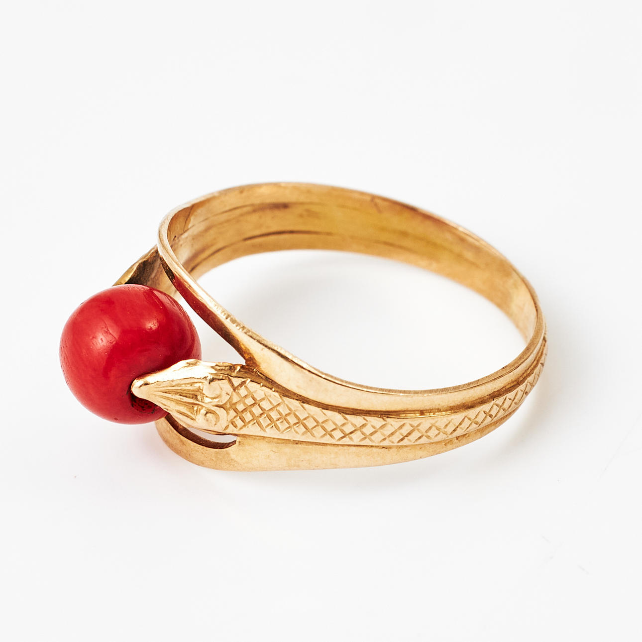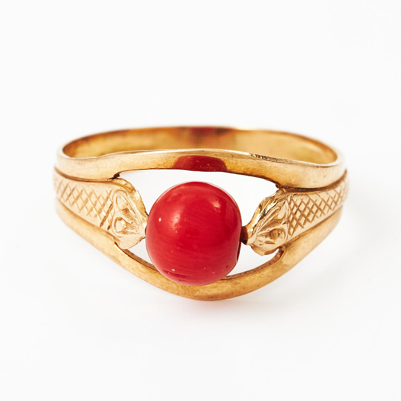 RING, 18 k gold, inset coral ball approx 6,5 mm, ball movable in mounting, side decors in the form of snake heads, Vicenza/Italy, BROOCH, in the shape of a leaf, mother-of-pearl back, EARRINGS, 1 pair, gilt, corals, screw system. Ring size 17,2 mm, brooch height 6 cm. Condition Corals with natural vestibular marks appear. 258247