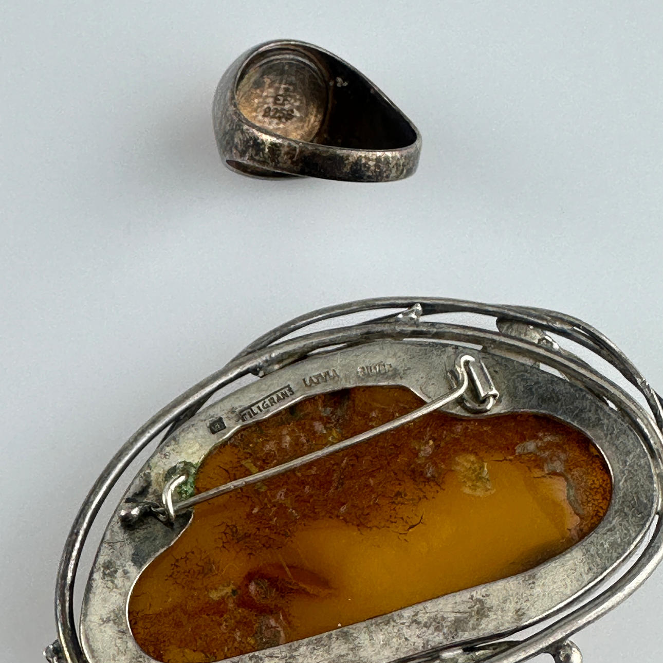 Ring 16 mm Brooch 5,5 x 3,5 cm from Latvia Pendants 2 pcs. 3.5 and 4 cm. Condition Condition of use. The silver needs to be polished. 37788