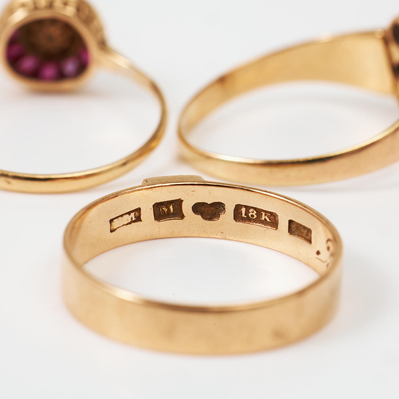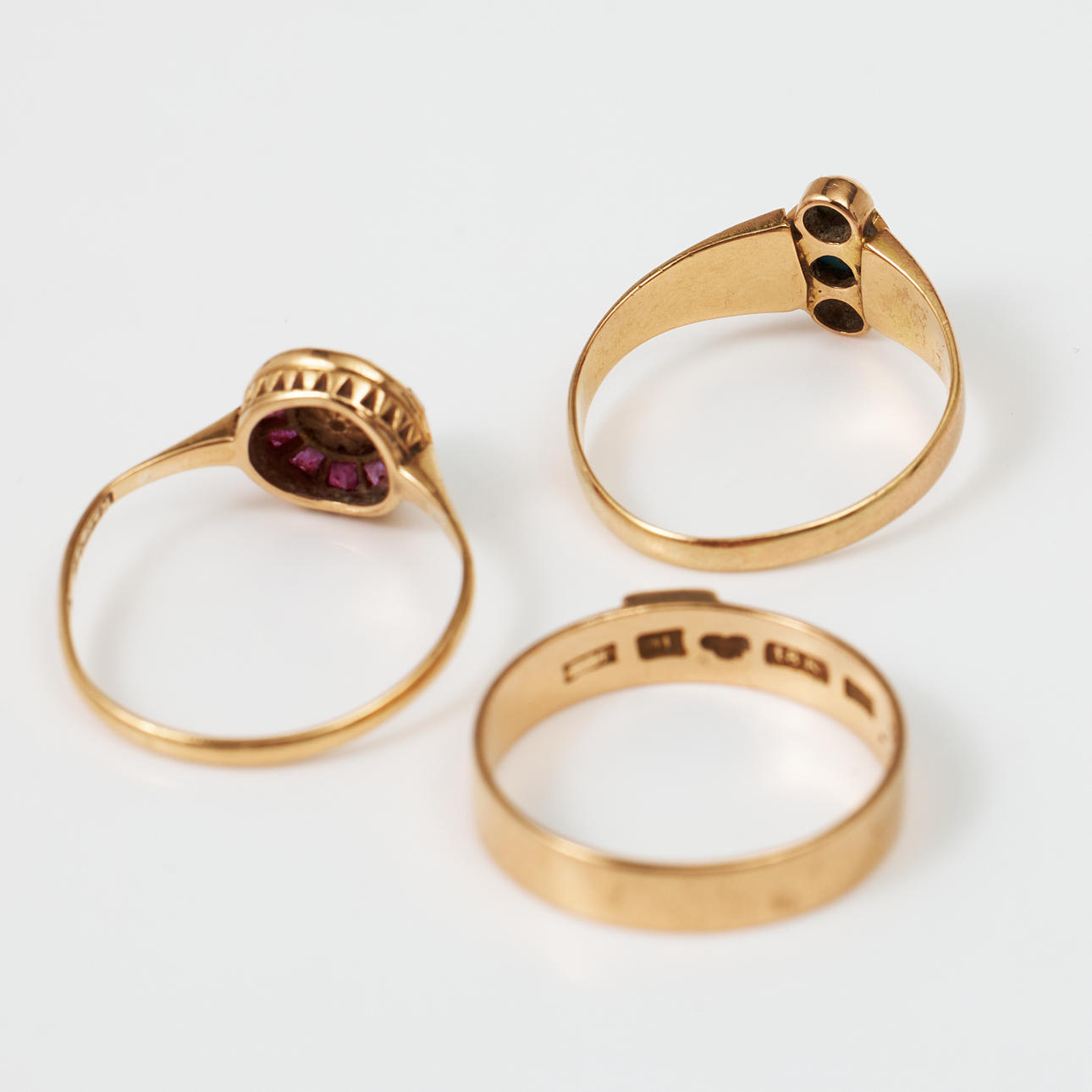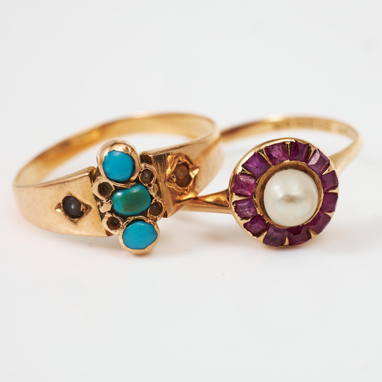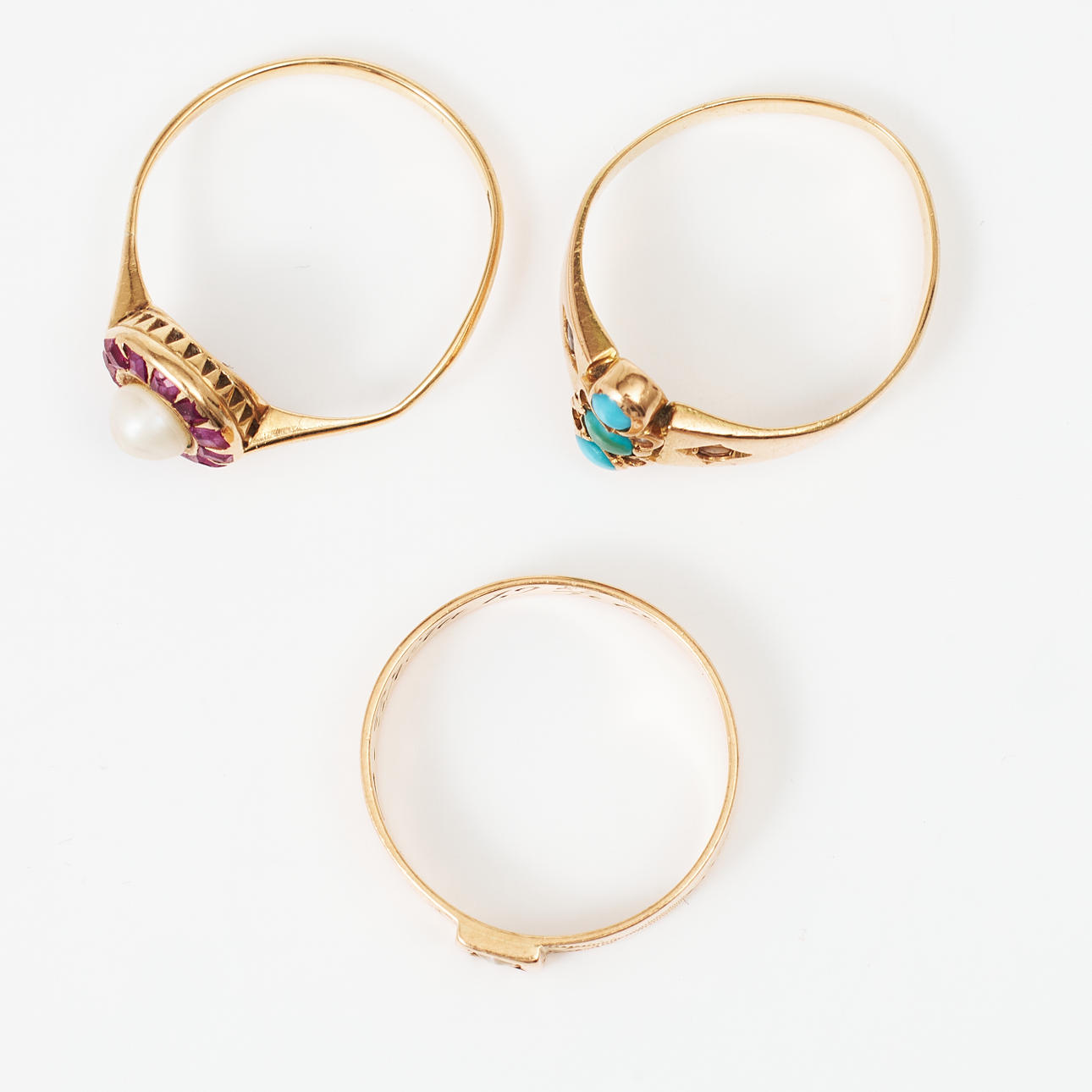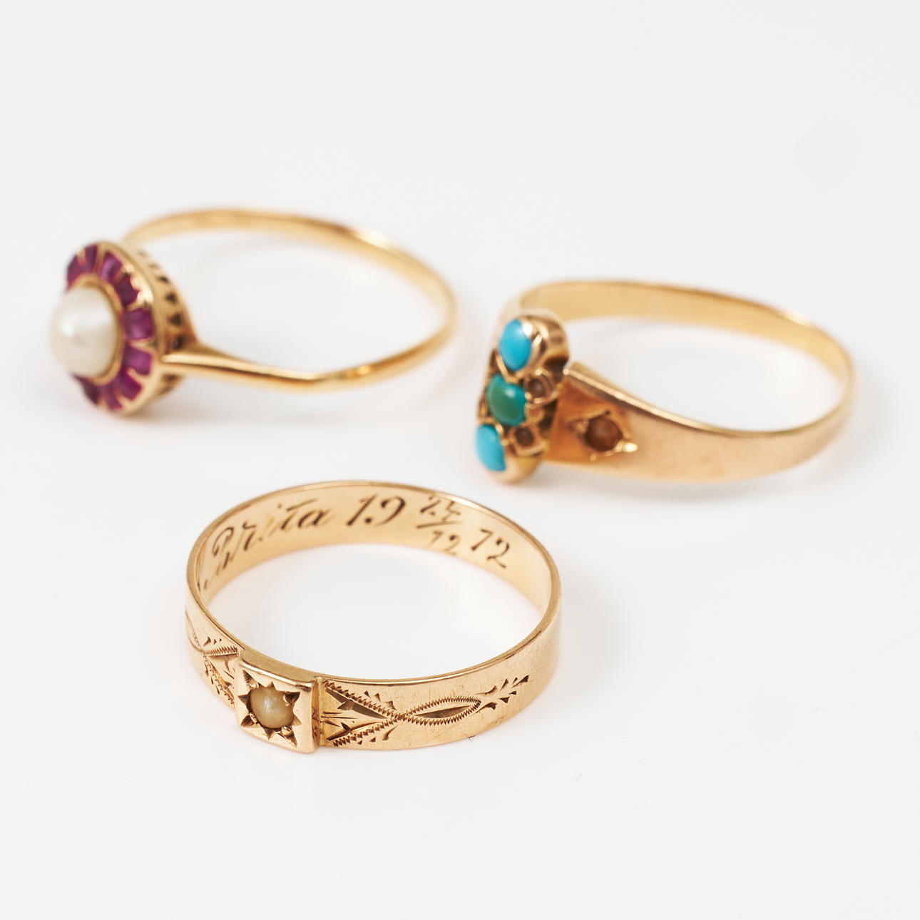 Decor among others with turquoises, oriental pearls and carrécut rose red stones. Ring with turquoises unstamped, ring with pearl stamped Emil Oscar Möller, Malmö 1912 resp. K & EC, Gothenburg 1934 Ring sizes approx. 16-16.5 mm, total weight 5.7 g. Condition Beads with extensive wear some small ones missing, stones with notches and damage, inscription appears. 186394