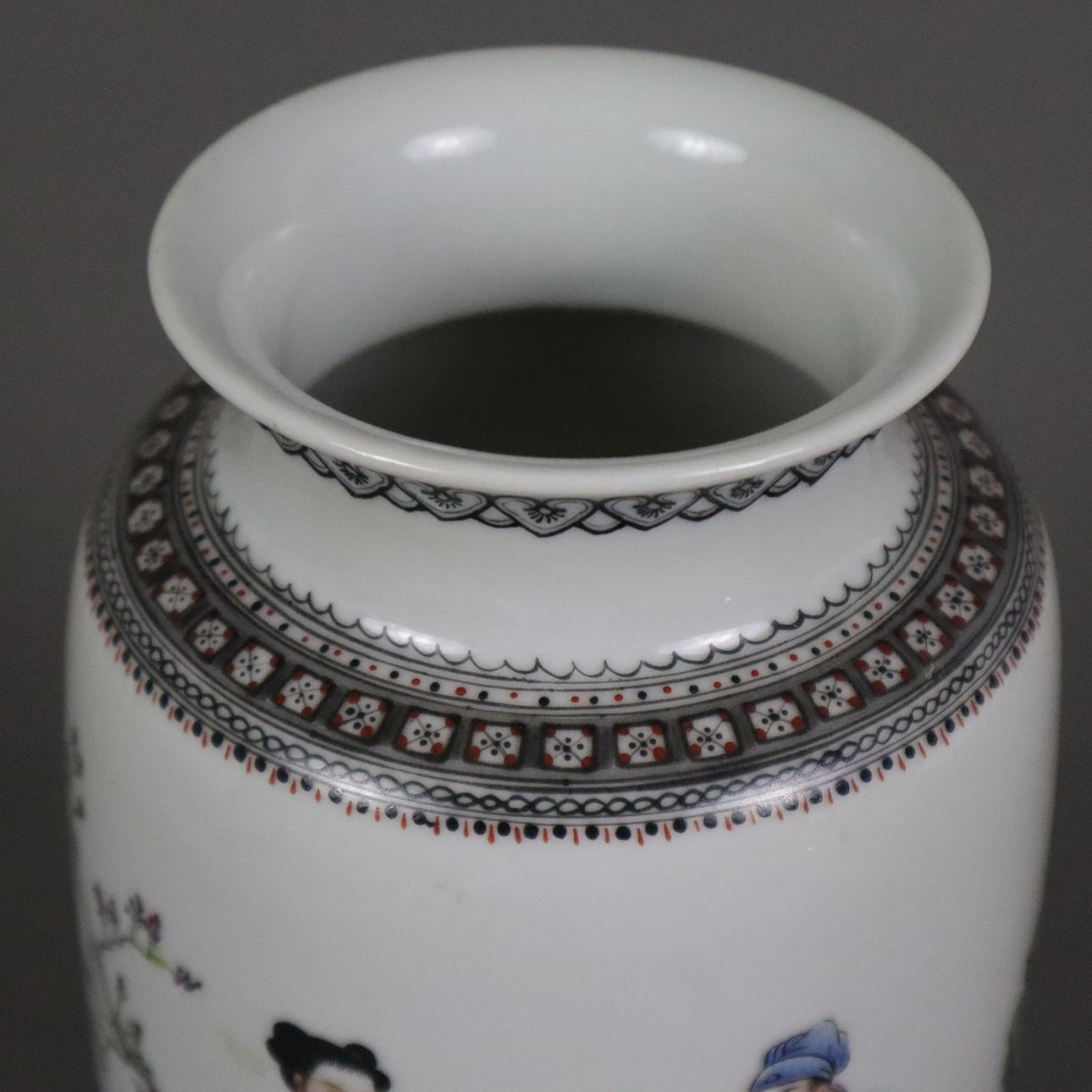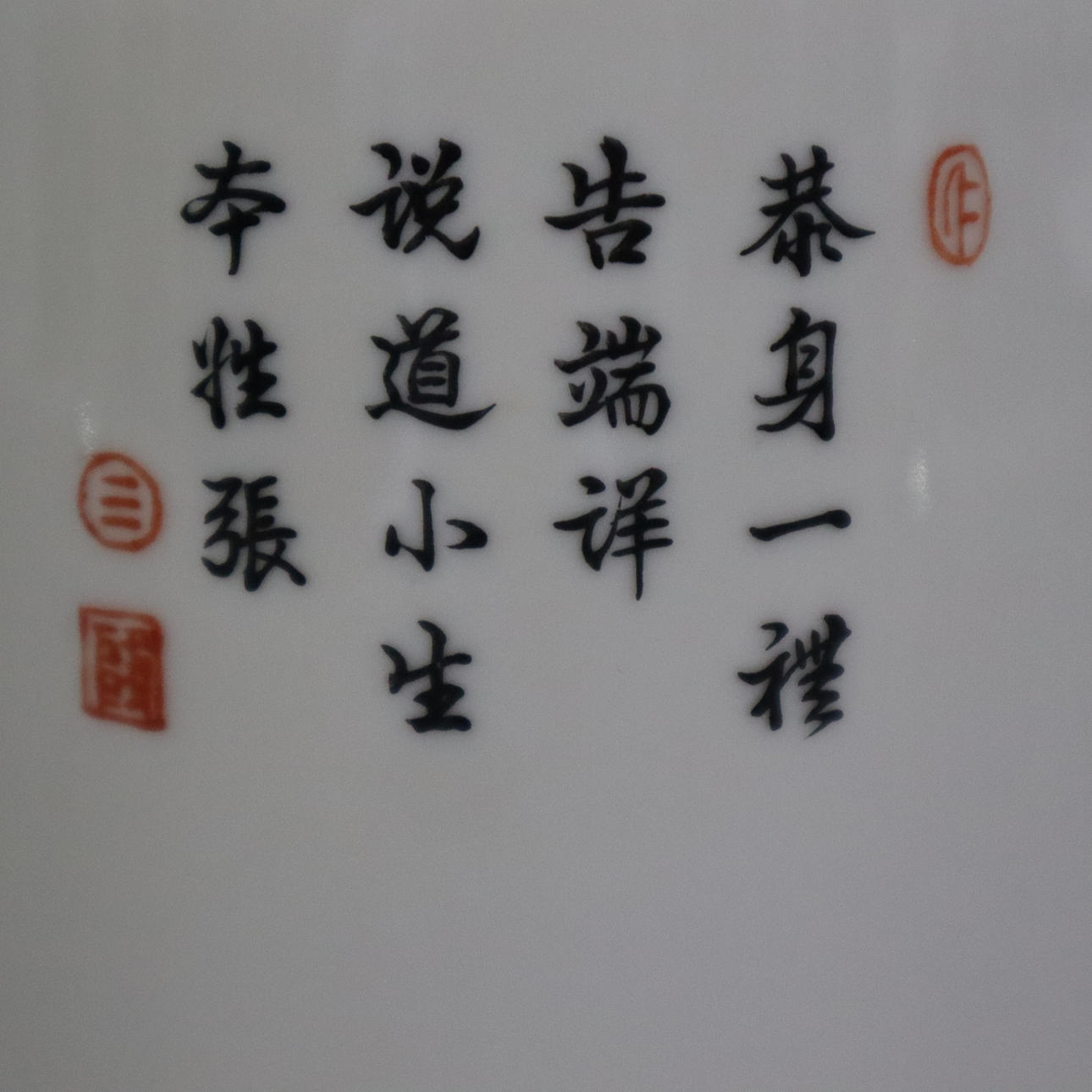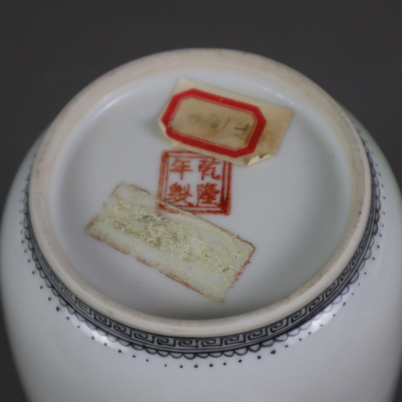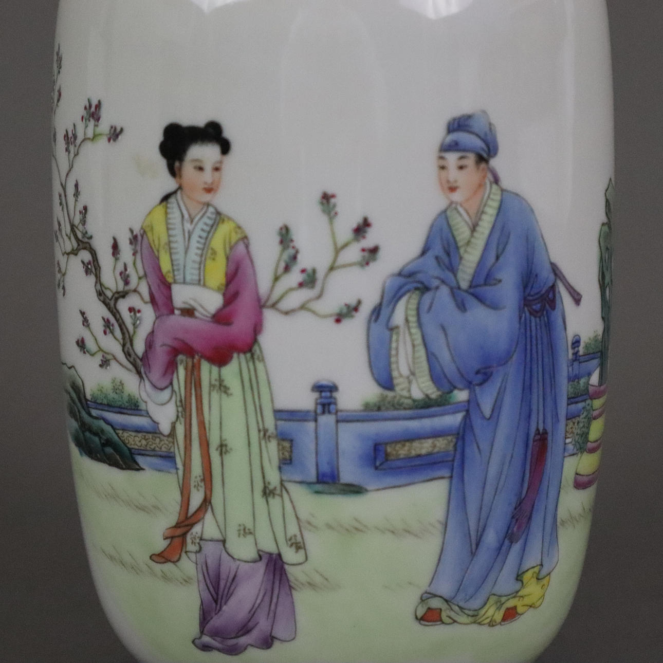 Description colored overglaze painting with a couple scene in a stylized garden landscape, Chinese calligraphy lettering on the back, decorative lace braids on the neck and stand in black and red, red four-character Qianlong mark, self-adhesive label on the bottom and glue residue, Height approx. 19 cm, Weight approx. 625 g. Fitness report Good condition with minor signs of wear. 20595