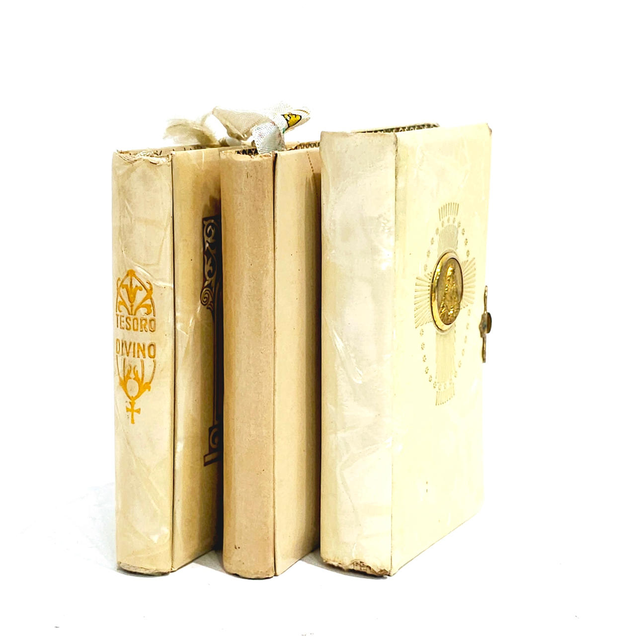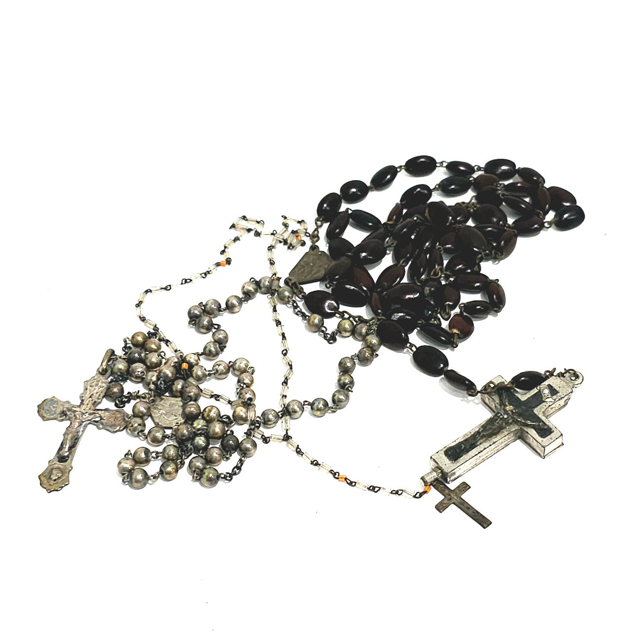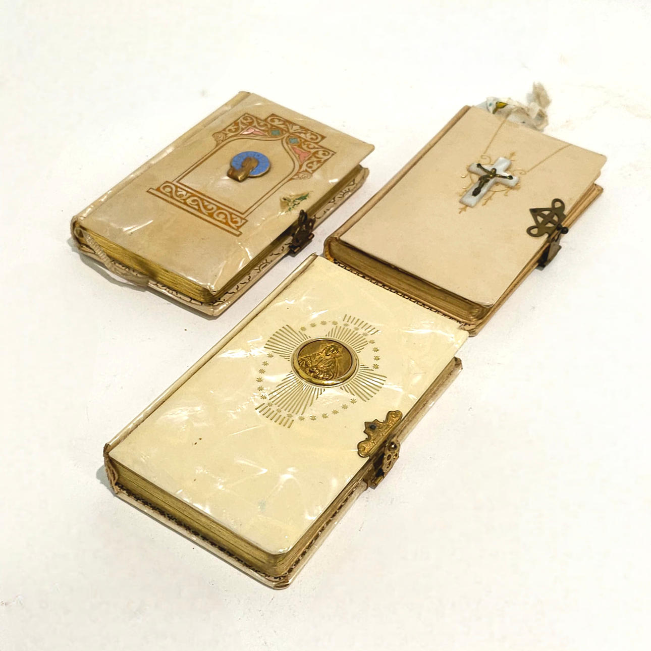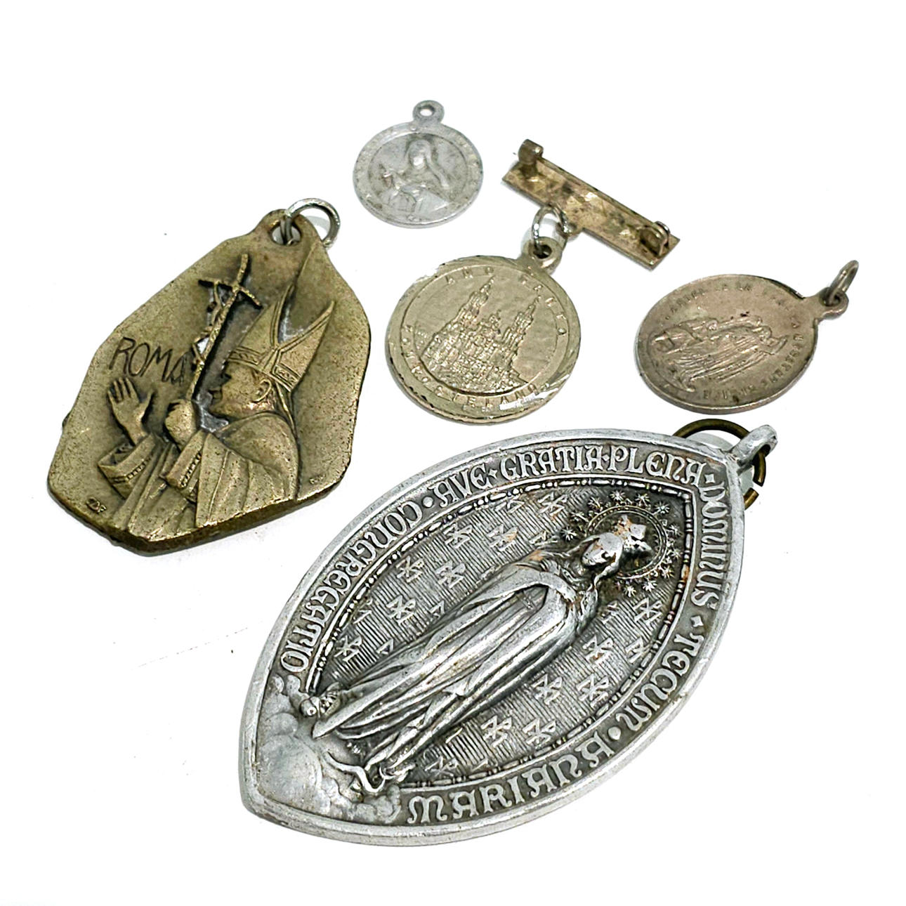 Three rosaries with silver metal beads. Three missals from the 50-60s. Different medals and religious pieces. Larger bronze medal with the image of Christ: 11x6.5 cm. There is a medal from 1925. Letter opener in mother-of-pearl, 14.3 cm long. Condition Vintage signs and faults. Some pieces could be made of silver, but most are made of metal. 21698