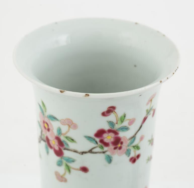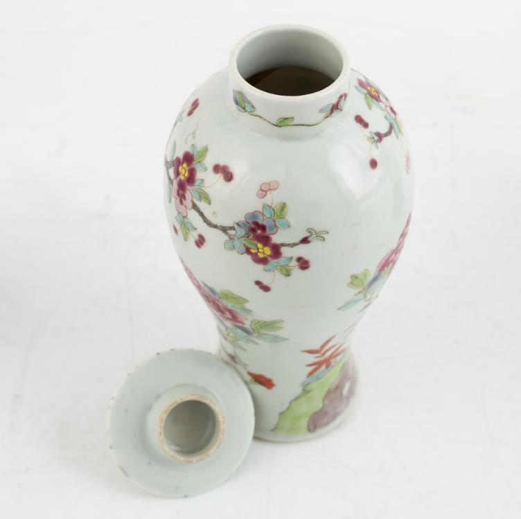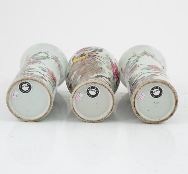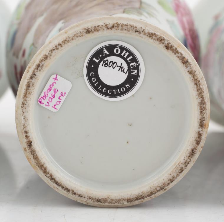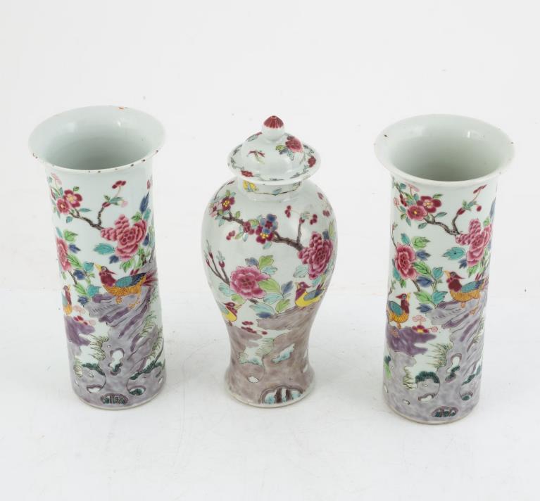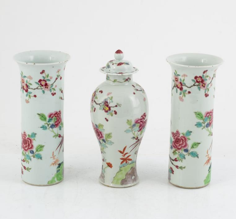 Qing dynasty, 19th century. Consisting of two trumpet vases and a baluster urn with lid. Decor in famille rose with a motif of pheasants in a blooming garden. Height 21-22.5 cm. Minor occasional nicks. Wear and tear.