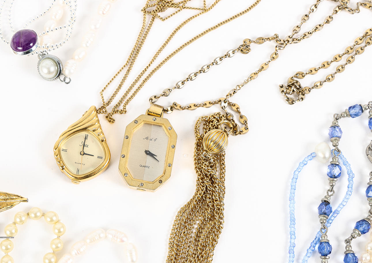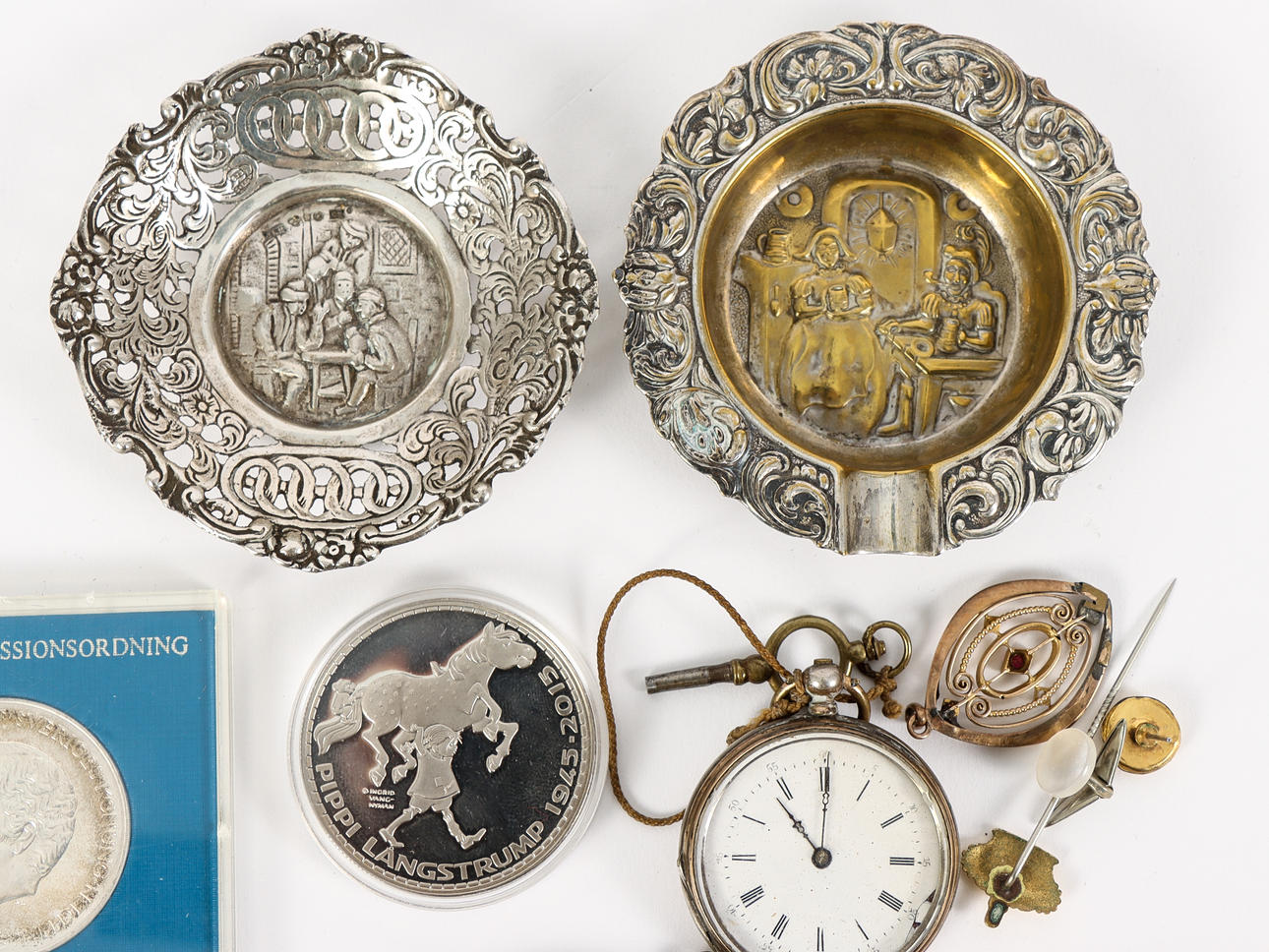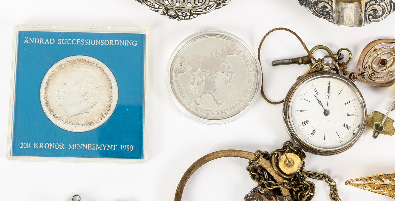 Silver commemorative coin, Astrid Lindgren and 200 SEK 1980. Total weight about 57 grams. Small bowl dish silver, weight 29 grams. Grandma watch with silver case. Various bijouterie, including necklaces with cultured freshwater pearls. Condition Normal wear and tear, minor damage may occur. 62638