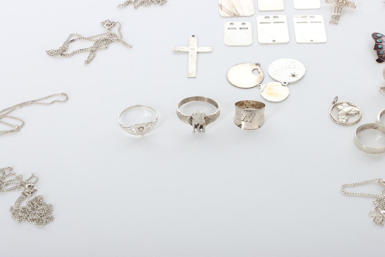 8 silver chains, in different chairs from approx. 30 - 43 cm. 5 silver rings, marked inter alia sterling, cat's foot, 925. Largest ring diameter 2.4 cm. 1 piece bracelet in silver, nameplate, stamped 925. Length approx. 14,5 cm 2 brooches, stamped with cat's foot and S925. Length of brooch with cross about 3.6 cm. 9 silver pendant, stamped cat feet, 925, B10 (1976), 835, 830. Large silver ball diameter approx. 2.5 cm. 6 id badges in silver, stamped with cat's foot, 830, 925S. Maximum dimensions 3 x 2,2 cm. Condition Abrasions, dents. Engraving occurs. 71270