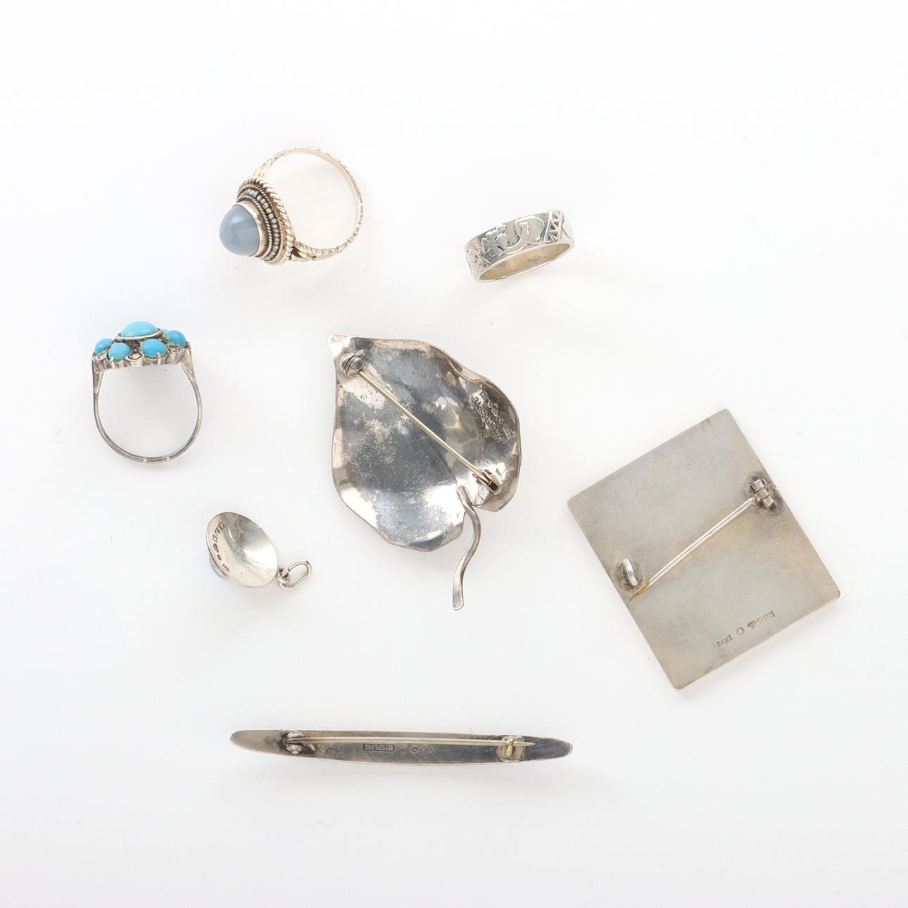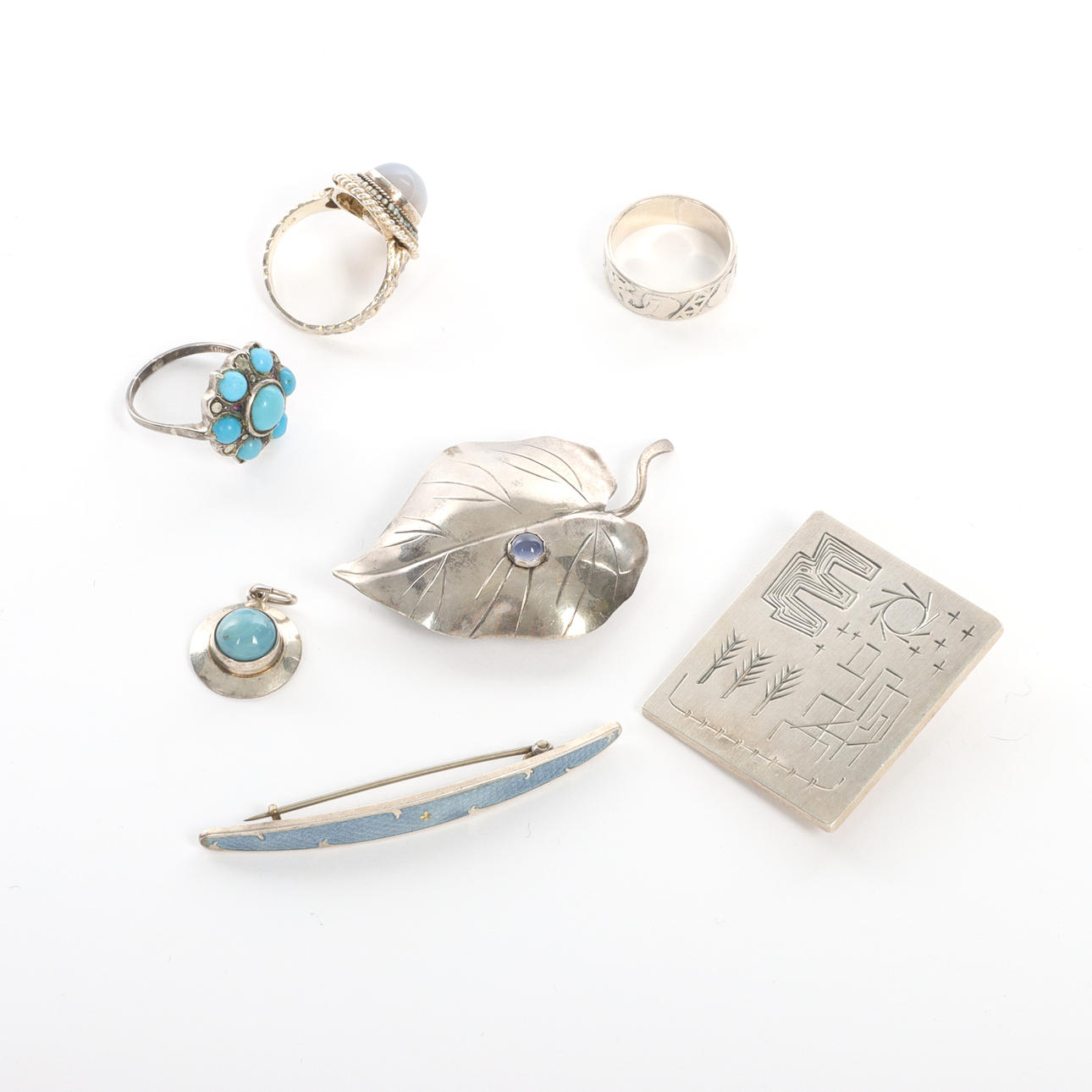 1 x leaf shaped silver brooch with moonstone Stamped Needlework, R&H, cat's foot, G9 (1957) Size approx. 5,5 x 3,5 cm 1 piece silver ring with cabochon-cut moonstone surrounded by smaller light blue stones. Stamped cat foot, S Ring size approx. 18,8 1 pcs pendant with light blue stone, silver Stamped ASP, cat's foot, T9 (1969) Diameter about 1.5 cm 1 piece silver brooch with light blue enamel, probably Norway Stamped Cat Foot, Sterling Length approx. 6 cm 1 silver brooch with modernist decor Stamped BHS, cat's foot, Z8 (1950) 1 silver ring with 7 turquoise blue stones and three smaller red stones. Stamped 800 Ring size approx 17,9 1 piece silver ring with pattern of four-leaf clover Stamped KORS, G9 (1957) Ring size approx. 17. Condition Abrasions. The flat brooch's closure weak. 67224