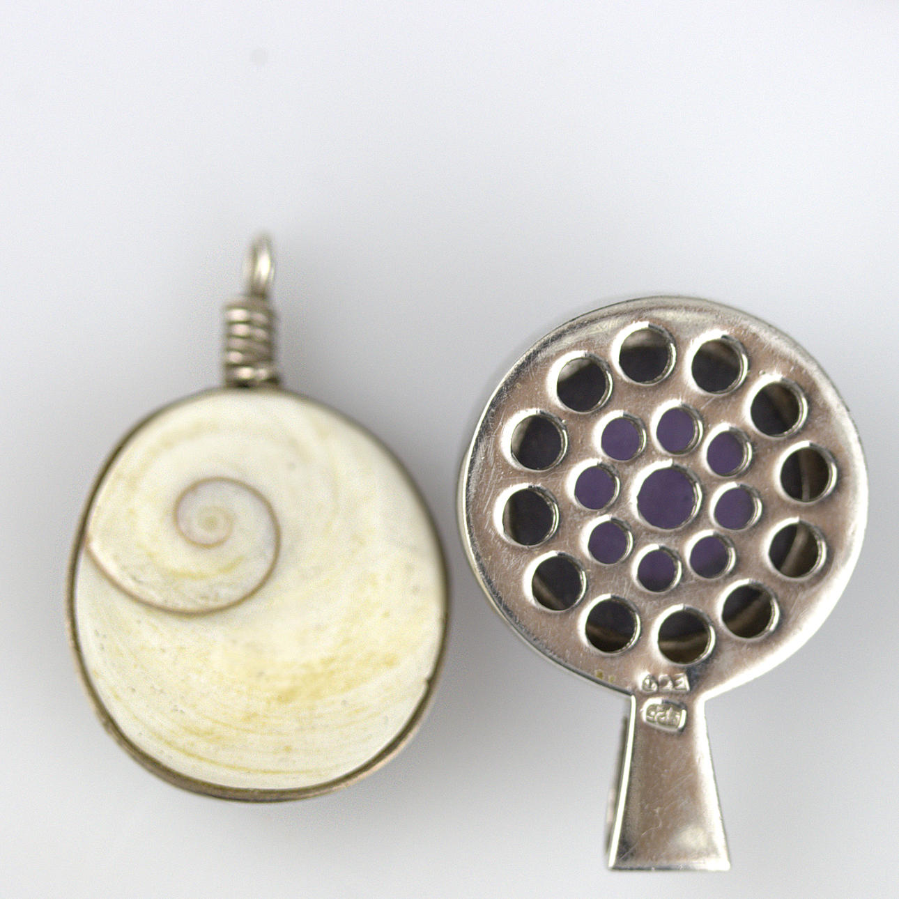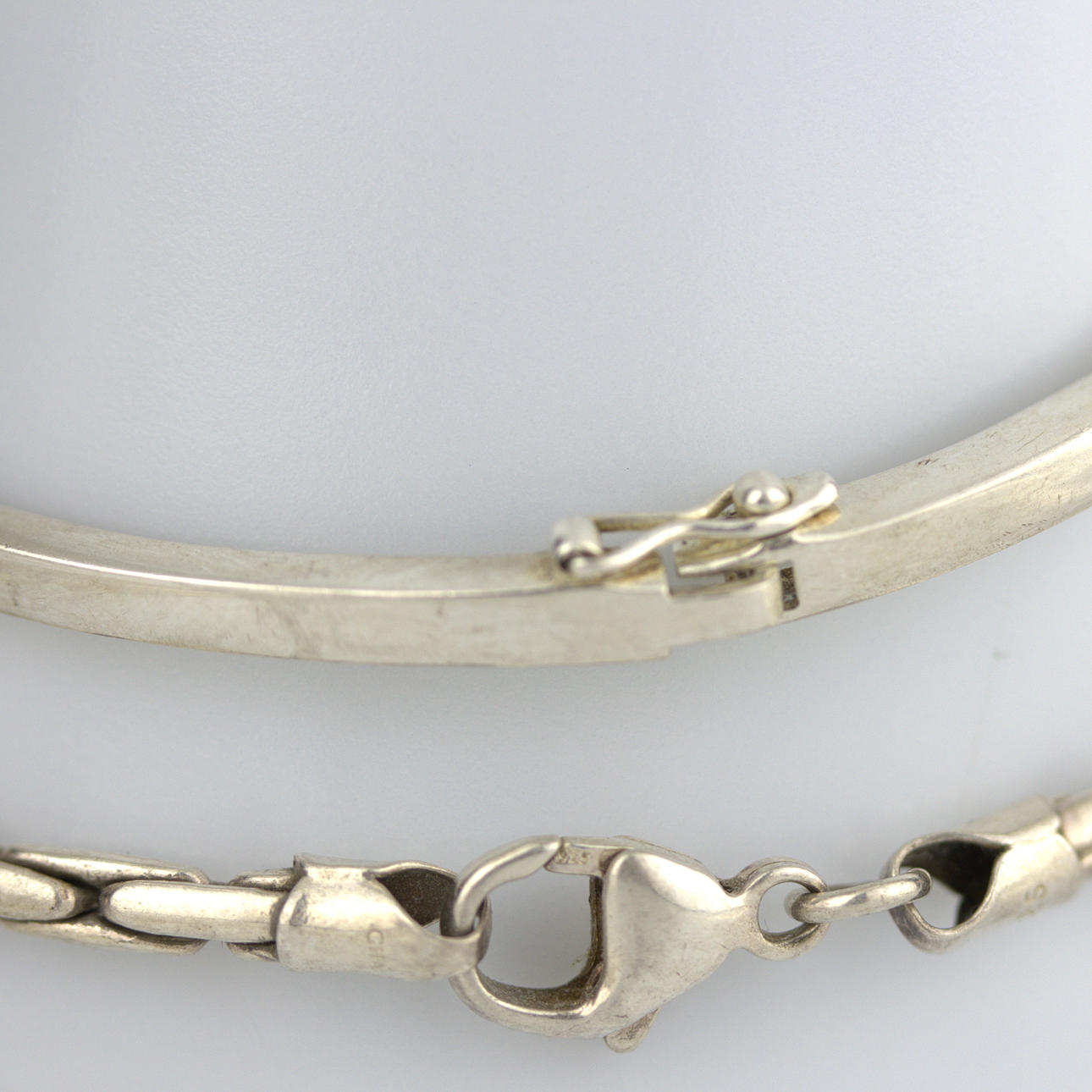 Bracelet chain 19,5 cm Bracelet rigid, openable Pendant with amethyst approx. 30 x 21 mm Pendant with agate 32 x 20 mm, (probably silver, not stamped) 1 chain 68 cm 4 snake chains different thickness 40 cm Weight silver 58,8 gr. Weight of pendants 22 gr. Condition Nice working condition. 36443