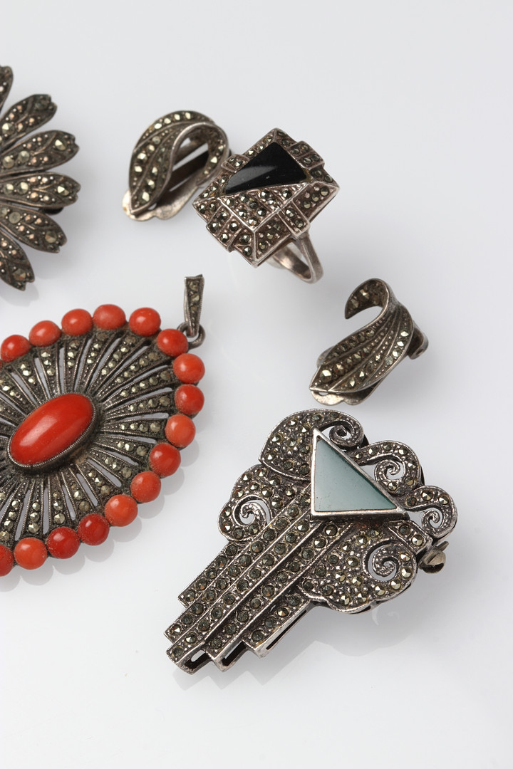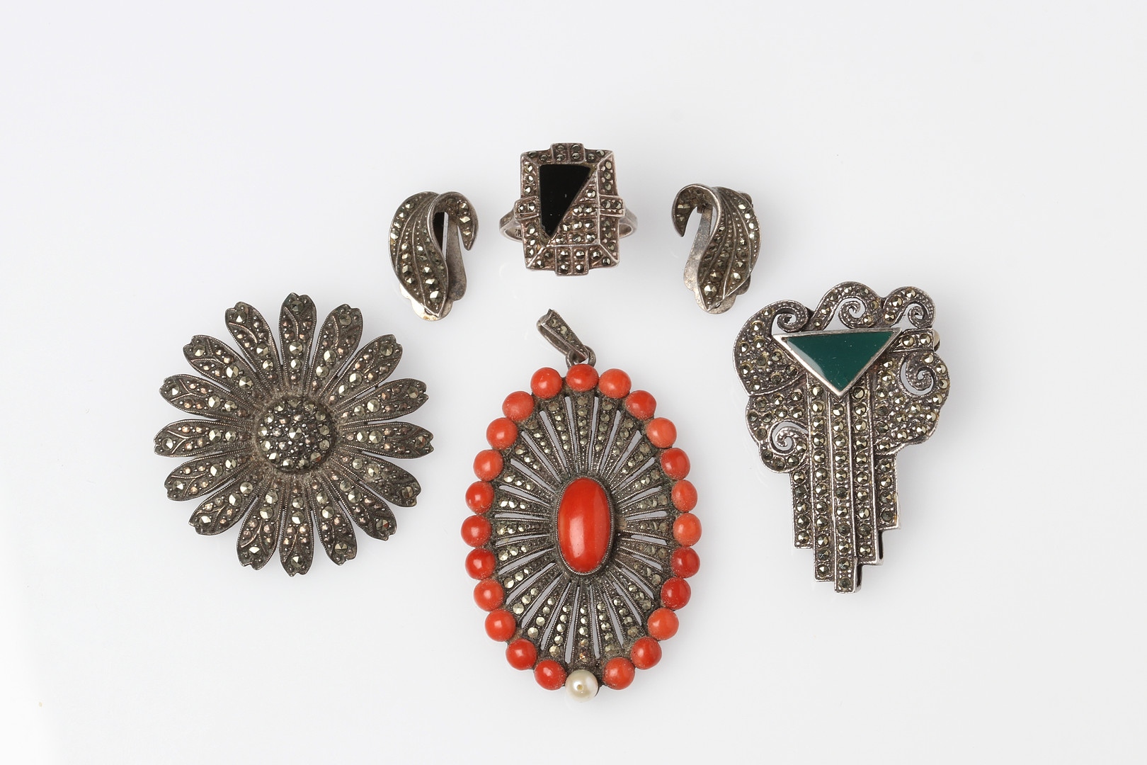 SILVER JEWELLERY, FIVE PCS. Silver with marquisites, noble coral etc., Art deco etc.