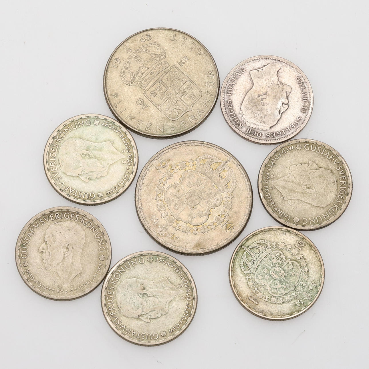 1-crown 1903, 80% silver, 7.3 g. 7 coins, 40% silver, 63 g. Pocket watch in silver, 36,4 g. Pendant, ring & bracelet in silver, 21,5 g Silver spoon, 28 g. Condition Condition of use. Pocket watch did not work at the time of cataloging. 12518