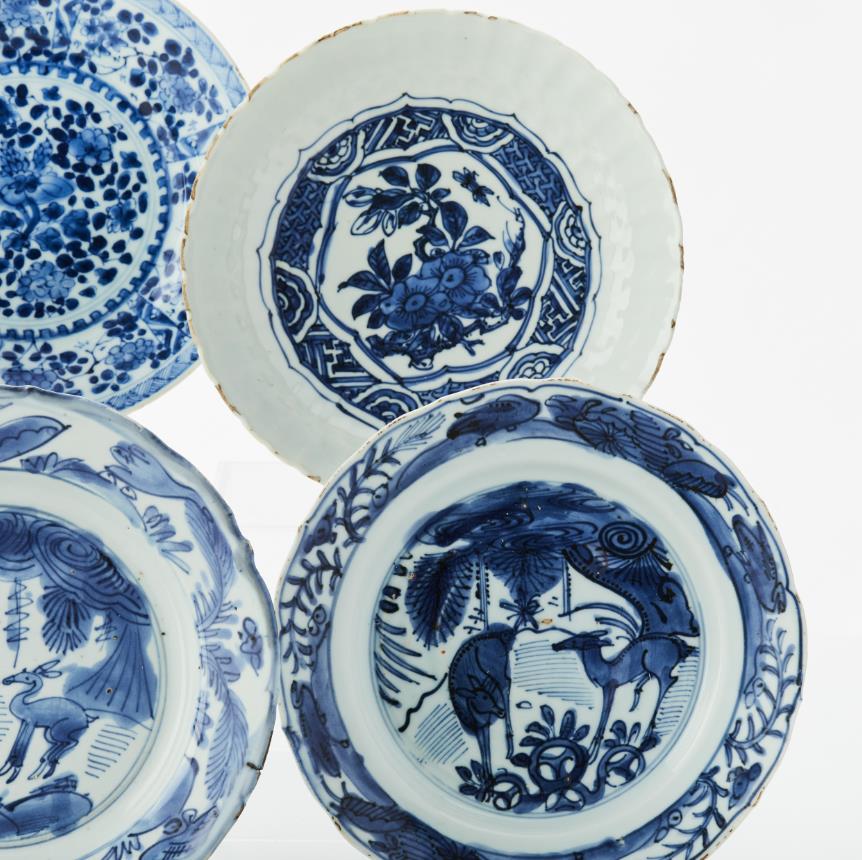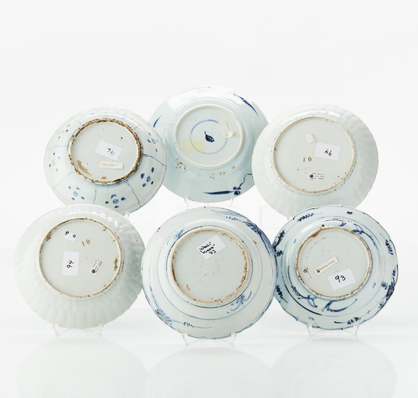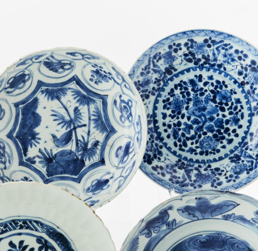 Six Chinese Blue and White Dishes Each of circular form and decorated in various shades of underglaze blue, comprising: a dish with deep moulded sides, painted to the centre with a peach; one with moulded sides and painted to the centre with flowers within a quatrefoil cartouche; two with a design of two deer; one painted with dense peony scroll, and one with with ten petal shaped panels. Period: 16th and 17th century. Diameter: 20‑21.5 cm. PROVENIENS Johanne Huitfeldt (1932‑2023).