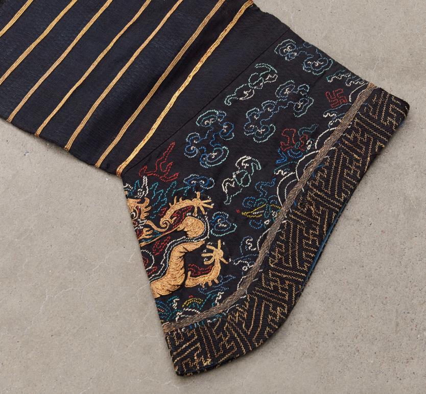 Coat and sleeves China, late Qing (1644–1912). Profusely embroidered with five-clawed dragons in metallic thread, the burning pearl is chased among clouds over a stormy sea (L 139 cm). Two loose sleeves included (L 48 cm). CONDITION REPORT Wear. Stains. Yellowing. Insignificant minor damage may occur. Probably shortened sleeves on the coat. 78999