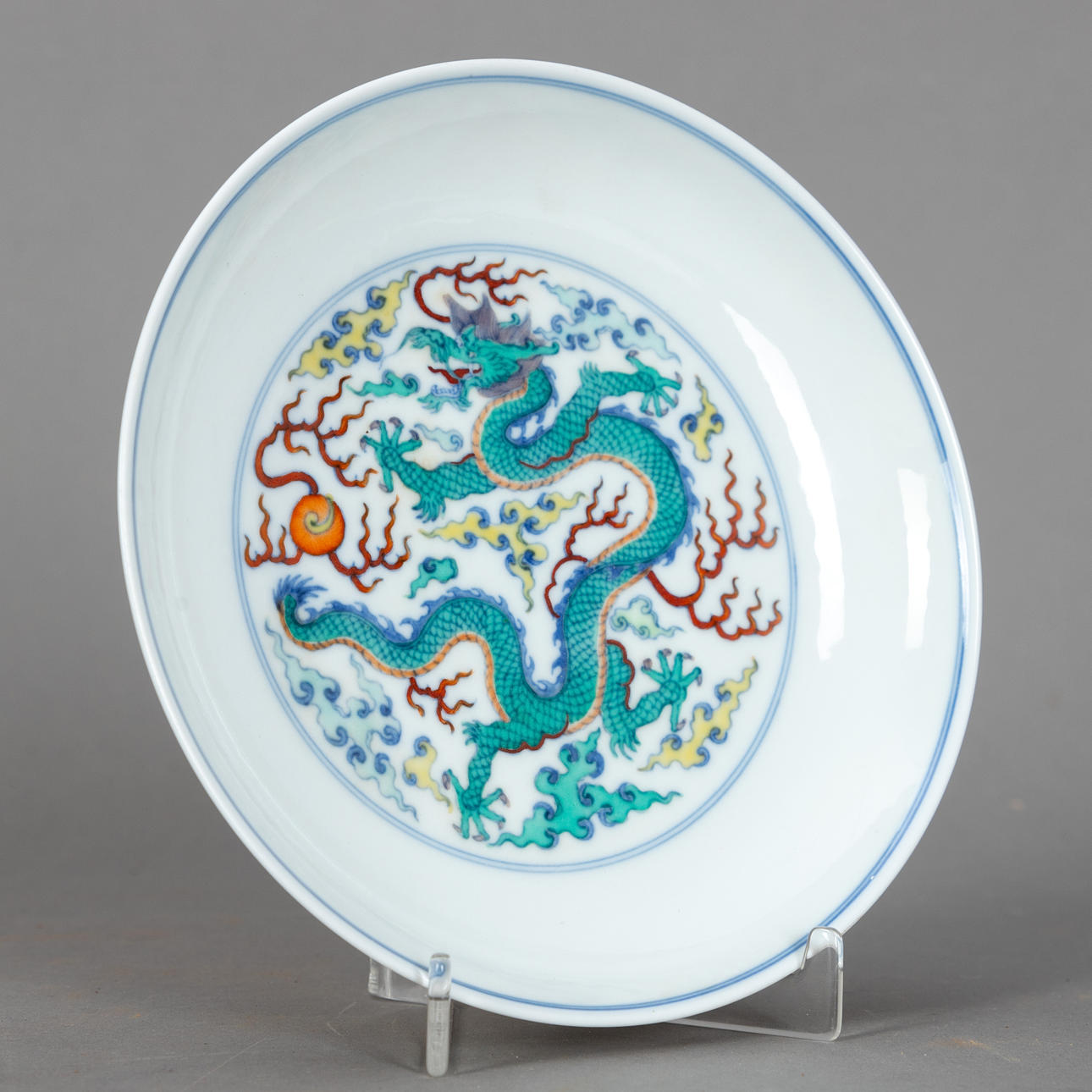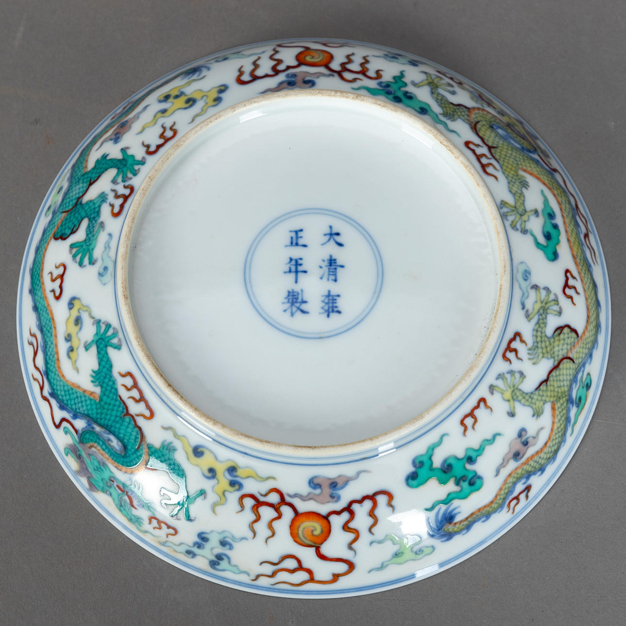 Stoneware, underglaze blue and overglaze painting. In the mirror and outer wall depicting 'flying dragons between coral-red flames and coloured clouds. ' Six-character mark: da qing Yongzheng nian zhi in double ring HxDM. cca 3.2 x 17.4 cm. Condition Minimal signs of age. 29080