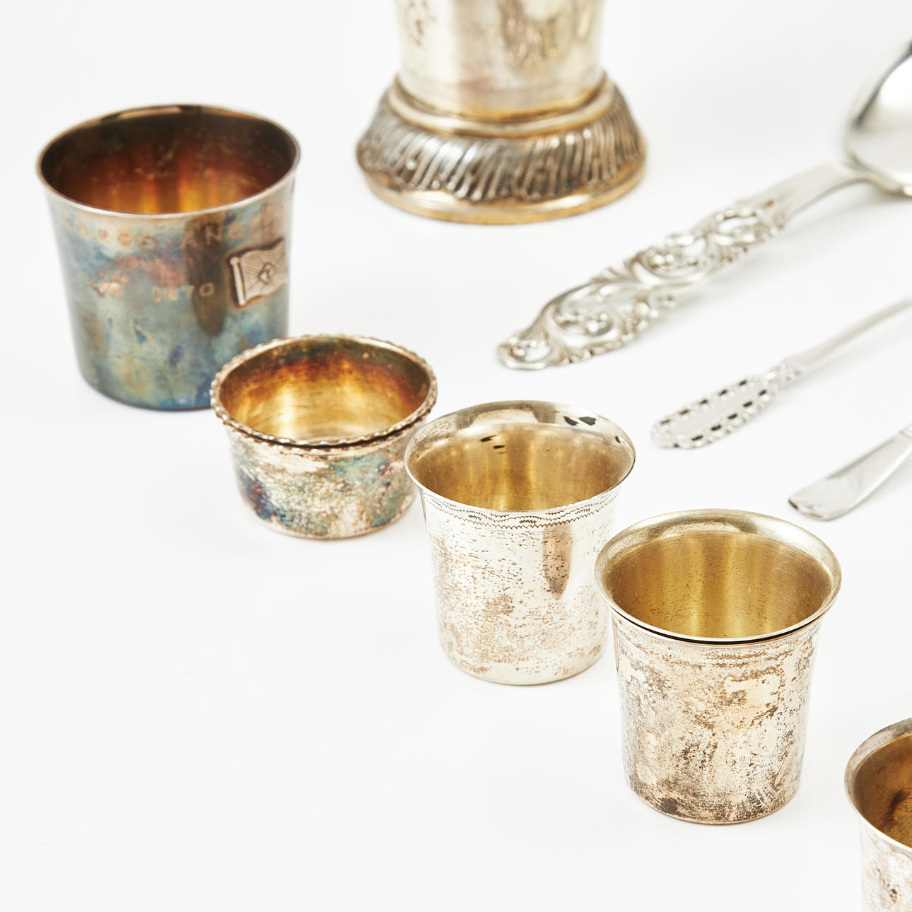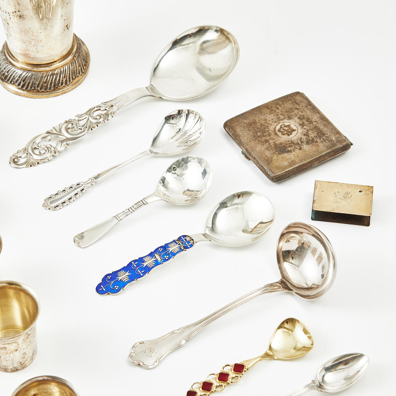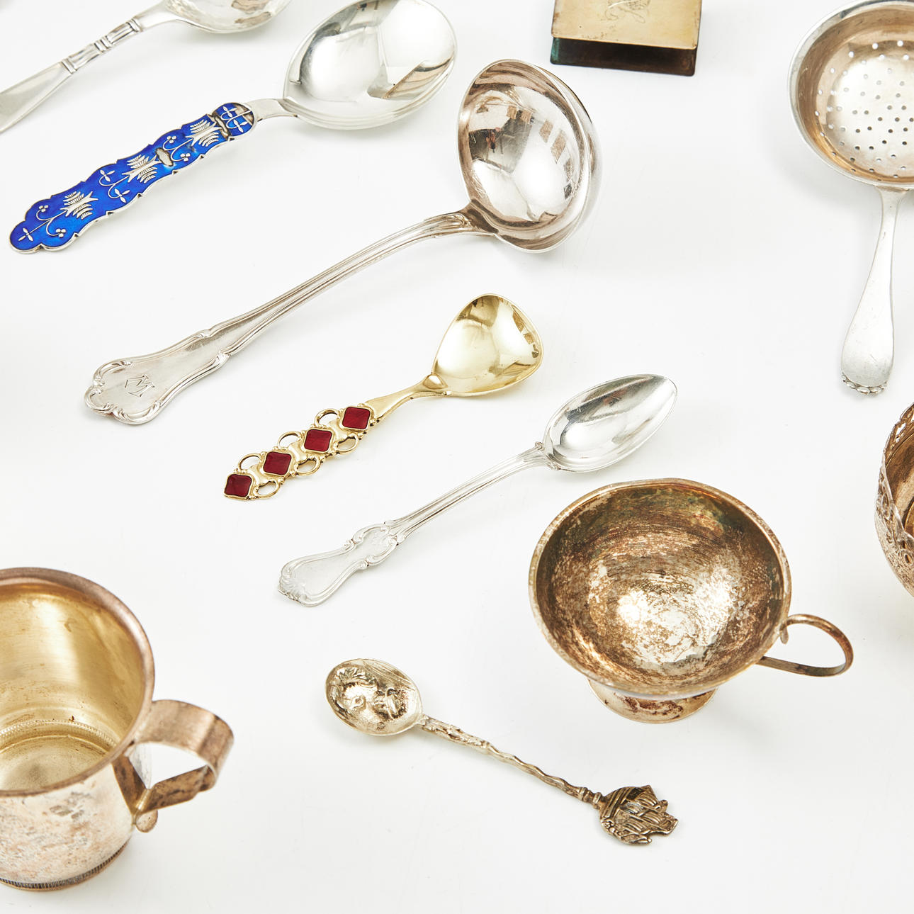 SPOONS, A TEA STRAINER, A CIGARETTE CASE, silver, 20th century.