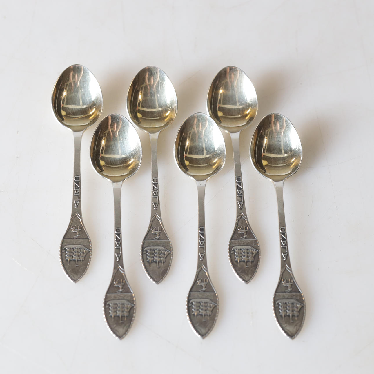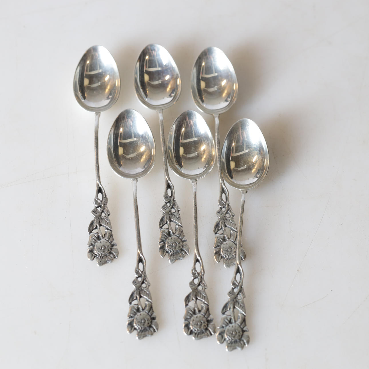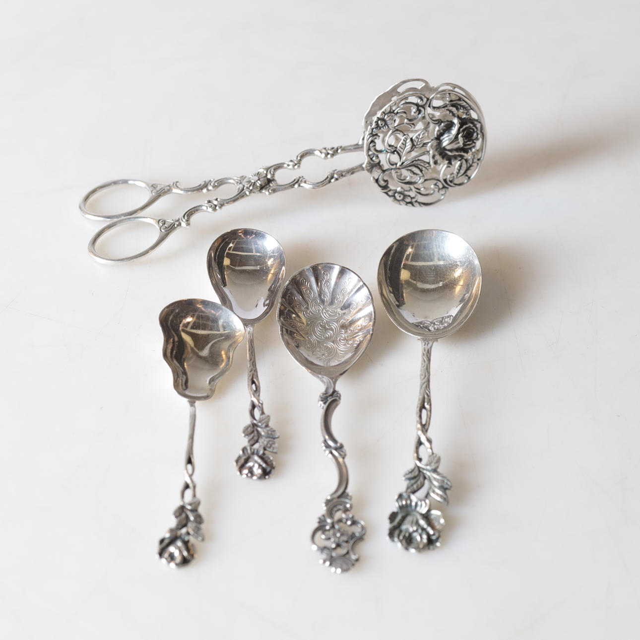 Spoons, length about 10—16 cm. Cookie tongs, length approx. 16,5 cm. Six spoons in a case, approx. 14 x 9 x 3 cm. Condition Normal wear and tear. 69926