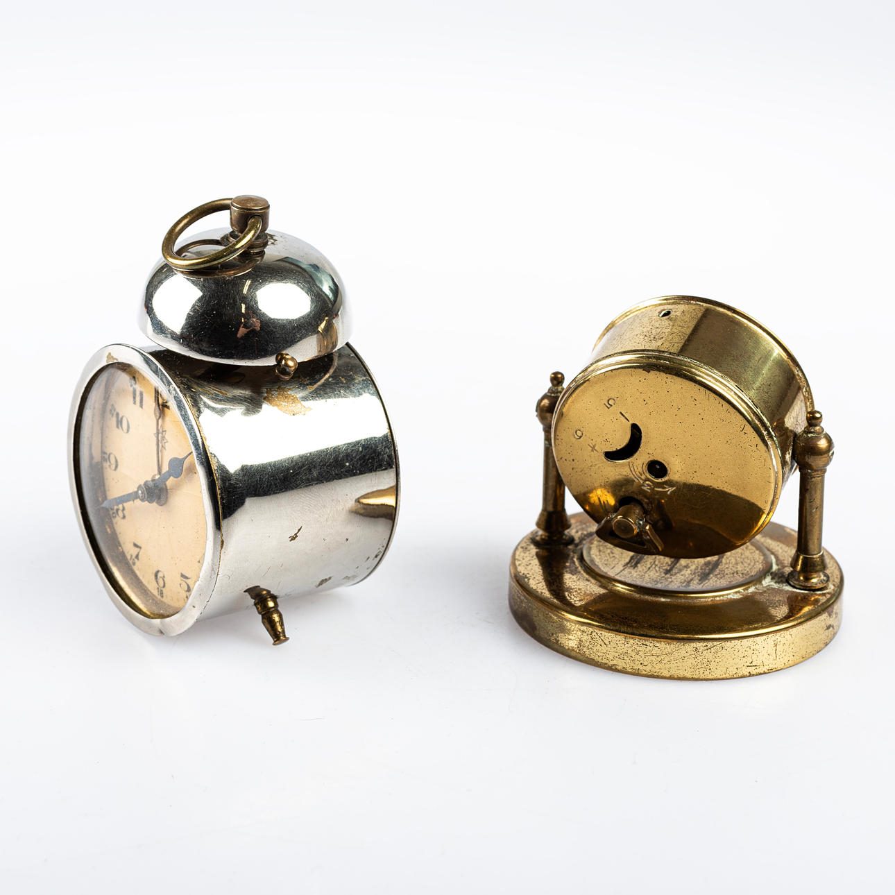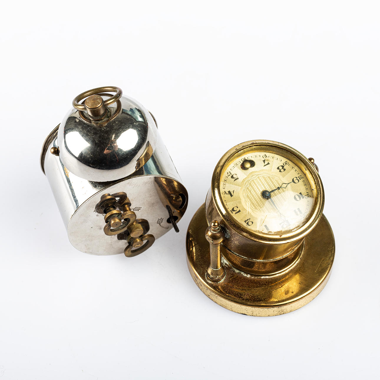 Heights: about 7 and 9 cm. Condition Normal wear and tear. Metal watch with crackle light on dial and badges. Function: Unknown. 15031