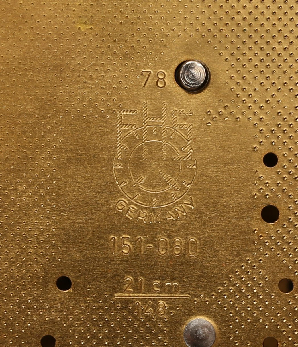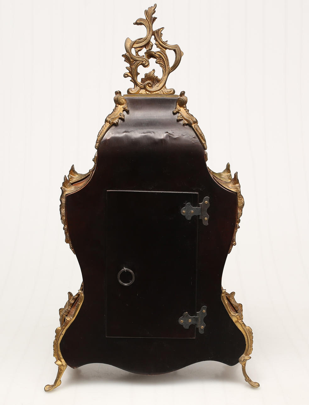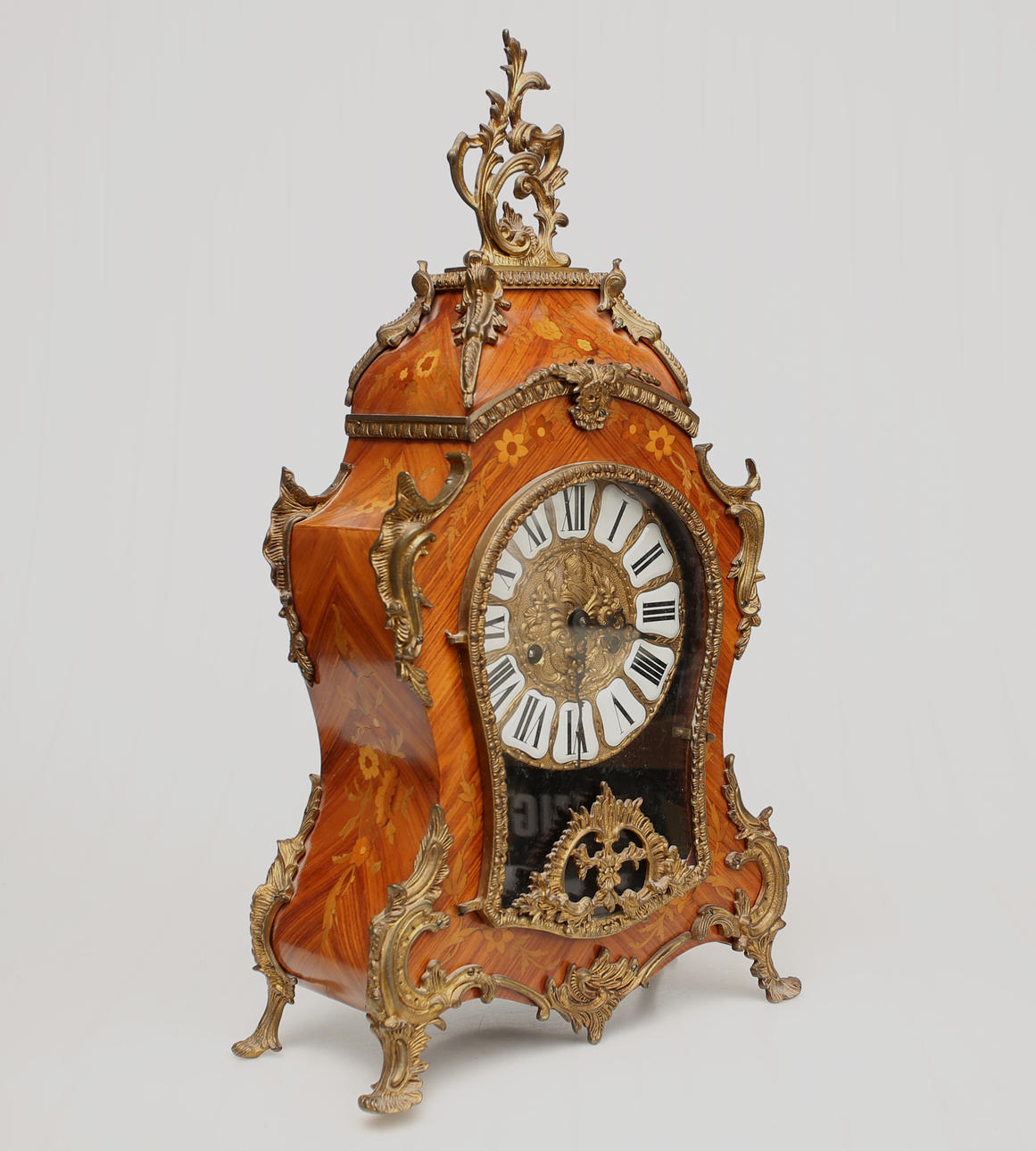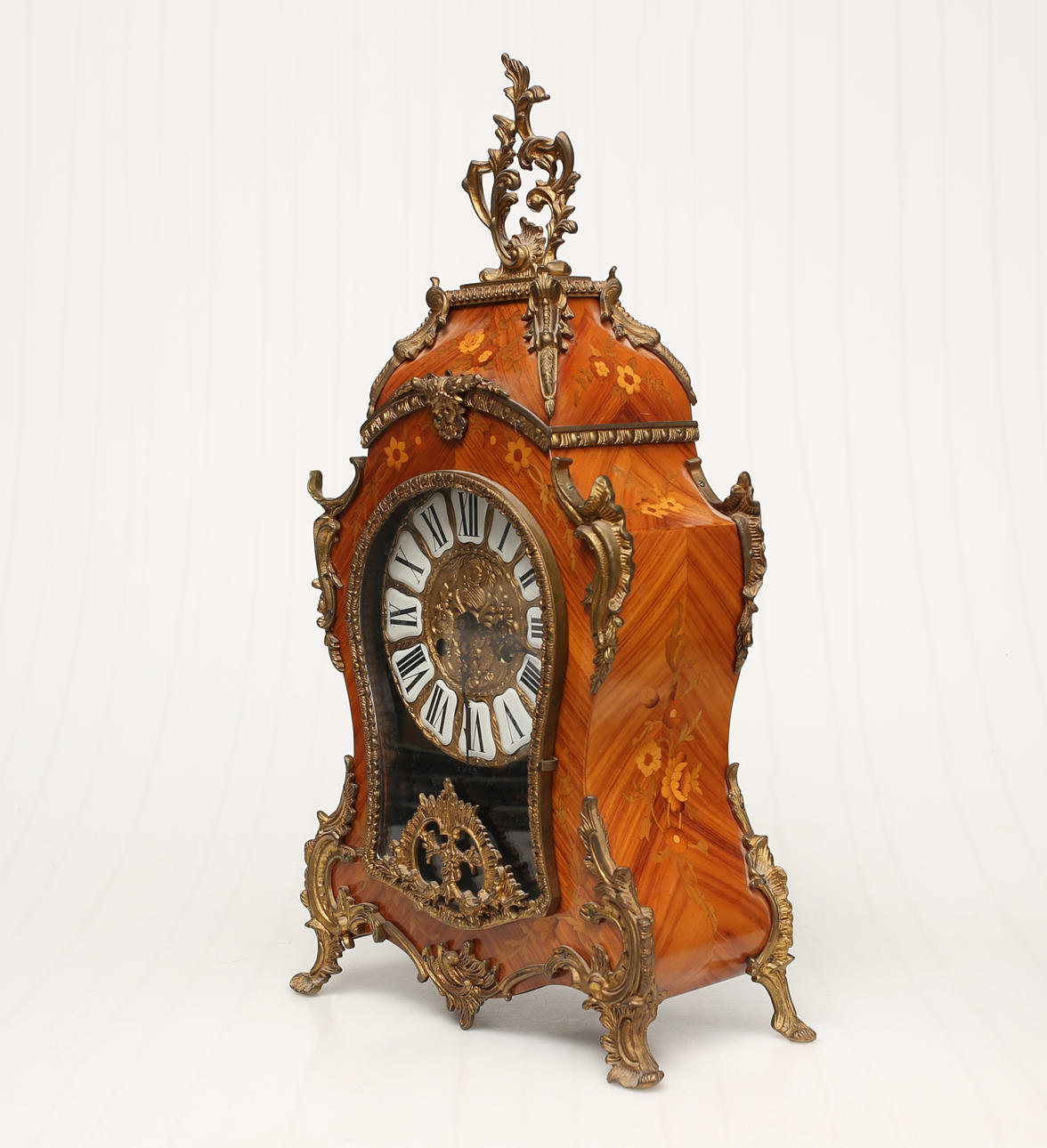 Manufacturing time mid 20th century. German-made clockwork, full and half stroke, wood of various shades have been carefully selected for the background veneer, and the floral motifs. The bronze fittings keep good quality, and show good sharpness. Height 57,5 cm. Width 31.5 cm. Depth approx. 14.5 cm. Condition The case's wood veneer and inlays have some fading in the surface, the gilded bronze mounts can show more luster, if they are carefully cleaned, properly. No functional warranty is provided. Key/keys included. 17649