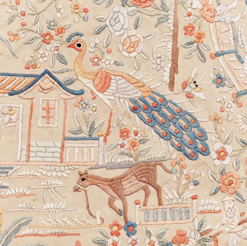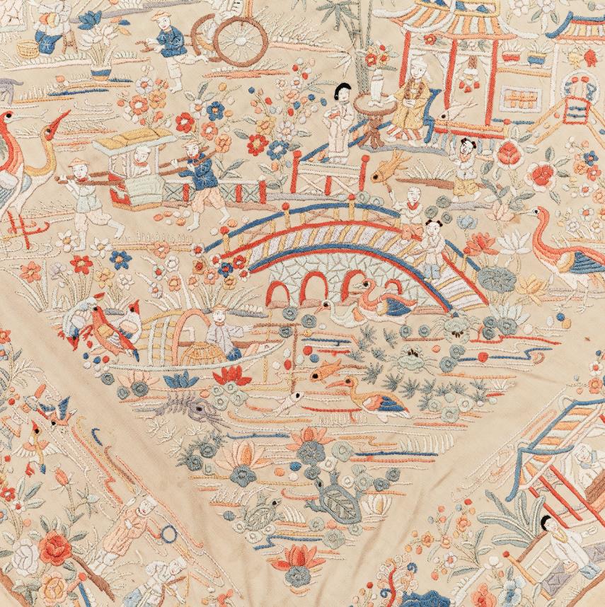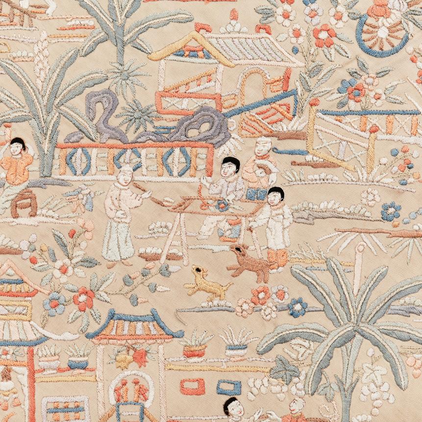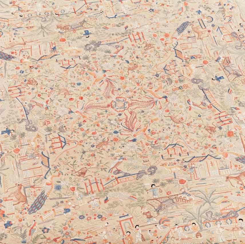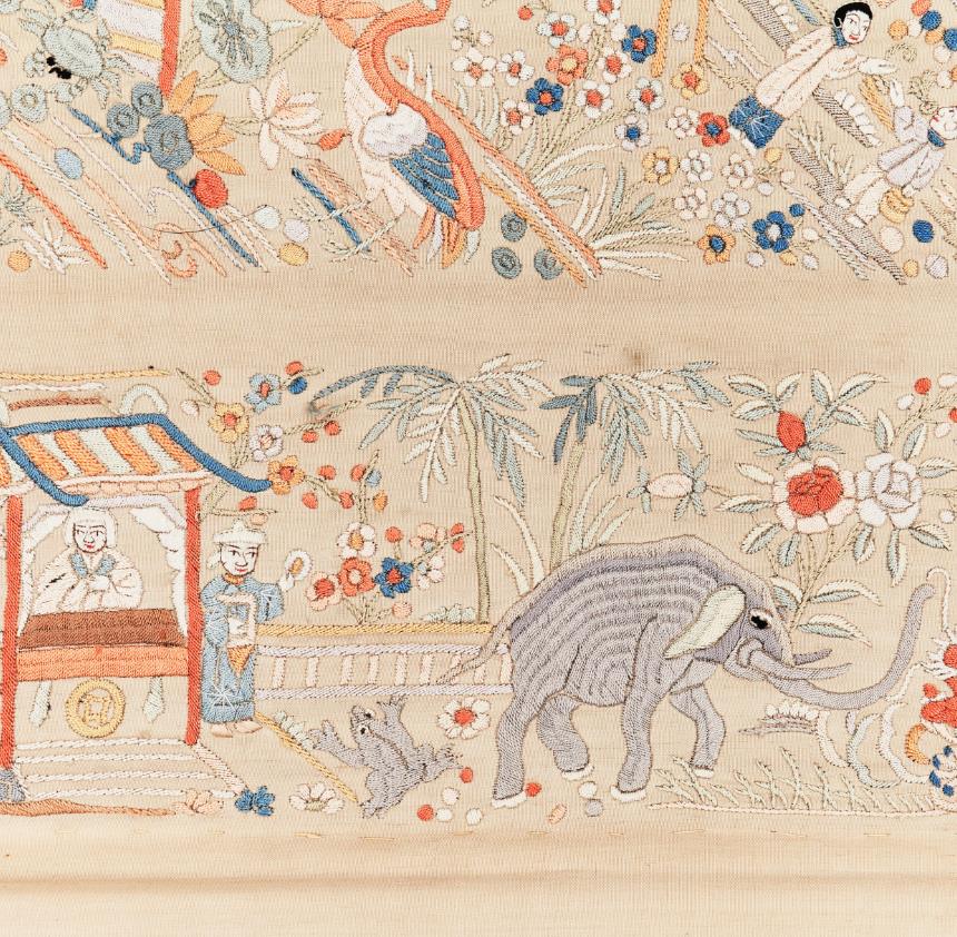 Richly embroidered with figure scenes. Approx. 140 x 140 cm. Condition report Minor stains. Faded. Singular damages may occur.