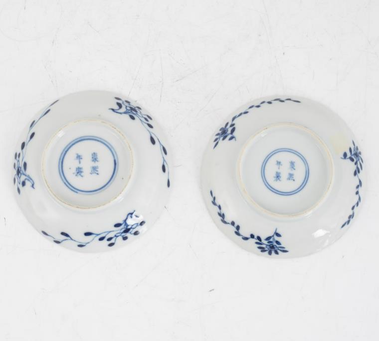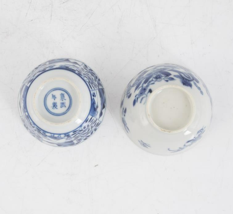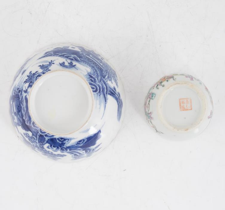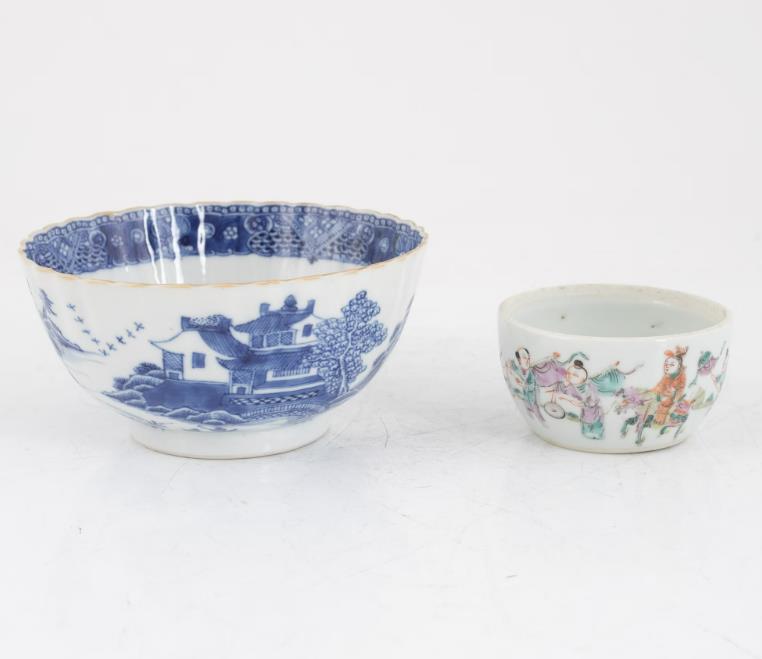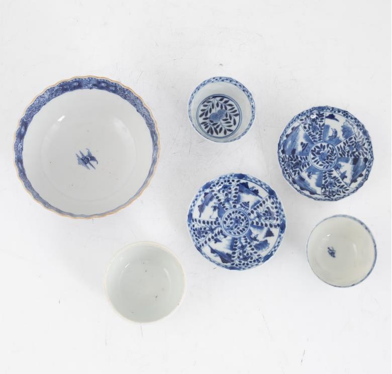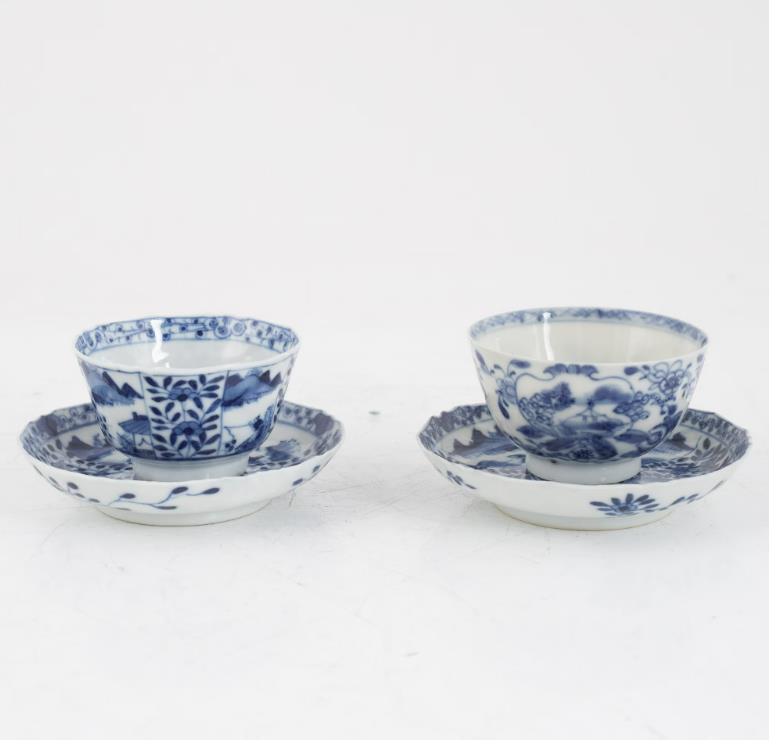 China, Qing Dynasty, 1700s and 1800s. Decoration in underglaze blue. A cup and the saucers with motifs of foliage and reserves containing landscapes, Kangxi's mark but 1800s, the height of the cup 4.2 cm, the diameter of the barrels about 10.5 cm. Cup with motif of flowers and pomegranate-shaped reserve containing landscape 1700s, height 4.3 cm. Bowl with decoration in underglaze blue with motifs of pagodas in landscapes, 1700s, height 7, diameter 14.5 cm. Bowl with decoration in famille rose with motif of figure scene, 1800s, height 4.5, diameter 8.2 cm. Wear. Small nibbles. One cup (the one with flowers) with crack.