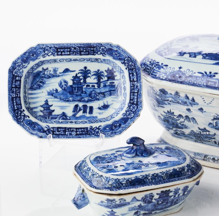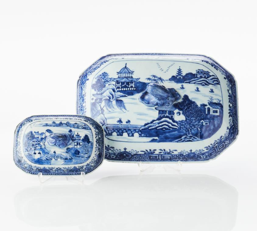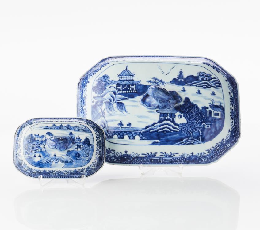 Terrine with lid, and butter terrine with lid and saucer Porcelain. China, Qianlong (1736–1795). Decoration of river landscape in blue and white underglaze. L 19 & 34.5 cm. Condition report Wear. Notch. Manufacturing defects. The saucer of the butter terrine with a crack, the lid contemporary but originally probably not belonging.