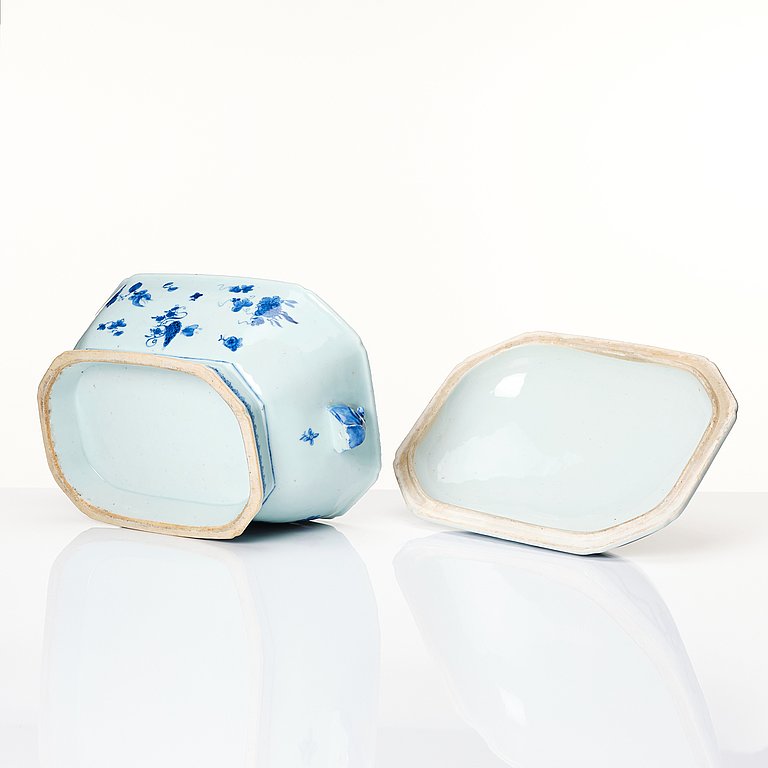 Octagonal with hare head hooks and acanthus cap knob, decoration in underglaze blue with flowers and floral garland. Length 36 cm. Height 24 cm. Burning defects. 006529