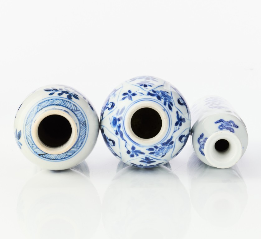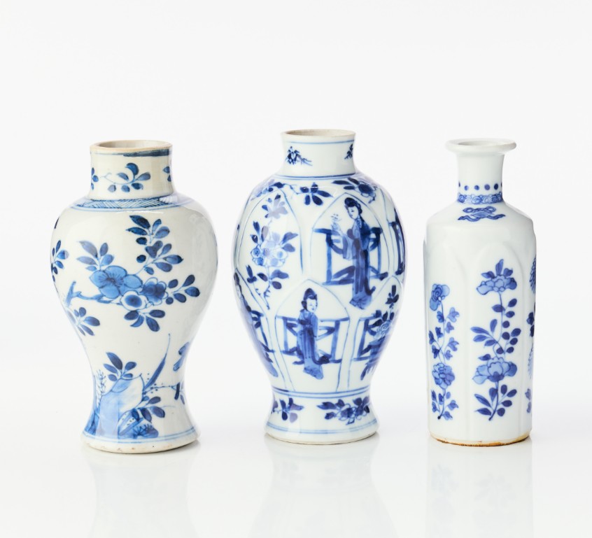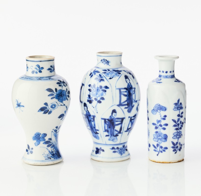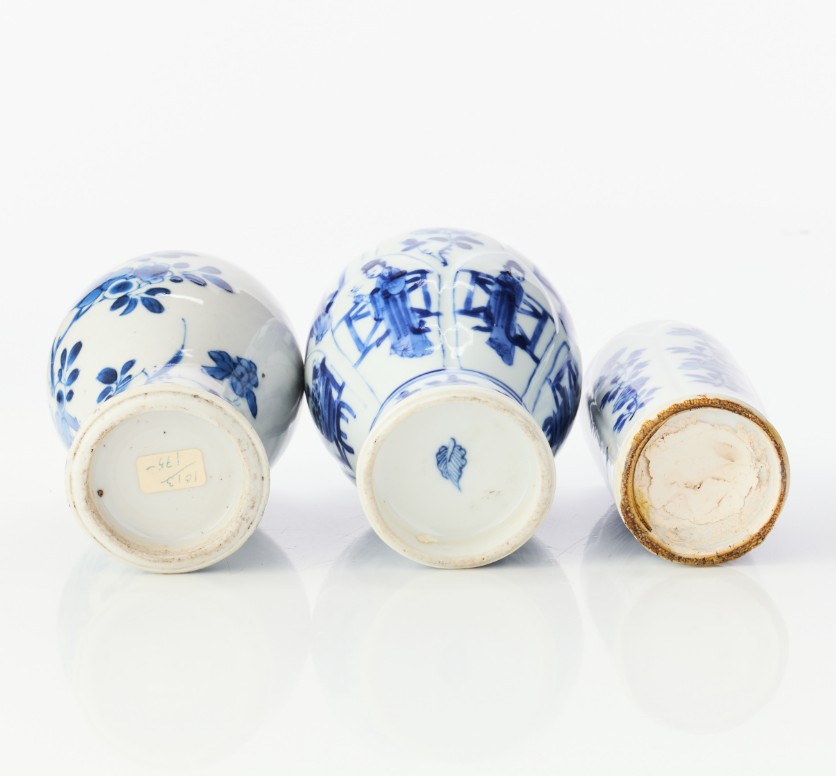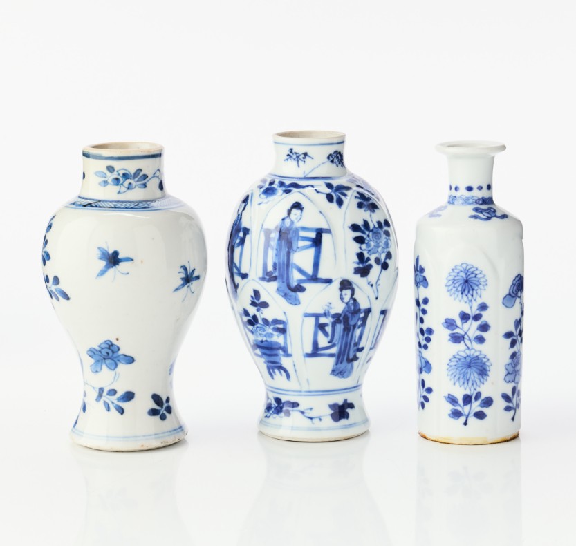 Three Chinese Blue and White Porcelain Vases The base of one with an artemisia leaf. Period: Kangxi (1662-1722). Height: 12-12.8 cm. Konditionsrapport The base of the cylindrical vase restored. A crack and restoration to the rim on the baluster-shaped vase with a flowering tree. Two missing cover.