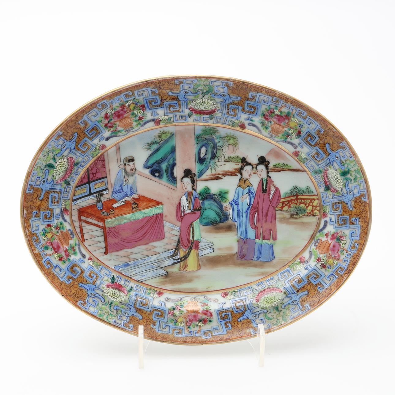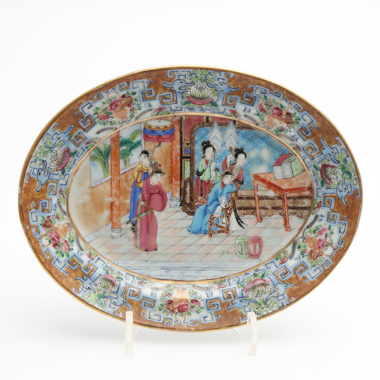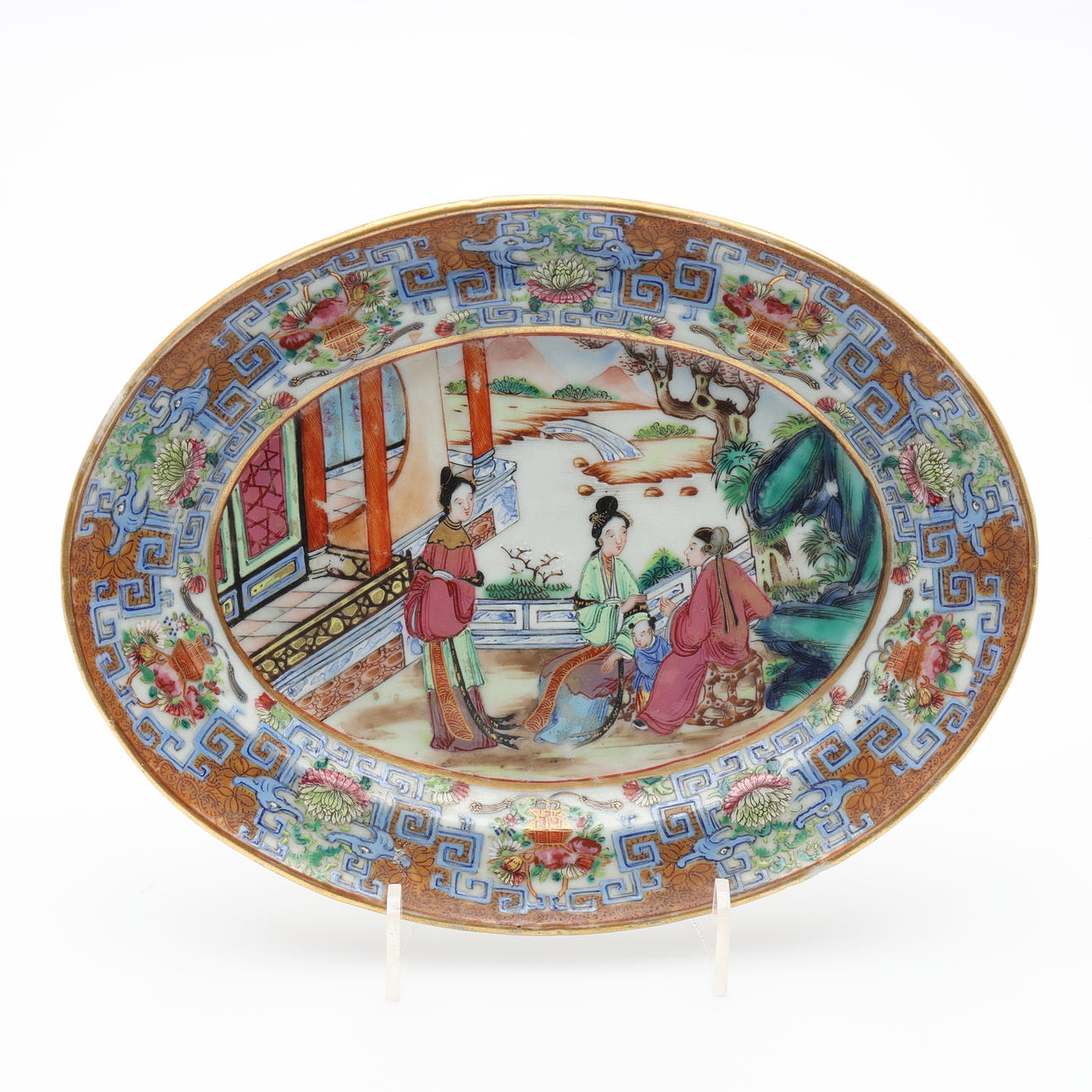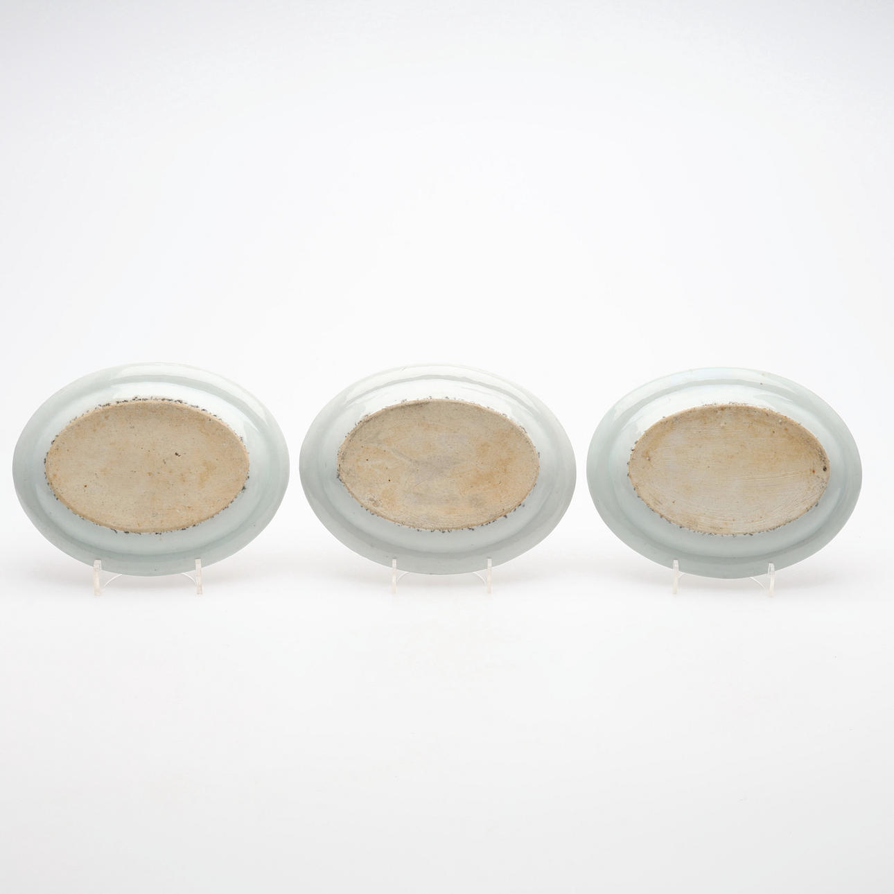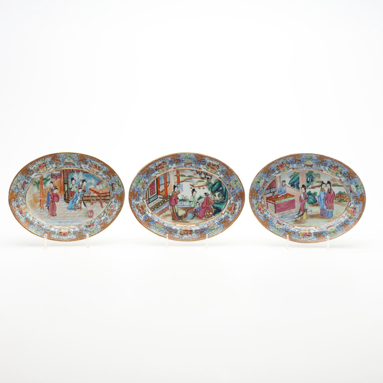 China, canton rose, porcelain with enamel painting depicting figure scenes in parlandscape/palace setting. Tongzhi (1862—1874). Length 19.7, 20 and 20.1 cm. Condition Some wear and tear. 135081