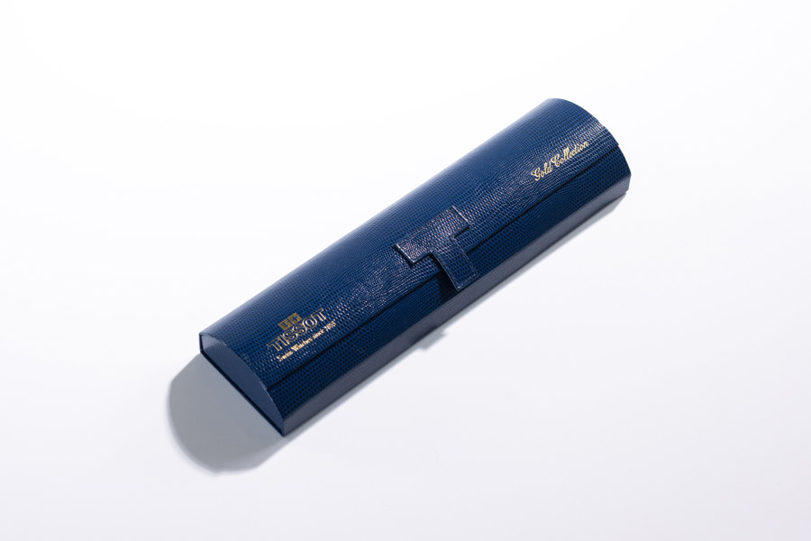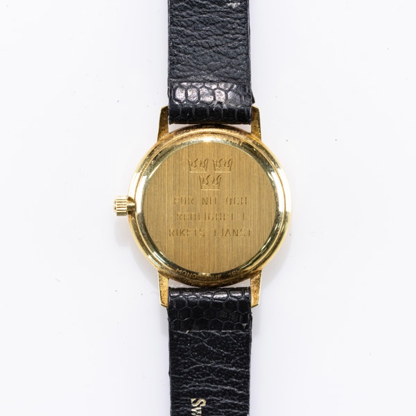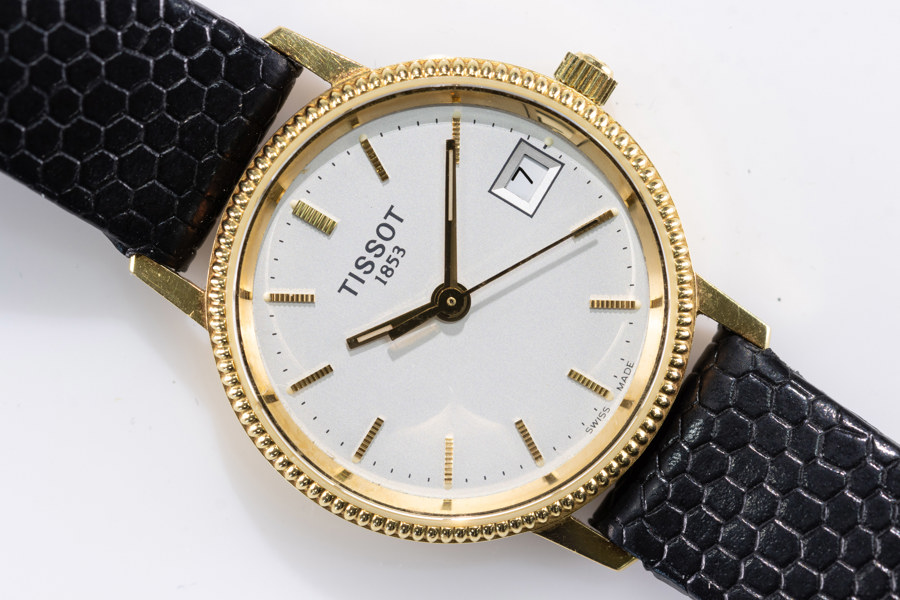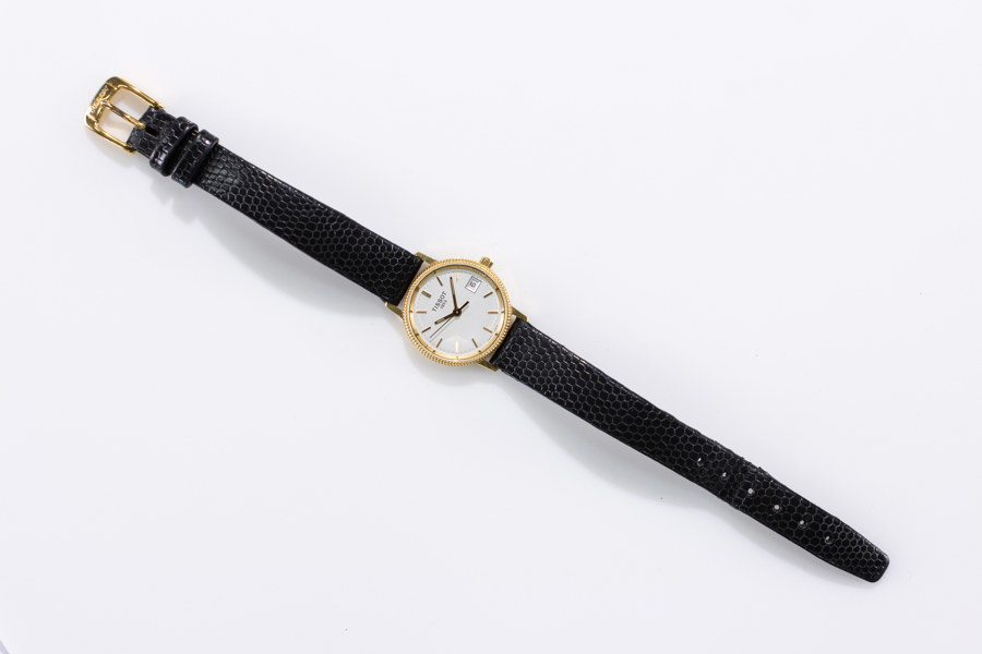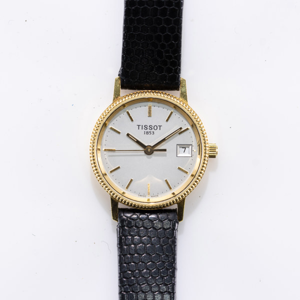 Ladies' wristwatch, Tissot, 24 mm, 18k gold, circa 1999 Case Approx. 24 mm (29 mm lug-to-lug), 18k gold, monocoque case (Engraving; "For diligence and honesty in the service of the kingdom"), signed crown, sapphire crystal Dial/hands Light dial, applied gold-colored bar indexes, date display at 3 o'clock, gold-colored hands with luminescent material Movement Quartz Strap/link Black leather strap with lizard embossing, 12 mm, gold-plated Tissot buckle, original Accessories Comes with original Tissot box Gross weight 17.1 grams Condition:Apparently working, minor wear from use