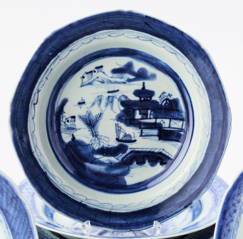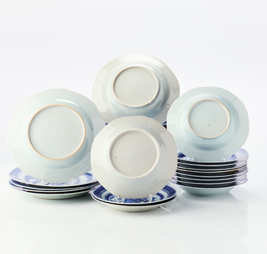 Twenty-Nine Chinese Blue and White Porcelain 'River Landscape' Plates and Dishes All of similar pattern but assembled, comprising: twelve soup plates; nine deep dishes; five dinner plates; and three dessert dishes. Period: 19th century. Diameter: 19.5-23 cm. Konditionsrapport Wear. Chips. Cracks. Repairs occur.