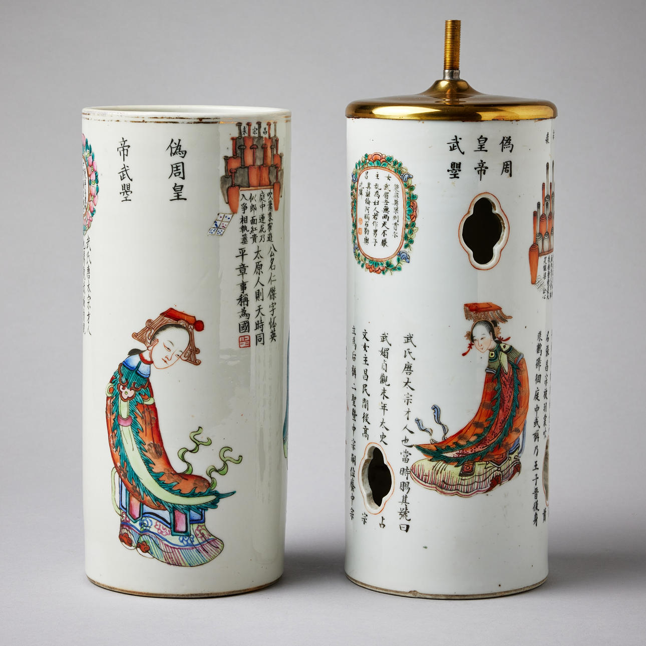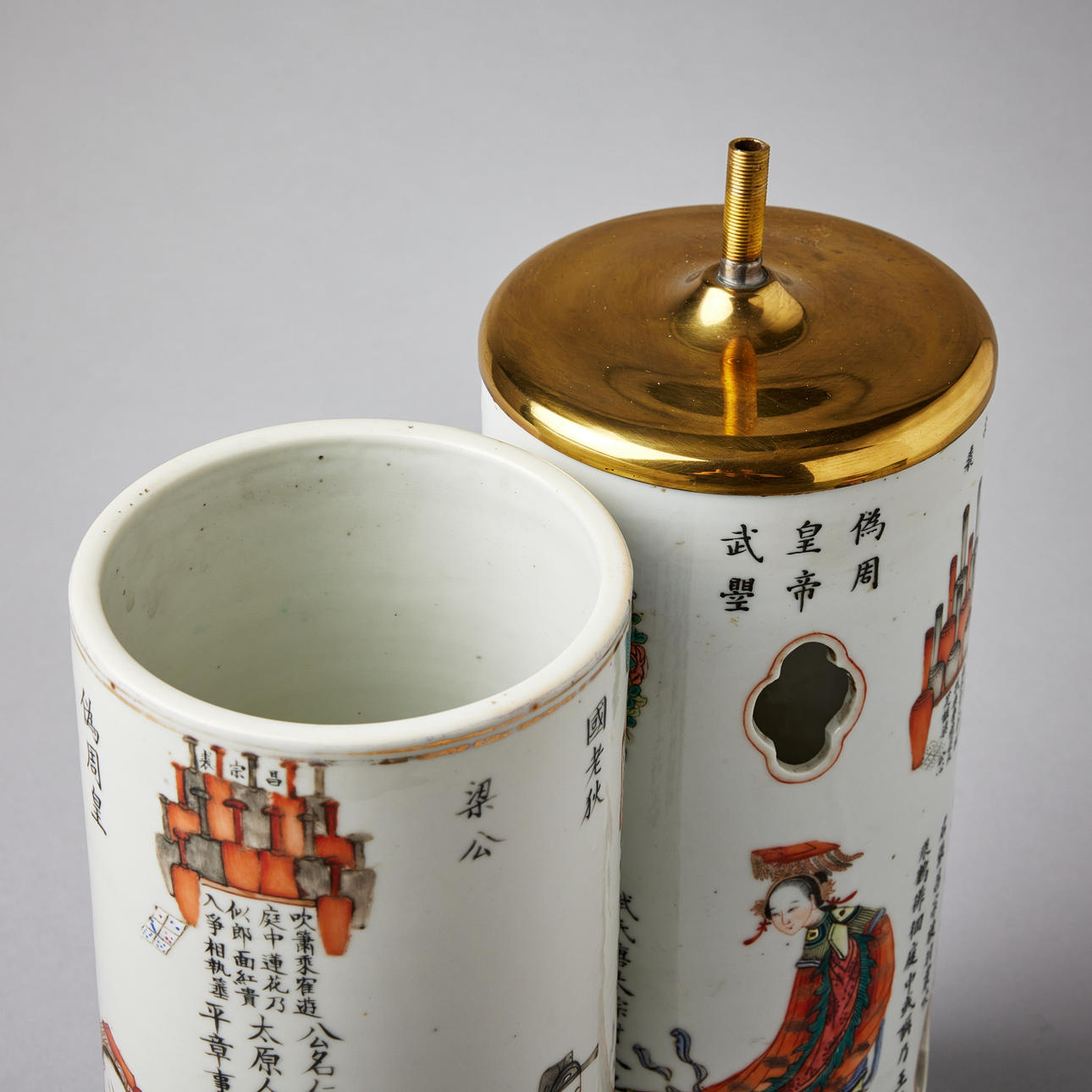 Decorated with actors and calligraphy, one with Tongzhi mark, 19/20th century, height c. 28 cm. Condition One mounted as a lamp. Wear and firing defects. No repairs found with UV-light. 35947