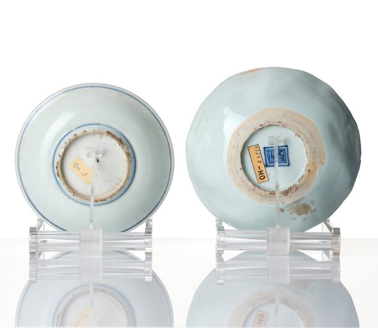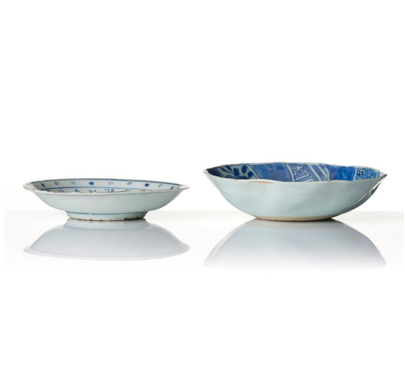One decorated with flowers and stylized patterns. Diameter 16 cm. The other dish decorated with trigrams, Chinese characters and circles. Diameter 14.5 cm. Chips. The larger dish with crack. Provenance From the collection of a Korean collector, scientist and a member of the Nobel committee. Thence by descent.