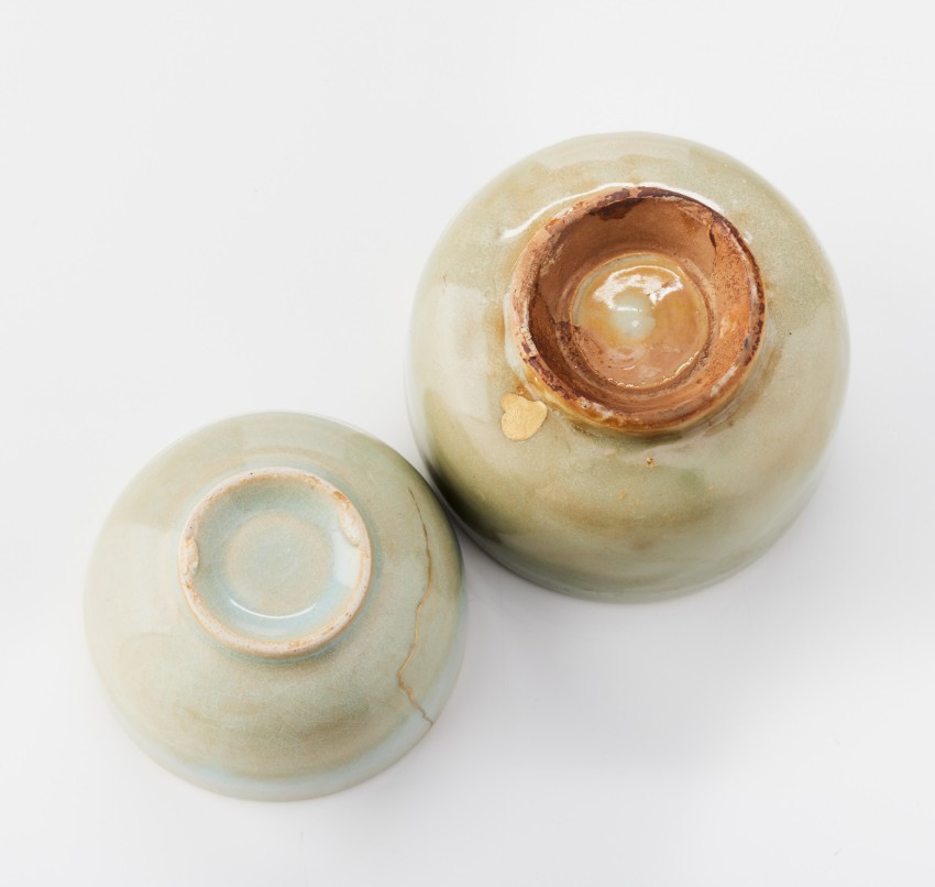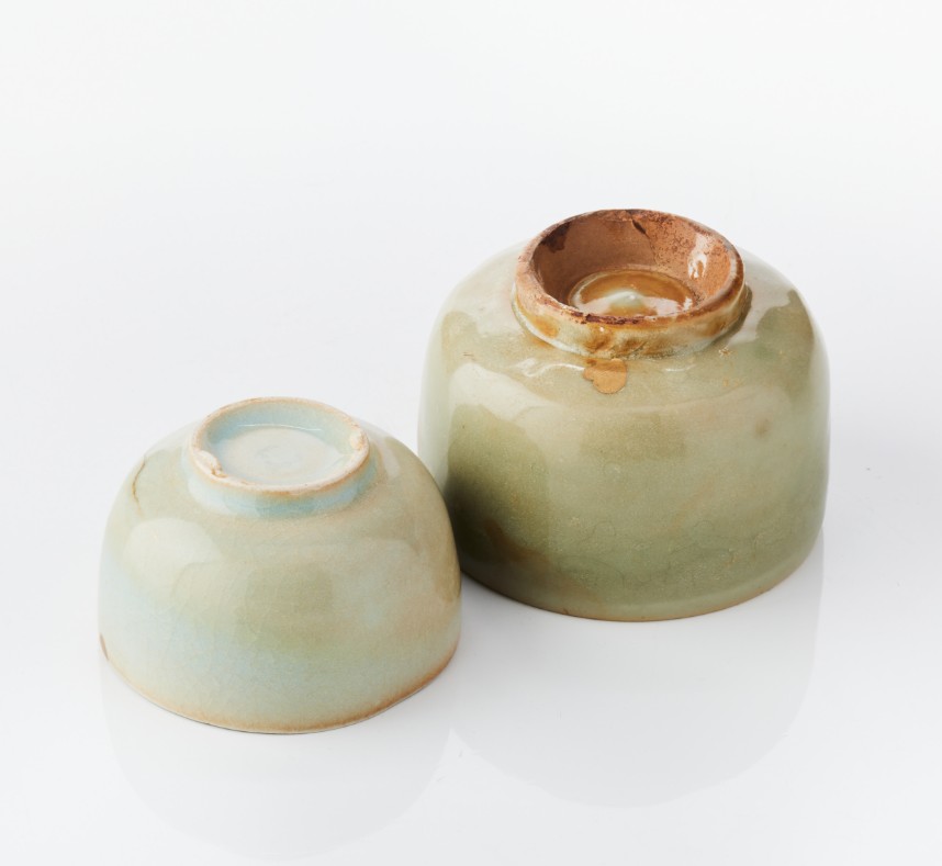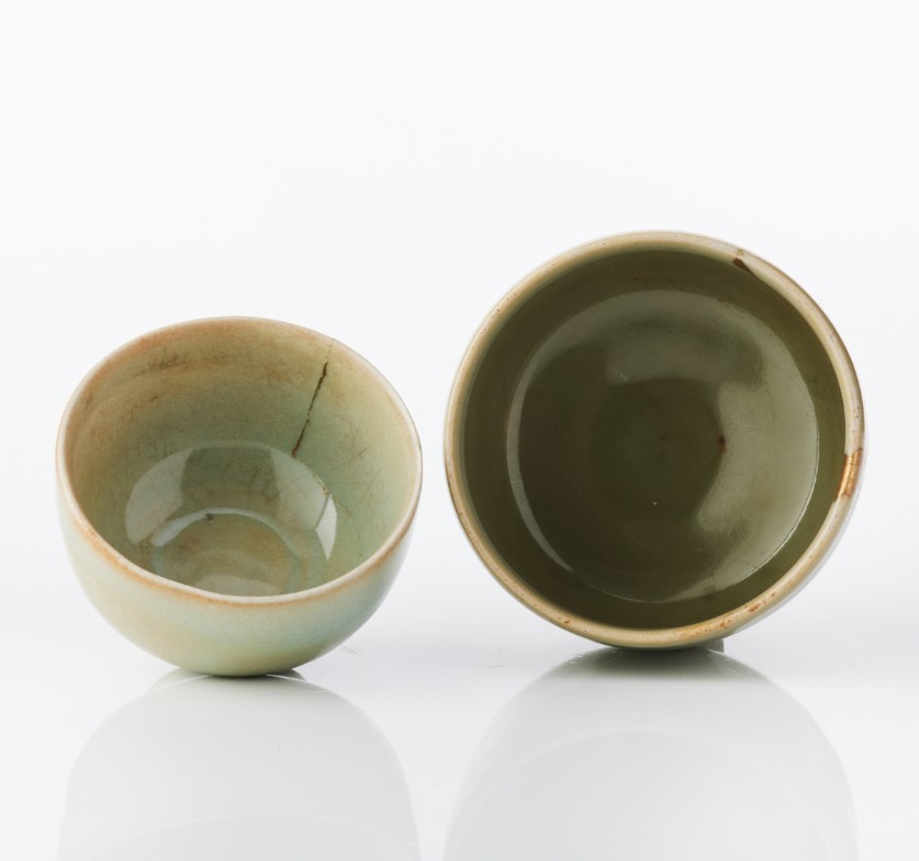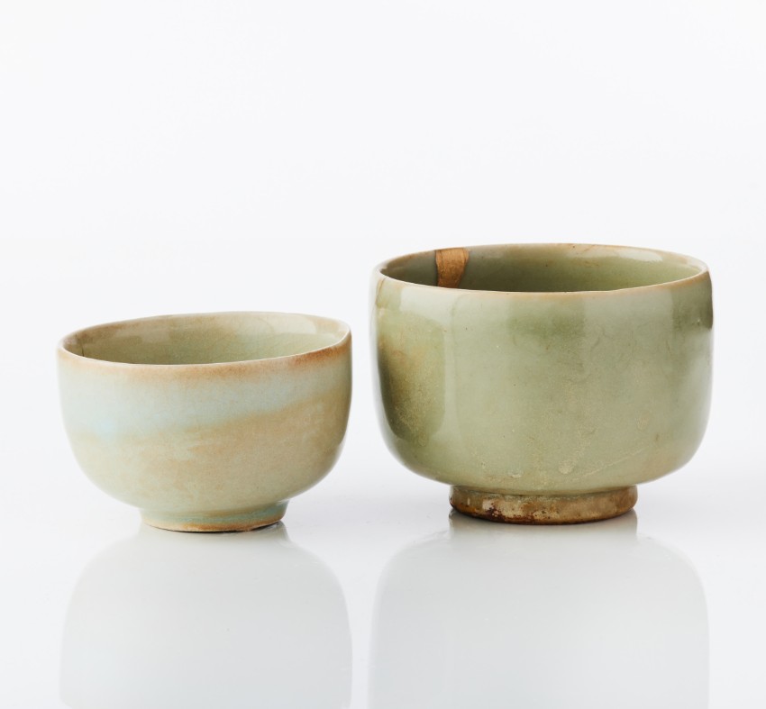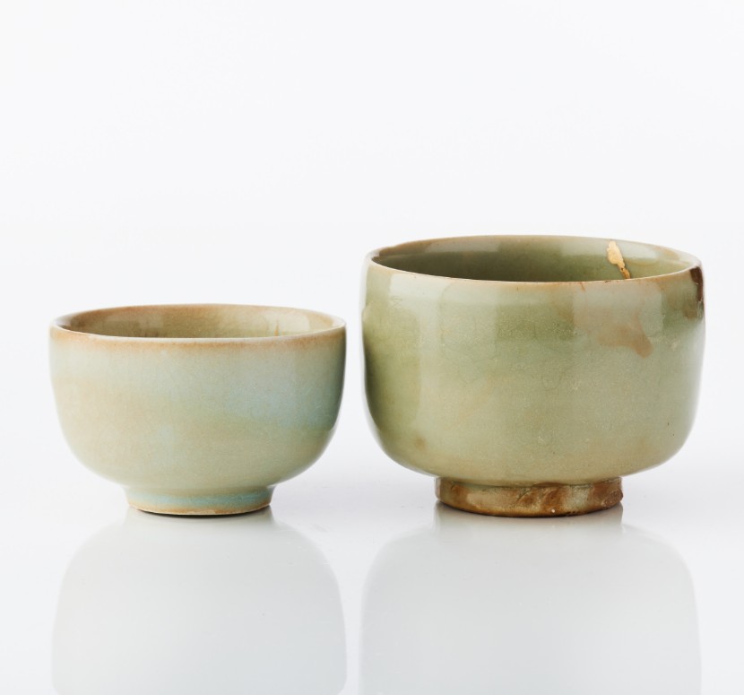 Two Chinese Bowls Each glazed in celadon-green, the smaller one in tones of blue. Height: 5.5 & 7.3 cm. Konditionsrapport Wear. Kintsugi repairs and damages.