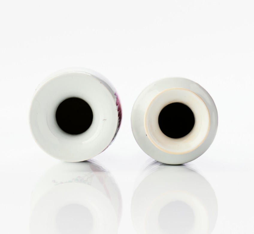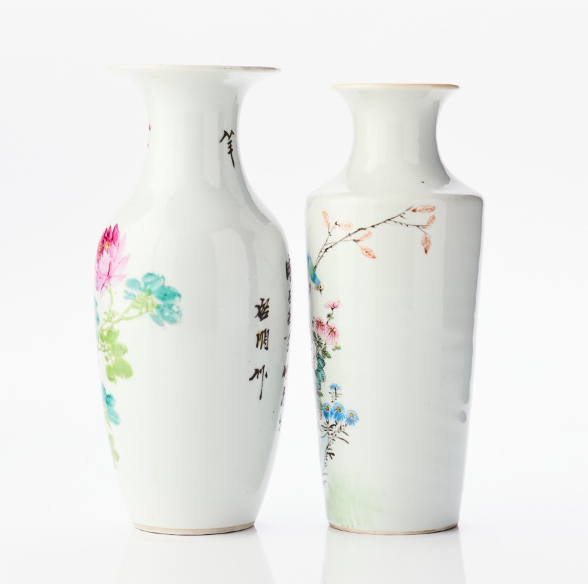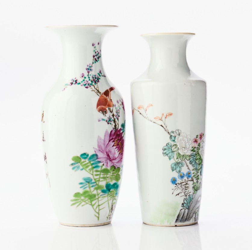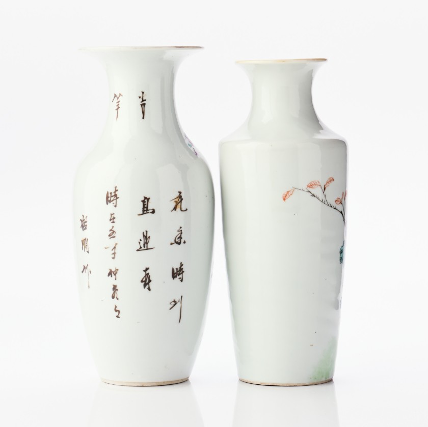 Two Chinese Famille Rose Porcelain 'Bird and Flower' Vases One with calligraphy, the base of which with a seal mark in iron-red. Period: early 20th century. Height: 25 & 26 cm.