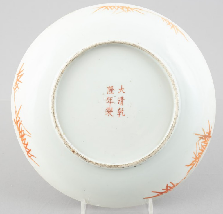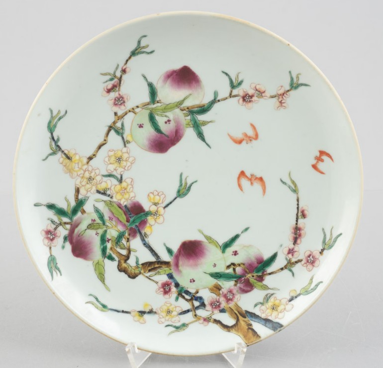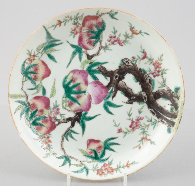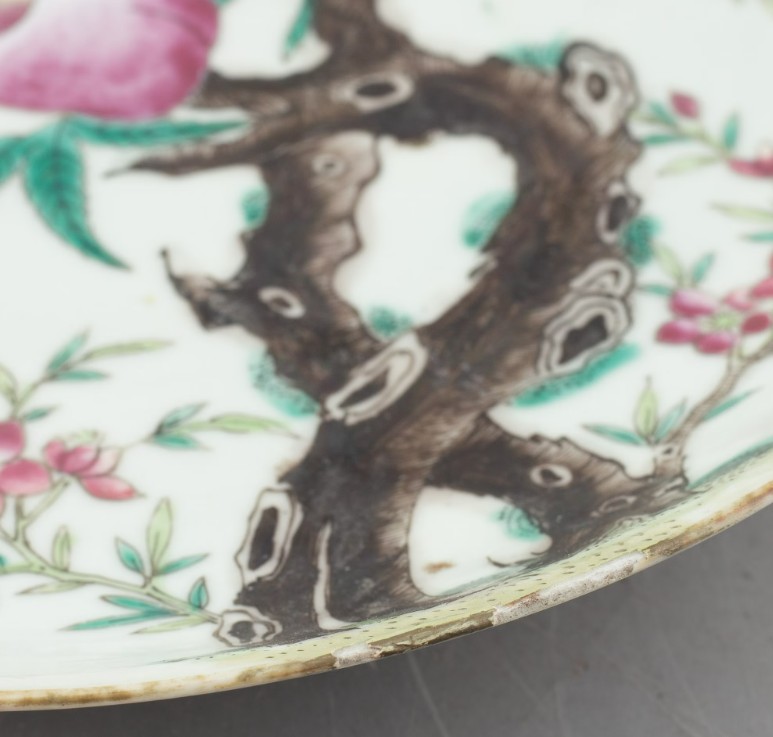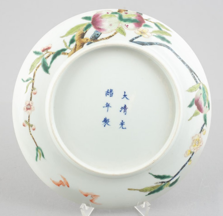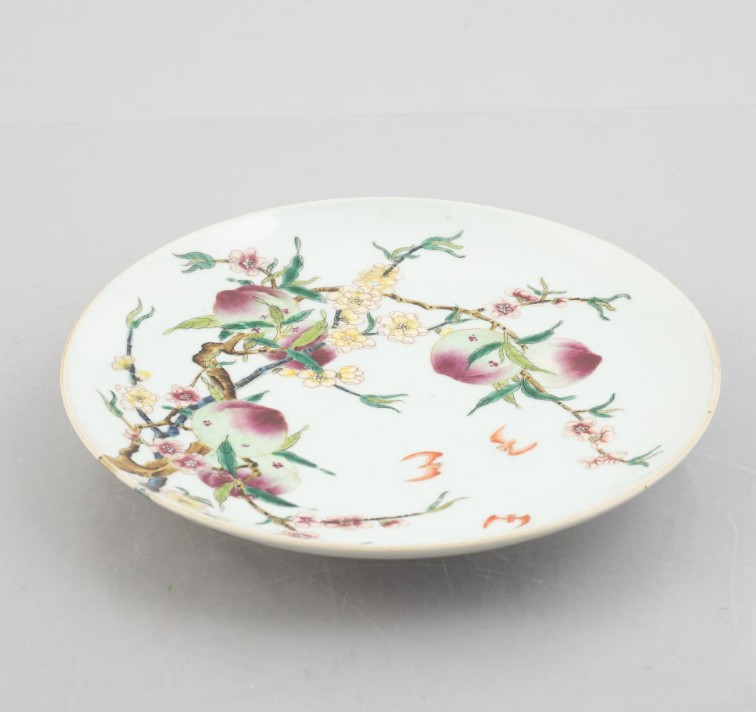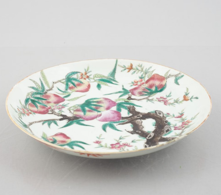 Decorated with famille rose featuring peach branches with fruits and flowers. Qianlong's and Guangxu's marks to bases but later. Diameter 23-24 cm. Wear. One with crack to the rim and chip.