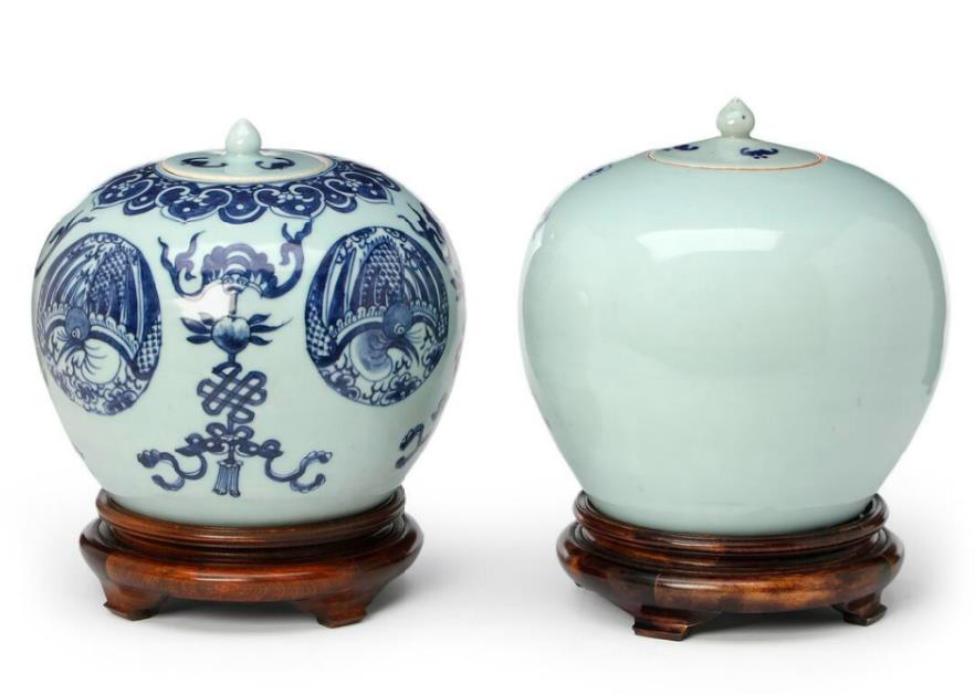Two Chinese jars and covers, Republic. Wooden stands enclosed. (2)
