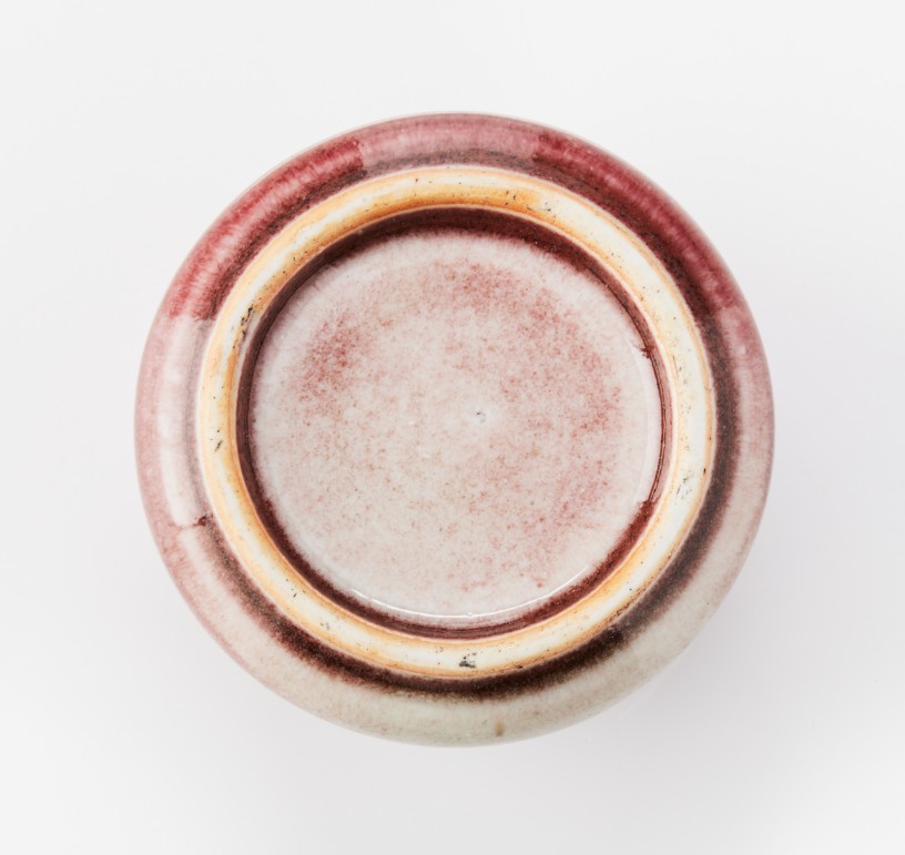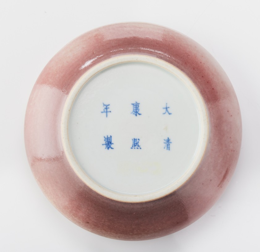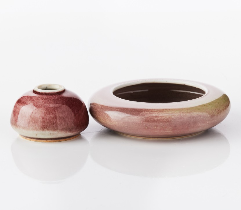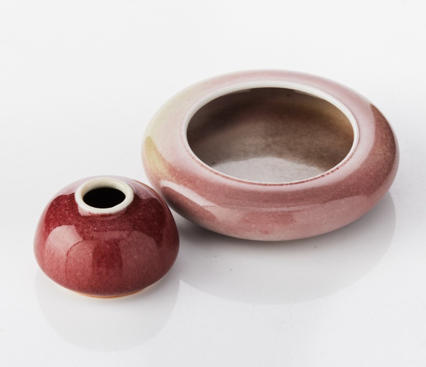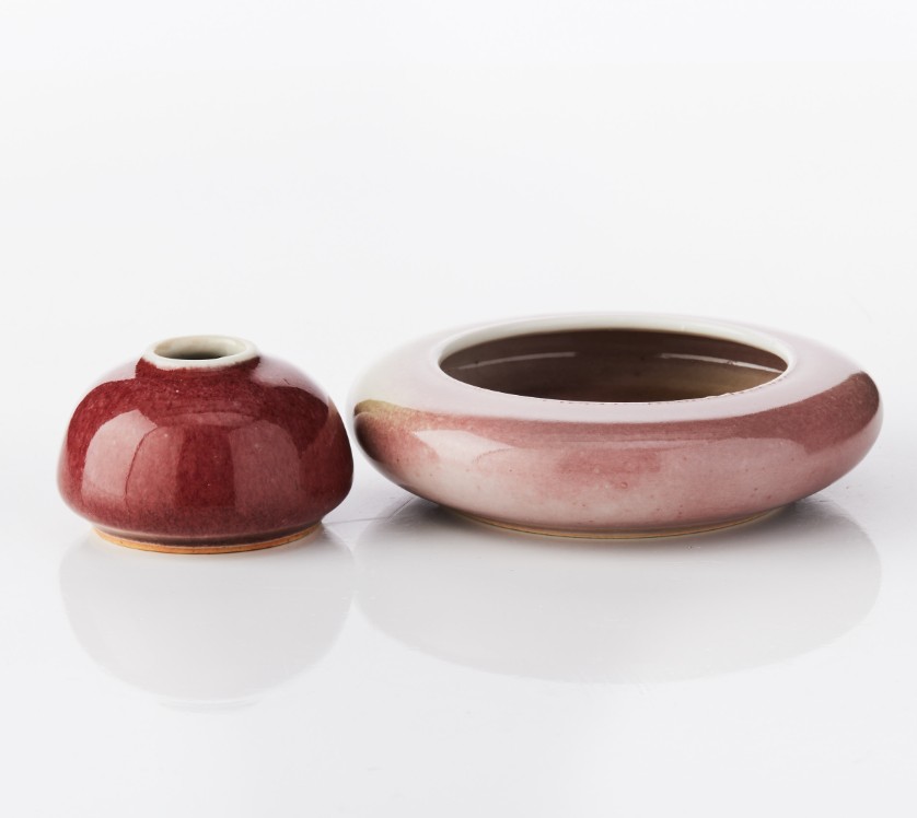 Two Chinese Monochrome Porcelain Brush Washers Of compressed form, the smaller set with a short neck, covered in a bright red glaze with pale areas; the larger covered in a pale peach bloom glaze, the base with a six-character mark of Kangxi in underglaze-blue. Period: 19th/20th century. Diameter: 5.8 and 12 cm.