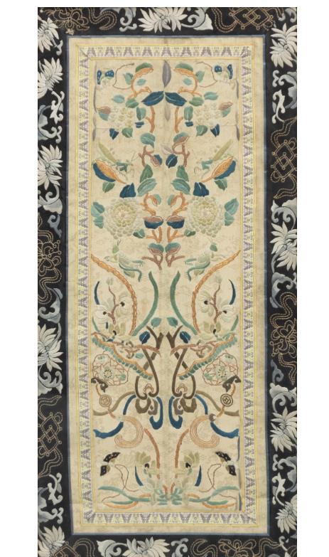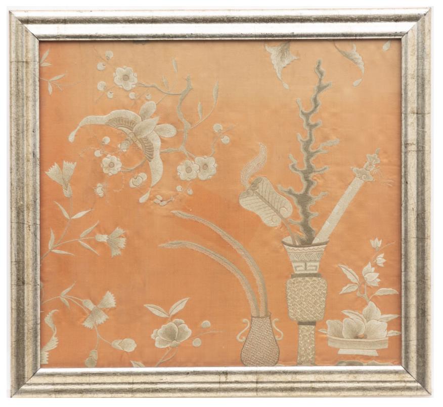 Motif of a butterfly and antiques to a peach-coloured background, frame 50 x 55 cm. Polychrome embroidery partly with metal thread, motif featuring flowers and butterflies to a light silk background with woven pattern, black silk mounting with embroidered flowers and auspicious objects. Frame 70.5 x 34.5 cm. Stains. Not examined out of the frames.