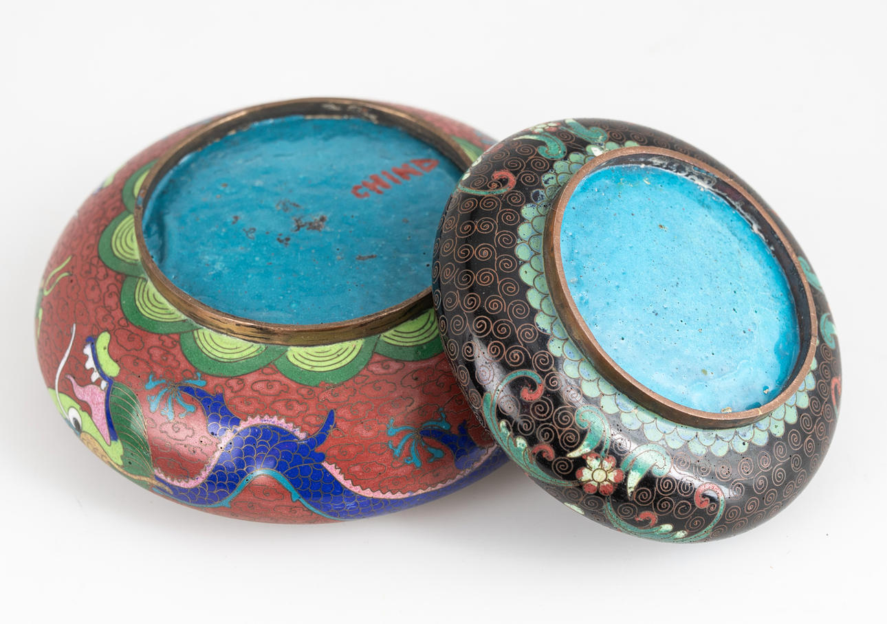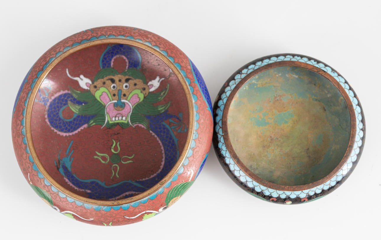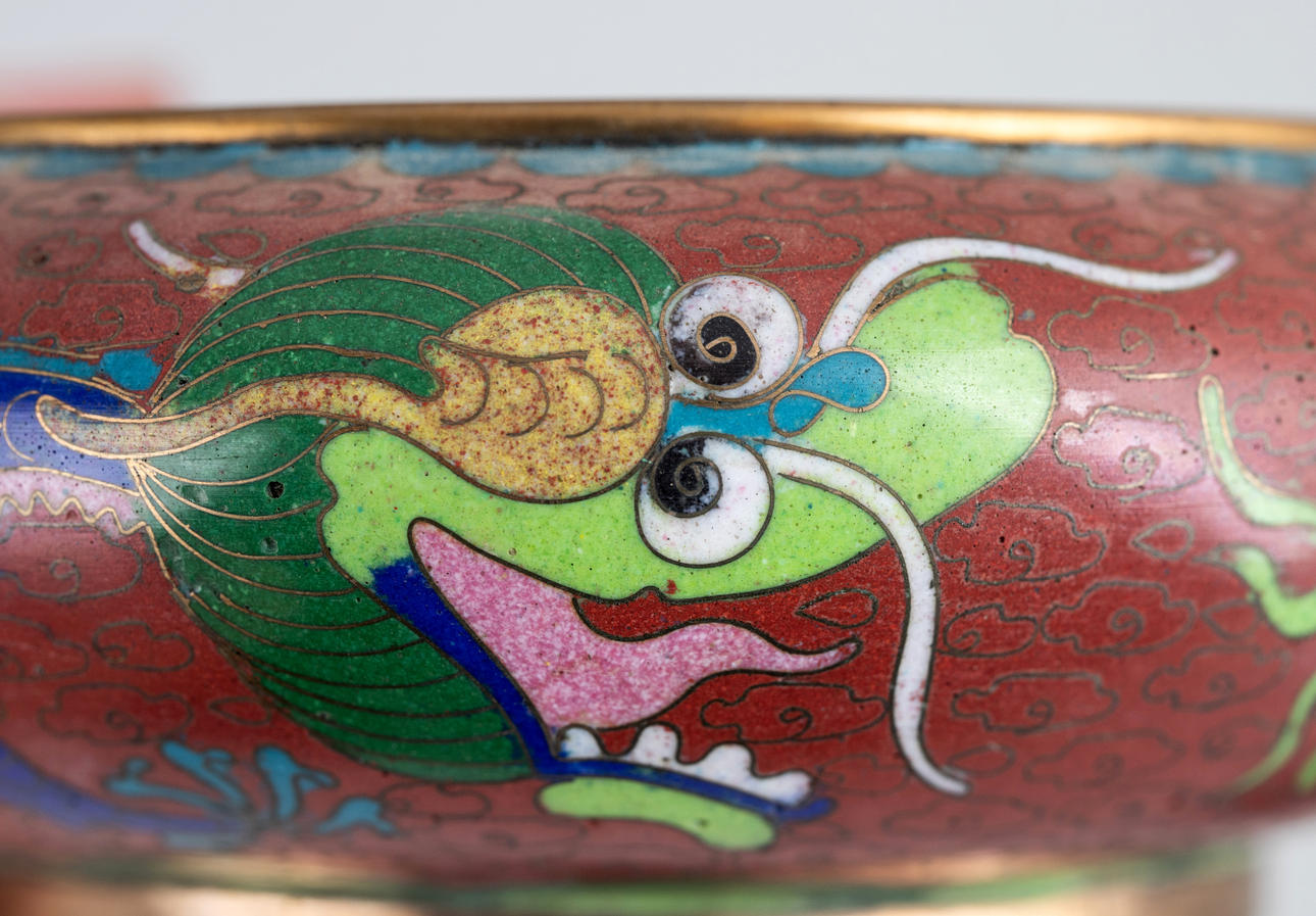 Enamelled copper. Dragons and flower images. Dm. cca 10.5/14 cm. Condition signs of wear. Corroded on the inside. 24803