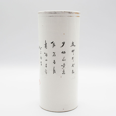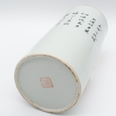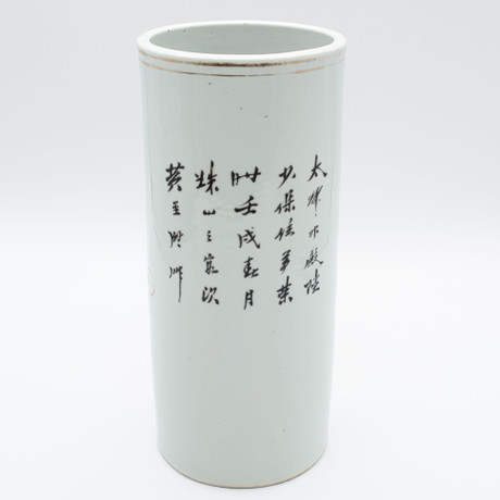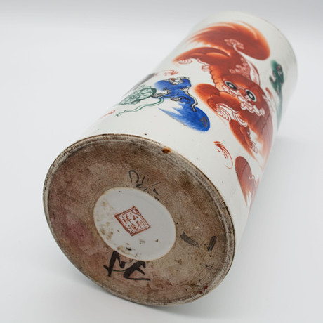 PLAYING LIONS WITH FABRIC BALL, GOLD EDGE, ZHUSHAN SCHOOL. Vase with two family rose hat stands. Red or red, green, blue and black lions playing with cloth ball, gold border. Around 1922. Subject:Lion with small lions Zhushan School. The style follows the "Eight Friends of Zhushan ('Pearl Hill')" school. Red stamp: Huang Jin x Made, Gong Lixiang Zao Vase with red lions: Height: approx. 28.8 cm Diameter: approx. 12.5 cm Vase with red, green, blue, black lions: Height: approx. 27.8 cm Diameter: approx. 12 cm Examiner: Dr. Dingwei Yin. Fitness report Good used condition. 14302